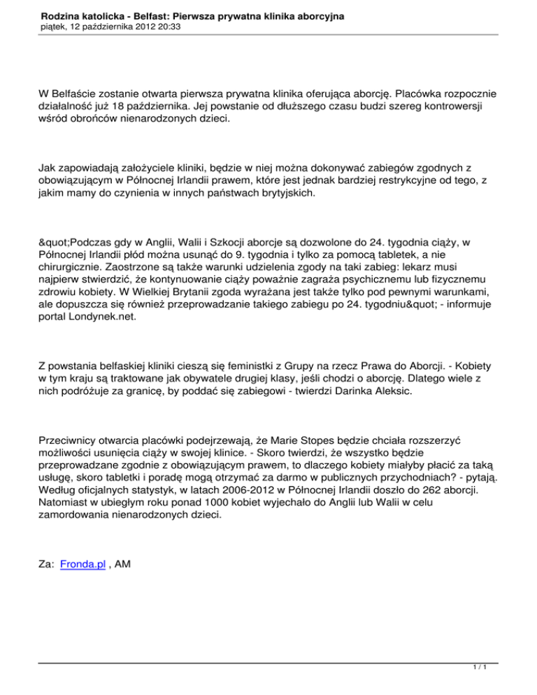Rodzina katolicka - Belfast: Pierwsza prywatna klinika aborcyjna