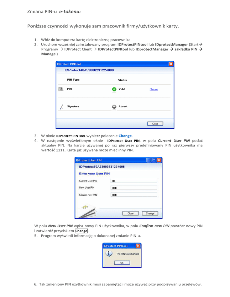 Zmiana PIN-u e-tokena: Poniższe czynności wykonuje sam pracownik firmy/użytkownik karty. 1. Włóż do komputera kartę elektroniczną pracownika. 2. Uruchom wcześniej zainstalowany program IDProtectPINtool lub IDprotectManager (Start Programy IDProtect Client IDProtectPINtool lub IDprotectManager zakładka PIN Manage ) 3. W oknie IDPROTECT PINTOOL wybierz polecenie Change. 4. W następnie wyświetlonym oknie IDPROTECT USER PIN, w polu Current User PIN podać aktualny PIN. Na karcie używanej po raz pierwszy predefiniowany PIN użytkownika ma wartość 1111. Karta już używana może mieć inny PIN. W polu New User PIN wpisz nowy PIN użytkownika, w polu Confirm new PIN powtórz nowy PIN i zatwierdź przyciskiem Change . 5. Program wyświetli informację o dokonanej zmianie PIN-u. 6. Tak zmieniony PIN użytkownik musi zapamiętać i może używać przy podpisywaniu przelewów.