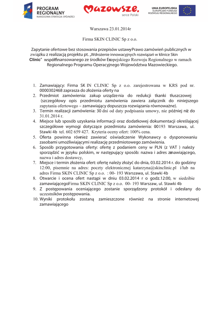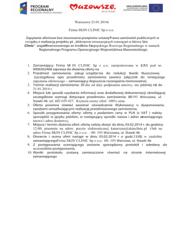 Warszawa 23.01.2014r Firma SKIN CLINIC Sp z o.o. Zapytanie ofertowe bez stosowania przepisów ustawy – Prawo zamówień publicznych w związku z realizacją projektu pt. „Wdrożenie innowacyjnych rozwiązań w klinice Skin ansowanego ze środków Europejskiego Rozwoju Regionalnego w ramach Clinic” Regionalnego Programu Operacyjnego Województwa Mazowieckiego. 1. Zamawiający: Firma SK IN CLINIC Sp z o.o. zarejestrowana w KRS pod nr. 0000302468 zaprasza do złożenia oferty na 2. Przedmiot zamówienia: zakup urządze nia do redukcji tkanki tłuszczowej (szczegółowy opis przedmiotu zamówienia zawiera załącznik do niniejszego zapytania ofertowego – zamawiający dopuszcza rozwiązania równoważne). 3. Termin realizacji zamówienia: 30 dni od daty podpisania umowy, nie później niż do 31.01.2014 r. 4. Miejsce lub sposób uzyskania informacji oraz dodatkowej dokumentacji określającej szczegółowe wymogi dotyczące przedmiotu zamówienia: 00 - 193 Warszawa, ul. Stawki 4b tel. 602 659 427. Kryteria oceny ofert: 100% cena. 5. Oferta powinna również zawierać oświadczenie Wykonawcy o dysponowaniu zasobami umożliwiającymi realizację przedmiotowego zamówienia. 6. Sposób przygotowania oferty: ofertę z podaniem ceny w PLN (z VAT ) należy sporządzić w języku polskim, w następujący sposób: nazwa i adres za mawiającego, nazwa i adres dostawcy, 7. Miejsce i termin złożenia ofert: ofertę należy złożyć do dnia, 03.02.2014 r. do godziny 12:00, pisemnie na adres: poczty elektronicznej [email protected] i/lub na adres Firma SKIN CLINIC Sp z o.o. : 00- 193 Warszawa, ul. Stawki 4b 8. Otwarcie i ocena ofert nastąpi w dniu 03.02.2014 r o godz.12:00, w siedzibie zamawiającegoFirma SKIN CLINIC Sp z o.o. 00- 193 Warszaw, ul. Stawki 4b 9. Z postępowania oceniającego zostanie sporządzony protokół i odesłany do uczestników postępowania. 10. Wyniki protokołu zostaną zamieszczone również na stronie internetowej zamawiającego Zapytanie ofertowe zawierające opis przedmiotu zakupu URZĄDZENIA DO REDUKCJI TKANKI TŁUSZCZOWEJ , które będzie zawierać następujące parametry i rozw iązania – zamawiający dopuszcza inne parametry i rozwiązania równoważne Urządzenie służące do wykonywania usługi Parametr Napięcie zasilające Rodzaj pracy Moc RF Częstotliwość RF System kontroli mocy TriLipo czas trwania impulsu Trilipo częstotliwość Trilipo amplituda pulsu Programy Waga Wymiary Redukcja tkanki tłuszczowej Dane 100-240 V TriLipo 50W 1 MHz Pulse width modulation (PWM) 20-400μs 0.78,1.56, 3.12, 6.25; 12.5; (Hz) 0 – 300 mA RF;TLP;PULSE 22 kg L57xW49xH127 cm (wraz z aplikatorami)