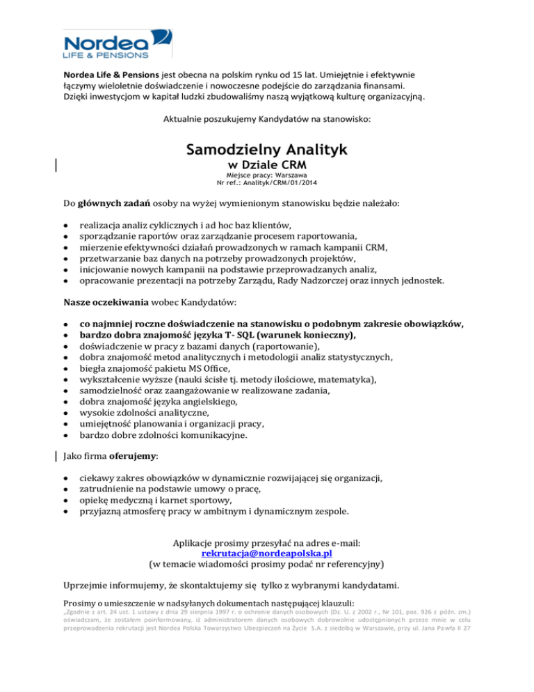 Nordea Life & Pensions jest obecna na polskim rynku od 15 lat. Umiejętnie i efektywnie łączymy wieloletnie doświadczenie i nowoczesne podejście do zarządzania finansami. Dzięki inwestycjom w kapitał ludzki zbudowaliśmy naszą wyjątkową kulturę organizacyjną. Aktualnie poszukujemy Kandydatów na stanowisko: Samodzielny Analityk w Dziale CRM Miejsce pracy: Warszawa Nr ref.: Analityk/CRM/01/2014 Do głównych zadań osoby na wyżej wymienionym stanowisku będzie należało: realizacja analiz cyklicznych i ad hoc baz klientów, sporządzanie raportów oraz zarządzanie procesem raportowania, mierzenie efektywności działań prowadzonych w ramach kampanii CRM, przetwarzanie baz danych na potrzeby prowadzonych projektów, inicjowanie nowych kampanii na podstawie przeprowadzanych analiz, opracowanie prezentacji na potrzeby Zarządu, Rady Nadzorczej oraz innych jednostek. Nasze oczekiwania wobec Kandydatów: co najmniej roczne doświadczenie na stanowisku o podobnym zakresie obowiązków, bardzo dobra znajomość języka T- SQL (warunek konieczny), doświadczenie w pracy z bazami danych (raportowanie), dobra znajomość metod analitycznych i metodologii analiz statystycznych, biegła znajomość pakietu MS Office, wykształcenie wyższe (nauki ścisłe tj. metody ilościowe, matematyka), samodzielność oraz zaangażowanie w realizowane zadania, dobra znajomość języka angielskiego, wysokie zdolności analityczne, umiejętność planowania i organizacji pracy, bardzo dobre zdolności komunikacyjne. Jako firma oferujemy: ciekawy zakres obowiązków w dynamicznie rozwijającej się organizacji, zatrudnienie na podstawie umowy o pracę, opiekę medyczną i karnet sportowy, przyjazną atmosferę pracy w ambitnym i dynamicznym zespole. Aplikacje prosimy przesyłać na adres e-mail: [email protected] (w temacie wiadomości prosimy podać nr referencyjny) Uprzejmie informujemy, że skontaktujemy się tylko z wybranymi kandydatami. Prosimy o umieszczenie w nadsyłanych dokumentach następującej klauzuli: „Zgodnie z art. 24 ust. 1 ustawy z dnia 29 sierpnia 1997 r. o ochronie danych osobowych (Dz. U. z 2002 r., Nr 101, poz. 926 z późn. zm.) oświadczam, że zostałem poinformowany, iż administratorem danych osobowych dobrowolnie udostępnionych przeze mnie w celu przeprowadzenia rekrutacji jest Nordea Polska Towarzystwo Ubezpieczeo na Życie S.A. z siedzibą w Warszawie, przy ul. Jana Pa wła II 27 oraz Nordea Powszechne Towarzystwo Emerytalne S.A. z siedzibą w Warszawie, przy ul. Jana Pawła II 27. Poinformowano mnie o prawie dostępu do treści danych oraz ich poprawiania. Poinformowano mnie, że dane osobowe nie będą przekazywane innym odbiorcom.”