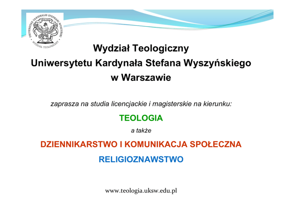 Wydział Teologiczny Uniwersytetu Kardynała Stefana Wyszyńskiego w Warszawie zaprasza na studia licencjackie i magisterskie na kierunku: TEOLOGIA a także DZIENNIKARSTWO I KOMUNIKACJA SPOŁECZNA RELIGIOZNAWSTWO www.teologia.uksw.edu.pl t e o l o g i a – wydział z przyszłością Studia na kierunku RELIGIOZNAWSTWO odbywają się w kampusie UKSW przy ul. Dewajtis 5 Uczelnia mieści się w sercu malowniczego rezerwatu – Lasu Bielańskiego! (tramwaje 6, 17, autobusy 103, 121, 181, a na końcu – spacer przez las…) www.teologia.uksw.edu.pl r e l i g i o z n a w s t w o – na Wydziale Teologicznym kierunek RELIGIOZNAWSTWO to: • tolerancja • dialog • poszanowanie odmienności www.teologia.uksw.edu.pl r e l i g i o z n a w s t w o – na Wydziale Teologicznym kierunek RELIGIOZNAWSTWO - wśród studiowanych zagadnień m. in.: • geografia religii • antropologia religii • katolicyzm, prawosławie, protestantyzm • ekumenizm • filozofia, socjologia religii • judaizm, islam, buddyzm, hinduizm • dawne religie Słowian • tradycyjne religie plemienne • nowe ruchy religijne • dialog międzyreligijny www.teologia.uksw.edu.pl r e l i g i o z n a w s t w o – na Wydziale Teologicznym kierunek RELIGIOZNAWSTWO przygotowuje do pracy w rozmaitych instytucjach oraz ośrodkach zajmujących się: • podejmowaniem działań i świadczeniem usług edukacyjno-kulturowych Dzień Bajramowy – sztuka Ebru • powiązaniem religii z życiem społecznym, gospodarczym i politycznym • komunikacją międzykulturową i miedzyreligijną, pracą z imigrantami www.teologia.uksw.edu.pl Teologia - wydział z przyszłością! [Zdjęcia pochodzą ze zbiorów własnych oraz portali http://commons.wikimedia.org oraz http://www.dreamstime.com/] www.teologia.uksw.edu.pl