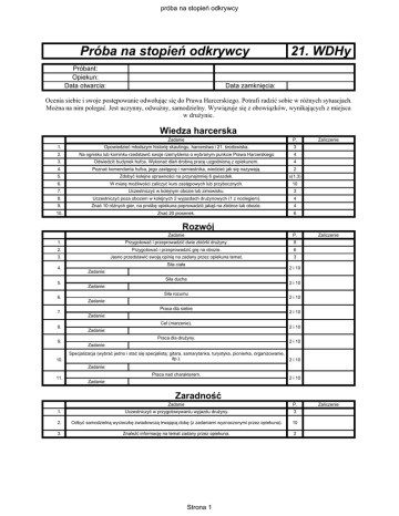 próba na stopień odkrywcy Próba na stopień odkrywcy Próbant: Opiekun: Data otwarcia: 21. WDHy Data zamknięcia: Ocenia siebie i swoje postępowanie odwołując się do Prawa Harcerskiego. Potrafi radzić sobie w różnych sytuacjach. Można na nim polegać. Jest uczynny, odważny, samodzielny. Wywiązuje się z obowiązków, wynikających z miejsca w drużynie. Wiedza harcerska Zadanie P. 1. Opowiedzieć młodszym historię skautingu, harcerstwa i 21. środowiska. 3 2. Na ognisku lub kominku rzedstawić swoje rzemyślenia o wybranym punkcie Prawa Harcerskiego 4 3. Odwiedzić budynek hufca. Wykonać dlań drobną pracę uzgodnioną z opiekunem. 4 4. Poznać komendanta hufca, jego zastępcę i namiestnika, wiedzieć jak się nazywają. 2 5. Zdobyć kolejne sprawności na przynajmniej 6 gwiazdek. x(1,3) 6. W miarę możliwości zaliczyć kurs zastępowych lub przybocznych. 10 7. Uczestniczyć w kolejnym obozie lub zimowisku. 3 8. Uczestniczyć poza obozem w kolejnych 2 wyjazdach drużynowych (1 z noclegiem). 4 9. Znać 10 różnych gier, na prośbę opiekuna poprowadzić jakąś na zbiórce lub obozie. 4 10. Znać 20 piosenek. 6 Zaliczenie Rozwój Zadanie P. Przygotować i przeprowadzić dwie zbiórki drużyny. 8 2. Przygotować i przeprowadzić grę na obozie. 6 3. Jasno przedstawić swoją opinię na zadany przez opiekuna temat. 3 1. 4. 5. 6. 7. 8. 9. 10. Siła ciała Zaliczenie 2 i 10 Zadanie: Siła ducha 2 i 10 Zadanie: Siła rozumu Zadanie: Praca dla siebie Zadanie: Cel (marzenie). Zadanie: Praca dla drużyny. Zadanie: Specjalizacja (wybrać jedno i stać się specjalistą: gitara, samarytanka, turystyka, pionierka, organizowanie, itp.). 2 i 10 2 i 10 2 i 10 2 i 10 2 i 10 Zadanie: 11. Praca nad charakterem. Zadanie: 2 i 10 Zaradność Zadanie P. 1. Uczestniczyć w przygotowywaniu wyjazdu drużyny. 3 2. Odbyć samodzielną wycieczkę zwiadowczą trwającą dobę (z zadaniami wyznaczonymi przez opiekuna). 10 3. Znaleźć informację na temat zadany przez opiekuna. 2 Strona 1 Zaliczenie próba na stopień odkrywcy Techniki harcerskie Zadanie P. Pokazać, że się umie zatamować krwotok (symulacja). 2 2. Usztywnić kończynę i wiedzieć kiedy jest to konieczne. 2 3. Umieć rozoznać i wiedzieć jak postępować w przypadku wstrząsu. 2 4. Nauczyć młodszych, jak należy wzywać pomoc. 2 5. Wiedzieć, jak zachować się w przypadku, gdy helikopter uczestniczy w akcji ratowniczej.. 2 6. Wiedzieć jak zachować się w przypadku wypadku samochodowego. 2 7. Nałożyć kołnierz ortopedyczny. 2 8. Potrafić sprawdzić oddech i tętno. 2 9. Wykonać (symulacja) ogólne badanie poszkodowanego. 3 10. Zaliczyć symulację 5 11. Zawsze mieć przy sobie własną apteczkę pierwszej pomocy. 2 1. Uczestniczyć w nocnej grze terenowej. 1 2. Znać zasady poruszania się w górach. 2 3. Pokazać na mapie Polski wszystkie główne regiony oraz 15 miejsc, w których się było. 2 4. Sporządzić szkic terenu wielkości 500m x 500m. 4 5. Samodzielnie trafić z mapą w nocy do wyznaczonego celu odległego o 3 km. 4 6. Zaznaczyć przebytą trasę na mapie po fakcie, nieposiadając mapy podczas marszu. 4 7. Znać lokalizację większych miast w Polsce na mapie. 2 8. Znać lokalizację większości krajów świata na mapie. 2 9. Przejść jednego dnia 35 km. 4 10. Samodzielnie zmierzyć wysokość drzewa. 3 11. Zmierzyć szerokość jeziora. 3 12. Poprawnie oceniać odległości “na oko”. 2 1. Przeprowadzić zajęcia z rozróżniania drzew dla młodszych. 4 2. Rozpoznać na zdjęciach lub w rzeczywistości 5 gatunków roślin lub grzybów trujących. 3 3. Rozpoznać po głosie lub wyglądzie 10 gatunków ptaków. 4 4. Wymienić 20 Parków Narodowych i powiedzieć, co w każdym z nich się chroni. 2 5. Znaleźć i rozpoznać 7 gatunków roślin kwitnących. 3 6. Rozoznać ślady 4 zwierząt 2 7. Rozpoznać 5 gatunków krzewów występujących w poszyciu leśnym. 4 8. Rozróżniać typy lasów (np.: grąd, bór świeży, dąbrowa świetlista itp.) 3 9. Rozpoznać 4 gatunki grzybów jadalnych (przynajmniej jeden w rzeczywistości, reszta na zdjęciu). 2 1. Samodzielnie ułożyć ognisko obrzędowe. 4 2. Samodzielnie obsłużyć kuchenkę benzynową, zrobić na niej kisiel. 2 3. Zbudować na obozie srzęt według własnego projektu. 4 4. Umieć posługiwać się babą i dużą siekierą – zaostrzyć i wbić kołek. 3 5. Samodzielnie zbudować prycz (wraz z ostrzeniem i wbijaniem kołków). 4 6. Rozbić dziesiątkę wraz z zastępem w 30 minut. 4 7. Zbdować samodzielnie szałas o prawie nieprzemakalnym pokryciu. 4 8. Znać 12 węzłów. 3 9. Regularnie brać udział w pracach magazynowych. 2 1. Umieć alfabet Morse'a wraz z nadawaniem i odbieraniem chorągiewkowym. 3 2. Podłączyć telefon polowy i centralkę. Obsługiwać centralkę. 2 3. Wiedzieć, co oznaczają słowa analogowy i cyfrowy, umieć zapisać zadaną liczbą w układzie dwójkowym. 2 4. Porozumiewać się przez cały dzień jedynie językiem migowym. 3 5. Znać zasady działania anteny. 2 6. Stworzyć interaktywną stronę internetową. 4 7. Skorzystać z wyszukiwarki internetowej do znalezienia zadanej przez opiekuna informacji. 1 8. Komunikować opiekunowi wykonane zadania przy pomocy poczty elektronicznej. 2 Łączność Pionierka Przyrodoznastwo Terenoznastwo Samarytanka 1. Strona 2 Zaliczenie