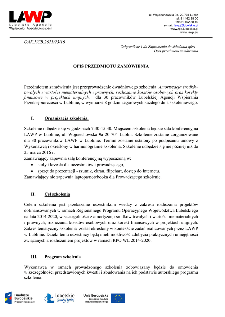 ul. Wojciechowska 9a, 20-704 Lublin tel. 81 462 38 00 fax 81 462 38 40 e-mail: [email protected] www.rpo.lubelskie.pl www.lawp.eu OAK.KCB.2621/23/16 Załącznik nr 1 do Zaproszenia do składania ofert – Opis przedmiotu zamówienia OPIS PRZEDMIOTU ZAMÓWIENIA Przedmiotem zamówienia jest przeprowadzenie dwudniowego szkolenia Amortyzacja środków trwałych i wartości niematerialnych i prawnych, rozliczanie kosztów osobowych oraz korekty finansowe w projektach unijnych, dla 30 pracowników Lubelskiej Agencji Wspierania Przedsiębiorczości w Lublinie, w wymiarze 8 godzin zegarowych każdego dnia szkoleniowego. I. Organizacja szkolenia. Szkolenie odbędzie się w godzinach 7:30-15:30. Miejscem szkolenia będzie sala konferencyjna LAWP w Lublinie, ul. Wojciechowska 9a 20-704 Lublin. Szkolenie zostanie zorganizowane dla 30 pracowników LAWP w Lublinie. Termin zostanie ustalony po podpisaniu umowy z Wykonawcą i określony w harmonogramie szkolenia. Szkolenie odbędzie się nie później niż do 25 marca 2016 r. Zamawiający zapewnia salę konferencyjną wyposażoną w: stoły i krzesła dla uczestników i prowadzącego, sprzęt do prezentacji - rzutnik, ekran, flipchart, dostęp do Internetu. Zamawiający nie zapewnia laptopa/notebooka dla Prowadzącego szkolenie. II. Cel szkolenia Celem szkolenia jest przekazanie uczestnikom wiedzy z zakresu rozliczania projektów dofinansowanych w ramach Regionalnego Programu Operacyjnego Województwa Lubelskiego na lata 2014-2020, w szczególności z amortyzacji środków trwałych i wartości niematerialnych i prawnych, rozliczania kosztów osobowych oraz korekt finansowych w projektach unijnych. Zakres tematyczny szkolenia został określony w kontekście zadań realizowanych przez LAWP w Lublinie. Dzięki temu uczestnicy będą mieli możliwość zdobycia praktycznych umiejętności związanych z rozliczaniem projektów w ramach RPO WL 2014-2020. III. Program szkolenia Wykonawca w ramach prowadzonego szkolenia zobowiązany będzie do omówienia w szczególności przedstawionych kwestii i zbudowania na ich podstawie autorskiego programu szkolenia: ul. Wojciechowska 9a, 20-704 Lublin tel. 81 462 38 00 fax 81 462 38 40 e-mail: [email protected] www.rpo.lubelskie.pl www.lawp.eu 1. Amortyzacja środków trwałych i wartości niematerialnych i prawnych w praktyce: metody amortyzacji sposoby obliczania i księgowania sposoby amortyzacji zakupionej wiedzy i patentów amortyzacja jednorazowa, przyśpieszona, a pomoc de minimis z tego tytułu (Urząd Skarbowy)-podwójne finansowanie. 2. Rozliczanie kosztów osobowych Sposoby rozliczania w zależności od rodzaju od rodzaju umowy (podatek dochodowy, ZUS, pozostałe pochodne), Wynagrodzenie właścicieli –uzyskiwanie zaświadczenia z Urzędu Skarbowego. 3. Korekty finansowe w projektach unijnych różnice w podejściu do korekt finansowych pomiędzy perspektywą 2007-2013, a 20142020 zasady zwrotu środków korekta za wykorzystanie środków niezgodnie z przeznaczeniem, niezgodnie z procedurami zwrot środków a pomniejszenie kolejnej płatności. Podany został minimalny zakres programowy wskazując tym samym na zagadnienia, które muszą zostać podjęte podczas szkolenia. Zamawiający wymaga by Prowadzący szkolenie przedstawił i omówił podstawy prawne obejmujące ww. zakres tematyczny szkolenia. Wykonawca może przedstawić autorski program szkolenia, zawierający niezbędne minimum, rozszerzając dowolnie zakres poszczególnych zagadnień oraz dodając własne moduły tematyczne. IV. Metody i techniki, jakie wykładowca zobowiązany jest zastosować podczas szkolenia: Szkolenie powinno być prowadzone przede wszystkim aktywnymi metodami – warsztaty angażującymi wszystkich uczestników. Formuła szkolenia uwzględnia w szerokim zakresie dyskusję, ćwiczenia, analizę przypadków (z zakresu realizowanych przez LAWP zadań). V. Obowiązki Wykonawcy: 1. Przeprowadzenia dwudniowego szkolenia dla 30 pracowników LAWP w Lublinie, we wskazanym przez Zamawiającego terminie i miejscu. 1) Wymagania dotyczące Wykonawcy/firmy szkoleniowej: ul. Wojciechowska 9a, 20-704 Lublin tel. 81 462 38 00 fax 81 462 38 40 e-mail: [email protected] www.rpo.lubelskie.pl www.lawp.eu 2. 3. 4. 5. 6. realizacja w ciągu dwóch ostatnich lat (przed dniem złożenia oferty) przynajmniej 3 szkoleń dla minimum 25 osób każde ze szkoleń, w tym jednego z zakresu realizacji i rozliczania projektów w ramach RPO na latach 2014-2020. 2) Wymagania dotyczące trenera: trener przeprowadzający szkolenie powinien legitymować się wyższym wykształceniem, doświadczenie w realizacji szkoleń - przeprowadzenie w ciągu dwóch ostatnich lat (przed dniem złożenia oferty) minimum 3 szkoleń, w tym przynajmniej jednego z zakresu realizacji i rozliczania projektów w ramach RPO na lata 2014-2020. znajomość tematyki z zakresu realizacji i rozliczania projektów w ramach RPO na lata 2007-2013 oraz 2014-2020, znajomość dokumentów wykonawczych RPO WL 2014-2020. (Informacje na temat wykształcenia i doświadczenia trenera w prowadzeniu szkoleń należy zawrzeć we wzorze formularza cenowego, a na dowód wykonania usług szkoleniowych należy załączyć dowody potwierdzające należyte wykonanie tych usług-referencje. Dokumenty te powinny dotyczyć osobiście trenera, a także firmy szkoleniowej). W terminie 2 dni od dnia podpisania umowy, Zamawiający przedstawi Wykonawcy dokumenty w oparciu o które ma przeprowadzona praktyczna część szkolenia. 3 dni od otrzymania ww. dokumentów Wykonawca przedstawi szczegółowy plan szkolenia. Zamawiający w ciągu 2 dni akceptuje plan lub dokonuje jego modyfikacji. Przygotowanie materiałów szkoleniowych opatrzonych obowiązującymi logotypami skrypt lub skoroszyt z prezentacją multimedialną/ materiałami w wersji papierowej oraz multimedialnej zapisanej na płycie CD-R w ilości odpowiadającej liczbie szkolonych. Wydanie świadectw/dyplomów/certyfikatów ukończenia szkolenia dla każdego 