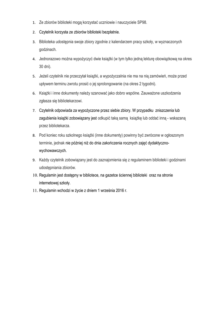 1. Ze zbiorów biblioteki mogą korzystać uczniowie i nauczyciele SP98. 2. Czytelnik korzysta ze zbiorów biblioteki bezpłatnie. 3. Biblioteka udostępnia swoje zbiory zgodnie z kalendarzem pracy szkoły, w wyznaczonych godzinach. 4. Jednorazowo można wypożyczyć dwie książki (w tym tylko jedną lekturę obowiązkową na okres 30 dni). 5. Jeżeli czytelnik nie przeczytał książki, a wypożyczalnia nie ma na nią zamówień, może przed upływem terminu zwrotu prosić o jej sprolongowanie (na okres 2 tygodni). 6. Książki i inne dokumenty należy szanować jako dobro wspólne. Zauważone uszkodzenia zgłasza się bibliotekarzowi. 7. Czytelnik odpowiada za wypożyczone przez siebie zbiory. W przypadku zniszczenia lub zagubienia książki zobowiązany jest odkupić taką samą książkę lub oddać inną - wskazaną przez bibliotekarza. 8. Pod koniec roku szkolnego książki (inne dokumenty) powinny być zwrócone w ogłoszonym terminie, jednak nie później niż do dnia zakończenia rocznych zajęć dydaktycznowychowawczych. 9. Każdy czytelnik zobowiązany jest do zaznajomienia się z regulaminem biblioteki i godzinami udostępniania zbiorów. 10. Regulamin jest dostępny w bibliotece, na gazetce ściennej biblioteki oraz na stronie internetowej szkoły. 11. Regulamin wchodzi w życie z dniem 1 września 2016 r.