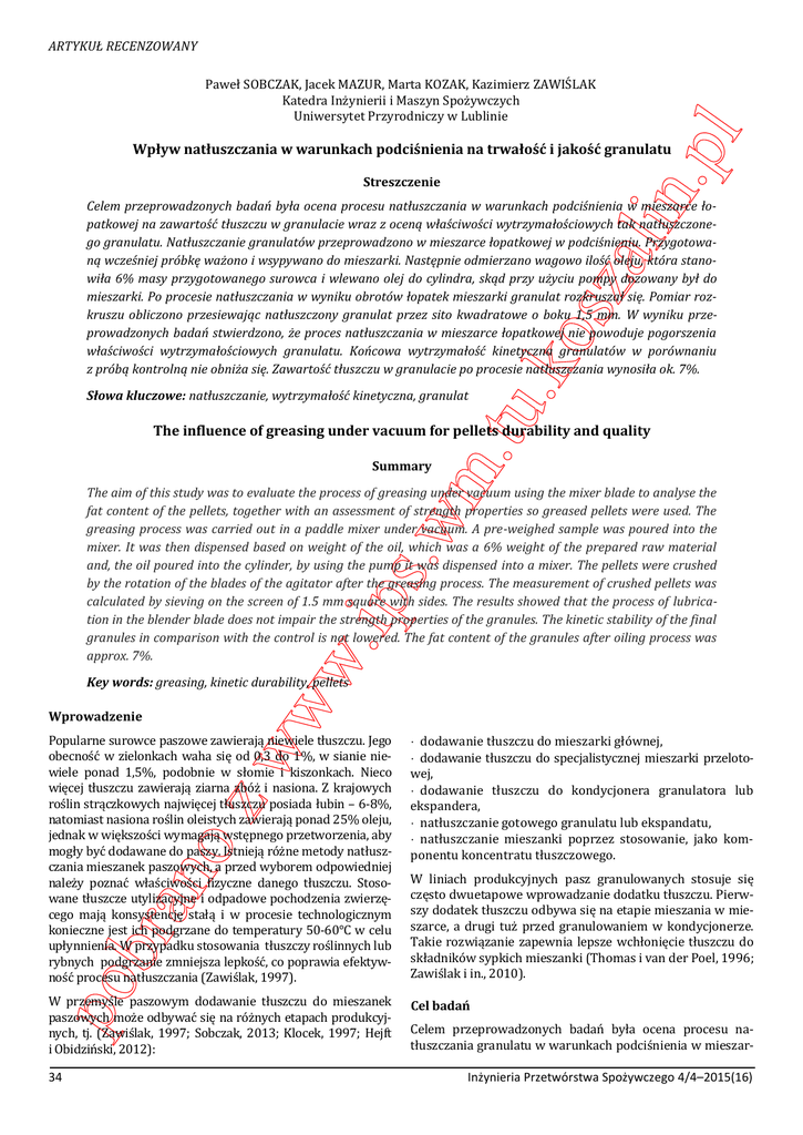 ARTYKUŁ RECENZOWANY .pl Paweł SOBCZAK, Jacek MAZUR, Marta KOZAK, Kazimierz ZAWIŚLAK Katedra Inżynierii i Maszyn Spożywczych Uniwersytet Przyrodniczy w Lublinie Wpływ natłuszczania w warunkach podciśnienia na trwałość i jakość granulatu lin Streszczenie .w m. tu. ko sza Celem przeprowadzonych badań była ocena procesu natłuszczania w warunkach podciśnienia w mieszarce łopatkowej na zawartość tłuszczu w granulacie wraz z oceną właściwości wytrzymałościowych tak natłuszczonego granulatu. Natłuszczanie granulatów przeprowadzono w mieszarce łopatkowej w podciśnieniu. Przygotowaną wcześniej próbkę ważono i wsypywano do mieszarki. Następnie odmierzano wagowo ilość oleju, która stanowiła 6% masy przygotowanego surowca i wlewano olej do cylindra, skąd przy użyciu pompy dozowany był do mieszarki. Po procesie natłuszczania w wyniku obrotów łopatek mieszarki granulat rozkruszał się. Pomiar rozkruszu obliczono przesiewając natłuszczony granulat przez sito kwadratowe o boku 1,5 mm. W wyniku przeprowadzonych badań stwierdzono, że proces natłuszczania w mieszarce łopatkowej nie powoduje pogorszenia właściwości wytrzymałościowych granulatu. Końcowa wytrzymałość kinetyczna granulatów w porównaniu z próbą kontrolną nie obniża się. Zawartość tłuszczu w granulacie po procesie natłuszczania wynosiła ok. 7%. Słowa kluczowe: natłuszczanie, wytrzymałość kinetyczna, granulat The influence of greasing under vacuum for pellets durability and quality Summary w. ips The aim of this study was to evaluate the process of greasing under vacuum using the mixer blade to analyse the fat content of the pellets, together with an assessment of strength properties so greased pellets were used. The greasing process was carried out in a paddle mixer under vacuum. A pre-weighed sample was poured into the mixer. It was then dispensed based on weight of the oil, which was a 6% weight of the prepared raw material and, the oil poured into the cylinder, by using the pump it was dispensed into a mixer. The pellets were crushed by the rotation of the blades of the agitator after the greasing process. The measurement of crushed pellets was calculated by sieving on the screen of 1.5 mm square with sides. The results showed that the process of lubrication in the blender blade does not impair the strength properties of the granules. The kinetic stability of the final granules in comparison with the control is not lowered. The fat content of the granules after oiling process was approx. 7%. ww Key words: greasing, kinetic durability, pellets Wprowadzenie dodawanie tłuszczu do mieszarki głównej, dodawanie tłuszczu do specjalistycznej mieszarki przelotowej, dodawanie tłuszczu do kondycjonera granulatora lub ekspandera, natłuszczanie gotowego granulatu lub ekspandatu, natłuszczanie mieszanki poprzez stosowanie, jako komponentu koncentratu tłuszczowego. W przemyśle paszowym dodawanie tłuszczu do mieszanek paszowych może odbywać się na różnych etapach produkcyjnych, tj. (Zawiślak, 1997; Sobczak, 2013; Klocek, 1997; Hejft i Obidziński, 2012): Cel badań po bra no z Popularne surowce paszowe zawierają niewiele tłuszczu. Jego obecność w zielonkach waha się od 0,3 do 1%, w sianie niewiele ponad 1,5%, podobnie w słomie i kiszonkach. Nieco więcej tłuszczu zawierają ziarna zbóż i nasiona. Z krajowych roślin strączkowych najwięcej tłuszczu posiada łubin – 6-8%, natomiast nasiona roślin oleistych zawierają ponad 25% oleju, jednak w większości wymagają wstępnego przetworzenia, aby mogły być dodawane do paszy. Istnieją różne metody natłuszczania mieszanek paszowych, a przed wyborem odpowiedniej należy poznać właściwości fizyczne danego tłuszczu. Stosowane tłuszcze utylizacyjne i odpadowe pochodzenia zwierzęcego mają konsystencję stałą i w procesie technologicznym konieczne jest ich podgrzane do temperatury 50-60°C w celu upłynnienia. W przypadku stosowania tłuszczy roślinnych lub rybnych podgrzanie zmniejsza lepkość, co poprawia efektywność procesu natłuszczania (Zawiślak, 1997). 34 W liniach produkcyjnych pasz granulowanych stosuje się często dwuetapowe wprowadzanie dodatku tłuszczu. Pierwszy dodatek tłuszczu odbywa się na etapie mieszania w mieszarce, a drugi tuż przed granulowaniem w kondycjonerze. Takie rozwiązanie zapewnia lepsze wchłonięcie tłuszczu do składników sypkich mieszanki (Thomas i van der Poel, 1996; Zawiślak i in., 2010). Celem przeprowadzonych badań była ocena procesu natłuszczania granulatu w warunkach podciśnienia w mieszarInżynieria Przetwórstwa Spożywczego 4/4–2015(16) Paweł SOBCZAK, Jacek MAZUR, Marta KOZAK, Kazimierz ZAWIŚLAK Materiałem badawczym były dwa rodzaje granulatów, tj.: granulat o średnicy 4 mm (oznaczany w badaniach symbolem GC), granulat o średnicy 12 mm (oznaczany w badaniach symbolem GG), (1) R – ilość odkruszonego granulatu, [%], MR – masa rozkruszu po natłuszczaniu, [g]; MS – masa surowca poddana procesowi natłuszczania, [g]. .w m. tu. ko sza Odpowiednio granulaty po natłuszczaniu oznaczano symbolem GCN oraz GGN. Zawartość tłuszczu w badanych granulatach wynosiła: dla GC – 2,8%, a dla GG – 2,6%. Skład surowcowy badanych mieszanek był następujący: GC: surowce zbożowe – 70%, śruty poekstrakcyjne 27%, dodatki mineralne i witaminowe – 3%, GG: surowce zbożowe – 65%, śruty poekstrakcyjne – 30%, dodatki mineralno-witaminowe – 5%. Zakres badań obejmował: Przygotowanie odpowiednich porcji granulatu (odseparowanie frakcji poniżej 1,5 mm), Natłuszczanie granulatu w mieszarce łopatkowej w podciśnieniu, Pomiar ilości rozkruszonego surowca po natłuszczaniu (odseparowanie na sicie o wymiarze oczek 1,5 mm), Pomiar wytrzymałości kinetycznej Pfosta granulatów przed i po procesie natłuszczania, Pomiar zawartości tłuszczu w granulacie po procesie natłuszczania. MR 100% MS R .pl Materiał badawczy i metodyka bada