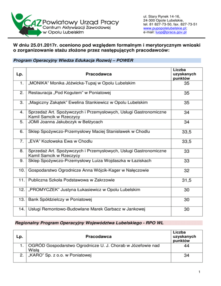 ul. Stary Rynek 14-16, 24-300 Opole Lubelskie, tel. 81 827-73-50, fax. 827-73-51 www.pupopolelubelskie.pl; e-mail: [email protected] W dniu 25.01.2017r. oceniono pod względem formalnym i merytorycznym wnioski o zorganizowanie stażu złożone przez następujących pracodawców: Program Operacyjny Wiedza Edukacja Rozwój – POWER Lp. Pracodawca Liczba uzyskanych punktów 1. „MONIKA” Monika Jóźwicka-Tupaj w Opolu Lubelskim 35 2. Restauracja „Pod Kogutem” w Poniatowej 35 3. „Magiczny Zakątek” Ewelina Stankiewicz w Opolu Lubelskim 35 4. 34 5. Sprzedaż Art. Spożywczych i Przemysłowych, Usługi Gastronomiczne Kamil Samcik w Rzeczycy JOMI Joanna Jakubczyk w Bełżycach 6. Sklep Spożywczo-Przemysłowy Maciej Stanisławek w Chodlu 33,5 7. „EVA” Kozłowska Ewa w Chodlu 33,5 8. Sprzedaż Art. Spożywczych i Przemysłowych, Usługi Gastronomiczne Kamil Samcik w Rzeczycy Sklep Spożywczo-Przemysłowy Luiza Wojdaszka w Łaziskach 9. 10. Gospodarstwo Ogrodnicze Anna Wójcik-Kager w Nałęczowie 11. Publiczna Szkoła Podstawowa w Zakrzowie 34 33 33 32 31,5 12. „PROMYCZEK” Justyna Łukasiewicz w Opolu Lubelskim 30 13. Bank Spółdzielczy w Poniatowej 30 14. Usługi Remontowo-Budowlane Marek Garbacz w Jankowej 30 Regionalny Program Operacyjny Województwa Lubelskiego - RPO WL Lp. 1. 2. Pracodawca OGRÓD Gospodarstwo Ogrodnicze U. J. Chorab w Józefowie nad Wisłą „KARO” Sp. z o.o. w Poniatowej Liczba uzyskanych punktów 44 34 1 3. Urząd Miejski w Poniatowej 4. Zespół Szkół Publicznych w Zagłobie 5. Opolskie Przedsiębiorstwo Komunalne Sp. z o.o. w Opolu Lubelskim 30 6. Dariusz Chęć w Dębinach 30 7. Pasmanteria Teresa Osojca w Poniatowej 30 8. Stacja Paliw, Sklep Wielobranżowy, Bar Gold Norbert Dubil w Chodlu 30 9. Stacja Paliw, Sklep Wielobranżowy, Bar Gold Norbert Dubil w Chodlu 30 31 30,5 10. Fryzjerstwo Damsko-Męskie Janina Socha w Józefowie nad Wisłą 30 11. RED X Krzysztof Stolarski w Skokowie 30 Fundusz Pracy Lp. 1. 2. 3. 4. 5. 6. 7. 8. 9. Pracodawca Liczba uzyskanych punktów Restauracja „Pod Kogutem” w Poniatowej 37 Centrum Kultury Promocji i Turystyki w Poniatowej 30 Centrum Kultury Promocji i Turystyki w Poniatowej 30 ELEKTROBUD Sylwester Kwietniewski w Dobrem 30 Powiatowe Centrum Pomocy Rodzinie w Opolu Lubelskim z/s w Poniatowej Urząd Miejski w Opolu Lubelskim 30 Restauracja „Pod Kogutem” w Poniatowej 30 Zespół Szkół Publicznych w Zagłobie 30 Biuro Rachunkowe Joanna Stasiak w Opolu Lubelskim 30 30 Zgodnie z zapisami „Zasad organizowania stażu finansowanego ze środków Funduszu Pracy oraz Europejskiego Funduszu Społecznego” (rozdział I, dział III, ust. 9) obowiązującymi w Powiatowym Urzędzie Pracy w Opolu Lubelskim do realizacji przechodzi wniosek, który uzyska co najmniej 60 % maksymalnej liczby punktów, tj. 30 pkt. Wszystkie ocenione wyżej wnioski zostały przekazane do realizacji. 2 Wnioski, które nie uzyskały wymaganej liczby punktów Lp. 1. 2. Liczba uzyskanych punktów Pracodawca Areszt Śledczy w Lublinie 27 Szkoła Podstawowa im. św. Maksymiliana Marii Kolbe w Pusznie Godowskim 25 Dariusz Czarnowski Dyrektor Powiatowego Urzędu Pracy w Opolu Lubelskim Opole Lubelskie, 25 stycznia 2017r. 3