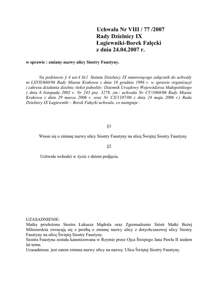 Uchwała Nr VIII / 77 /2007 Rady Dzielnicy IX Łagiewniki-Borek Fałęcki z dnia 24.04.2007 r. w sprawie : zmiany nazwy ulicy Siostry Faustyny. Na podstawie § 4 ust.4 lit.l Statutu Dzielnicy IX stanowiącego załącznik do uchwały nr LXVII/660/96 Rady Miasta Krakowa z dnia 18 grudnia 1996 r. w sprawie organizacji i zakresu działania dzielnic (tekst jednolity: Dziennik Urzędowy Województwa Małopolskiego z dnia 6 listopada 2002 r. Nr 243 poz. 3278, zm.: uchwała Nr CV/1060/06 Rady Miasta Krakowa z dnia 29 marca 2006 r. oraz Nr CX/1107/06 z dnia 24 maja 2006 r.) Rada Dzielnicy IX Łagiewniki – Borek Fałęcki uchwala, co następuje : §1 Wnosi się o zmianę nazwy ulicy Siostry Faustyny na ulicę Świętej Siostry Faustyny. §2 Uchwała wchodzi w życie z dniem podjęcia. UZASADNIENIE: Matka przełożona Siostra Łukasza Mądrala oraz Zgromadzenie Sióstr Matki Bożej Miłosierdzia zwracają się z prośbą o zmianę nazwy ulicy z dotychczasowej ulicy Siostry Faustyny na ulicę Świętej Siostry Faustyny. Siostra Faustyna została kanonizowana w Rzymie przez Ojca Świętego Jana Pawła II siedem lat temu. Uzasadniona jest zatem zmiana nazwy ulicy na nazwę: Ulica Świętej Siostry Faustyny.