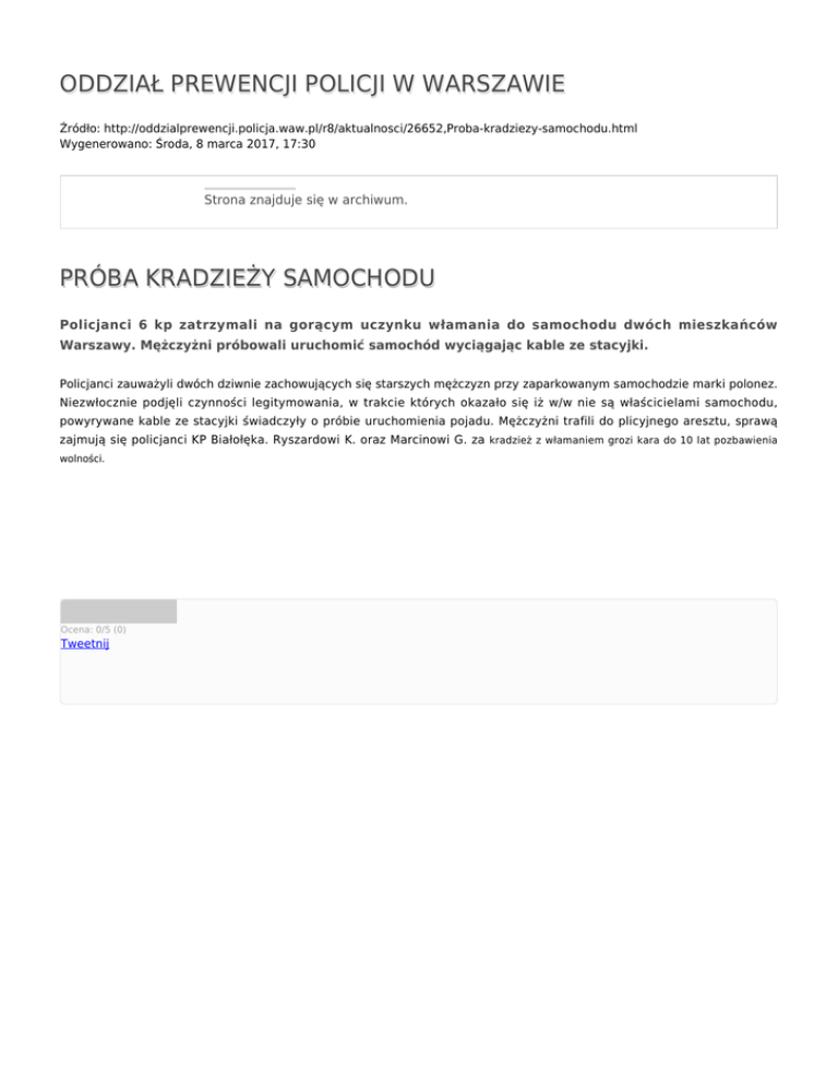 ODDZIAŁ PREWENCJI POLICJI W WARSZAWIE Źródło: http://oddzialprewencji.policja.waw.pl/r8/aktualnosci/26652,Proba-kradziezy-samochodu.html Wygenerowano: Środa, 8 marca 2017, 17:30 Strona znajduje się w archiwum. PRÓBA KRADZIEŻY SAMOCHODU Policjanci 6 kp zatrzymali na gorącym uczynku włamania do samochodu dwóch mieszkańców Warszawy. Mężczyżni próbowali uruchomić samochód wyciągając kable ze stacyjki. Policjanci zauważyli dwóch dziwnie zachowujących się starszych mężczyzn przy zaparkowanym samochodzie marki polonez. Niezwłocznie podjęli czynności legitymowania, w trakcie których okazało się iż w/w nie są właścicielami samochodu, powyrywane kable ze stacyjki świadczyły o próbie uruchomienia pojadu. Mężczyżni trafili do plicyjnego aresztu, sprawą zajmują się policjanci KP Białołęka. Ryszardowi K. oraz Marcinowi G. za kradzież z włamaniem grozi kara do 10 lat pozbawienia wolności. Ocena: 0/5 (0) Tweetnij
