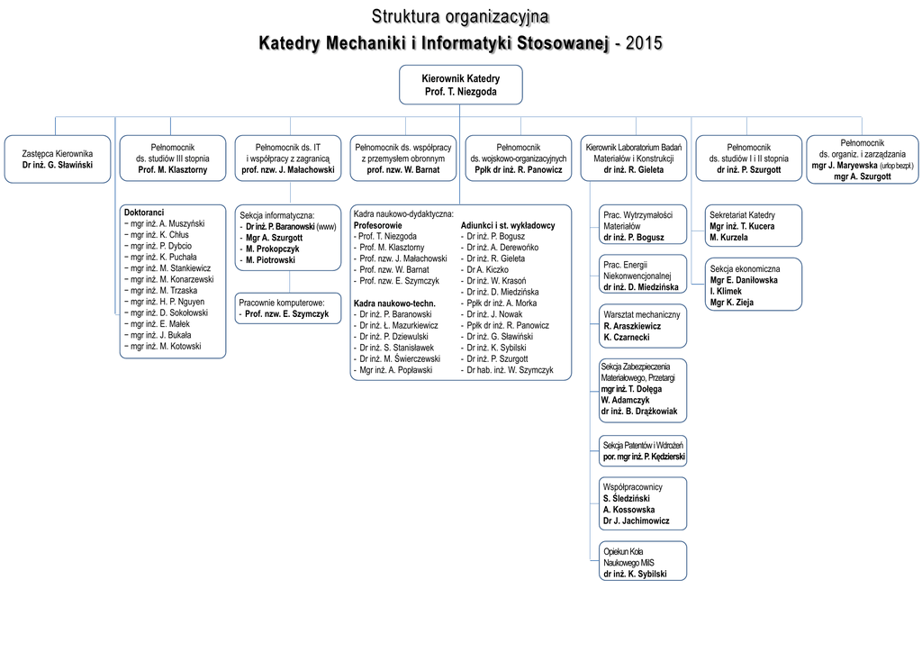 Struktura organizacyjna Katedry Mechaniki i Informatyki Stosowanej - 2015 Kierownik Katedry Prof. T. Niezgoda Zastępca Kierownika Dr inż. G. Sławiński Pełnomocnik ds. studiów III stopnia Prof. M. Klasztorny Doktoranci − mgr inż. A. Muszyński − mgr inż. K. Chłus − mgr inż. P. Dybcio − mgr inż. K. Puchała − mgr inż. M. Stankiewicz − mgr inż. M. Konarzewski − mgr inż. M. Trzaska − mgr inż. H. P. Nguyen − mgr inż. D. Sokołowski − mgr inż. E. Małek − mgr inż. J. Bukała − mgr inż. M. Kotowski Pełnomocnik ds. IT i współpracy z zagranicą prof. nzw. J. Małachowski Pełnomocnik ds. współpracy z przemysłem obronnym prof. nzw. W. Barnat Sekcja informatyczna: - Dr inż. P. Baranowski (www) - Mgr A. Szurgott - M. Prokopczyk - M. Piotrowski Kadra naukowo-dydaktyczna: Profesorowie - Prof. T. Niezgoda - Prof. M. Klasztorny - Prof. nzw. J. Małachowski - Prof. nzw. W. Barnat - Prof. nzw. E. Szymczyk Pracownie komputerowe: - Prof. nzw. E. Szymczyk Kadra naukowo-techn. - Dr inż. P. Baranowski - Dr inż. Ł. Mazurkiewicz - Dr inż. P. Dziewulski - Dr inż. S. Stanisławek - Dr inż. M. Świerczewski - Mgr inż. A. Popławski Pełnomocnik ds. wojskowo-organizacyjnych Ppłk dr inż. R. Panowicz Adiunkci i st. wykładowcy - Dr inż. P. Bogusz - Dr inż. A. Derewońko - Dr inż. R. Gieleta - Dr A. Kiczko - Dr inż. W. Krasoń - Dr inż. D. Miedzińska - Ppłk dr inż. A. Morka - Dr inż. J. Nowak - Ppłk dr inż. R. Panowicz - Dr inż. G. Sławiński - Dr inż. K. Sybilski - Dr inż. P. Szurgott - Dr hab. inż. W. Szymczyk Kierownik Laboratorium Badań Materiałów i Konstrukcji dr inż. R. Gieleta Pełnomocnik ds. studiów I i II stopnia dr inż. P. Szurgott Prac. Wytrzymałości Materiałów dr inż. P. Bogusz Sekretariat Katedry Mgr inż. T. Kucera M. Kurzela Prac. Energii Niekonwencjonalnej dr inż. D. Miedzińska Sekcja ekonomiczna Mgr E. Daniłowska I. Klimek Mgr K. Zieja Warsztat mechaniczny R. Araszkiewicz K. Czarnecki Sekcja Zabezpieczenia Materiałowego, Przetargi mgr inż. T. Dołęga W. Adamczyk dr inż. B. Drążkowiak Sekcja Patentów i Wdrożeń por. mgr inż. P. Kędzierski Współpracownicy S. Śledziński A. Kossowska Dr J. Jachimowicz Opiekun Koła Naukowego MiIS dr inż. K. Sybilski Pełnomocnik ds. organiz. i zarządzania mgr J. Maryewska (urlop bezpł.) mgr A. Szurgott