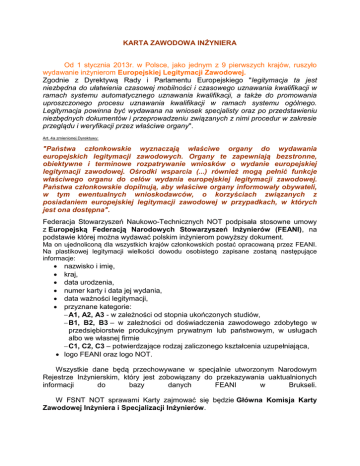 KARTA ZAWODOWA INŻYNIERA Od 1 stycznia 2013r. w Polsce