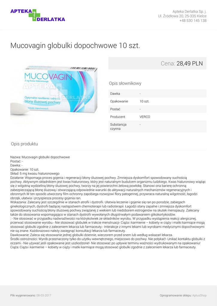 Apteka Derlatka Sp. j. Ul. Źródłowa 20, 25-335 Kielce +48 530 145 138 Mucovagin globulki dopochwowe 10 szt. Cena: 28,49 PLN Opis słownikowy Dawka - Opakowanie 10 szt. Postać - Producent VERCO Substancja czynna - Opis produktu Nazwa: Mucovagin globulki dopochwowe Postać: Dawka: Opakowanie: 10 szt. Skład: 5 mg kwasu hialuronowego Działanie: Wspomaga proces gojenia i regeneracji błony śluzowej pochwy. Zmniejsza dyskomfort spowodowany suchością pochwy. Aktywnym składnikiem jest kwas hialuronowy, który jest naturalnym budulcem organizmu ludzkiego. Kwas hialuronowy wiążąc się z wilgotną wydzieliną błony śluzowej pochwy, tworzy na jej powierzchni żelową powłokę. Stanowi ona barierę ochronną zabezpieczającą błonę śluzową i stwarzającą odpowiednie warunki do aktywacji naturalnych mechanizmów regeneracyjnych i obronnych.W ten sposób utworzony film ochronny zapobiega rozwojowi flory patogennej, przywraca naturalną wilgotność, łagodzi obrzęk, ułatwia i przyspiesza procesy gojenia ran. Wskazania: Zalecany jest szczególnie w stanach atrofii i dystrofii. Ułatwia leczenie i gojenie się ran po porodzie, zabiegach ginekologicznych, dystrofii będącej następstwem chemioterapii lub radioterapii. Łagodzi stany zapalne i zmniejsza dyskomfort spowodowany suchością błony śluzowej pochwy związanej z wiekiem lub niedoborem estrogenów na skutek menopauzy. Zalecany także do stosowania wspomagająco w stanach dystrofii wywołanych długotrwałym podawaniem glikokortykoidów. : - Nie stosować w przypadku nadwrażliwości na którykolwiek ze składników wyrobu. W przypadku wystąpienia reakcji alergicznej, przerwać stosowanie wyrobu.- Nie stosować globulek w trakcie menstruacji- Ciąża i karmienie – kobiety w ciąży i matki karmiące mogą stosować globulki zgodnie z zaleceniem lekarza lub farmaceuty.- Interakcje z innymi lekami lub wyrobami medycznymi dopochwowymi nie są znane. Każdorazowo należy zasięgnąć konsultacji lekarza lub farmaceuty. Dawkowanie: Zaleca się stosowanie jednej globulki dziennie, wieczorem przed snem lub według wskazań lekarza. Środki ostrożności: Wyrób przeznaczony tylko do użytku wewnętrznego, miejscowo do pochwy. Nie połykać!- Unikać kontaktu globulki z oczami.- Nie używać jeśli opakowanie jest uszkodzone!- Nie stosować po upływie terminu ważności wydrukowanym na opakowaniu! Ciąża: Ciąża i karmienie – kobiety w ciąży i matki karmiące mogą stosować globulki zgodnie z zaleceniem lekarza lub farmaceuty. Plik wygenerowano: 08-03-2017 Powered by TCPDF (www.tcpdf.org) Oprogramowanie sklepu: AptusShop