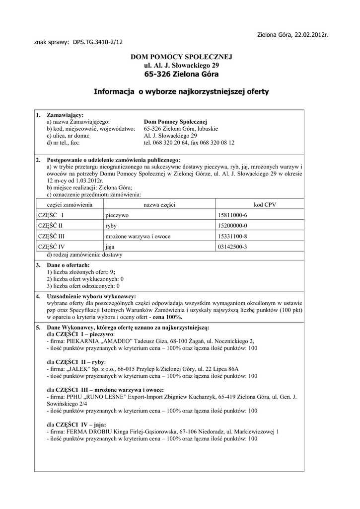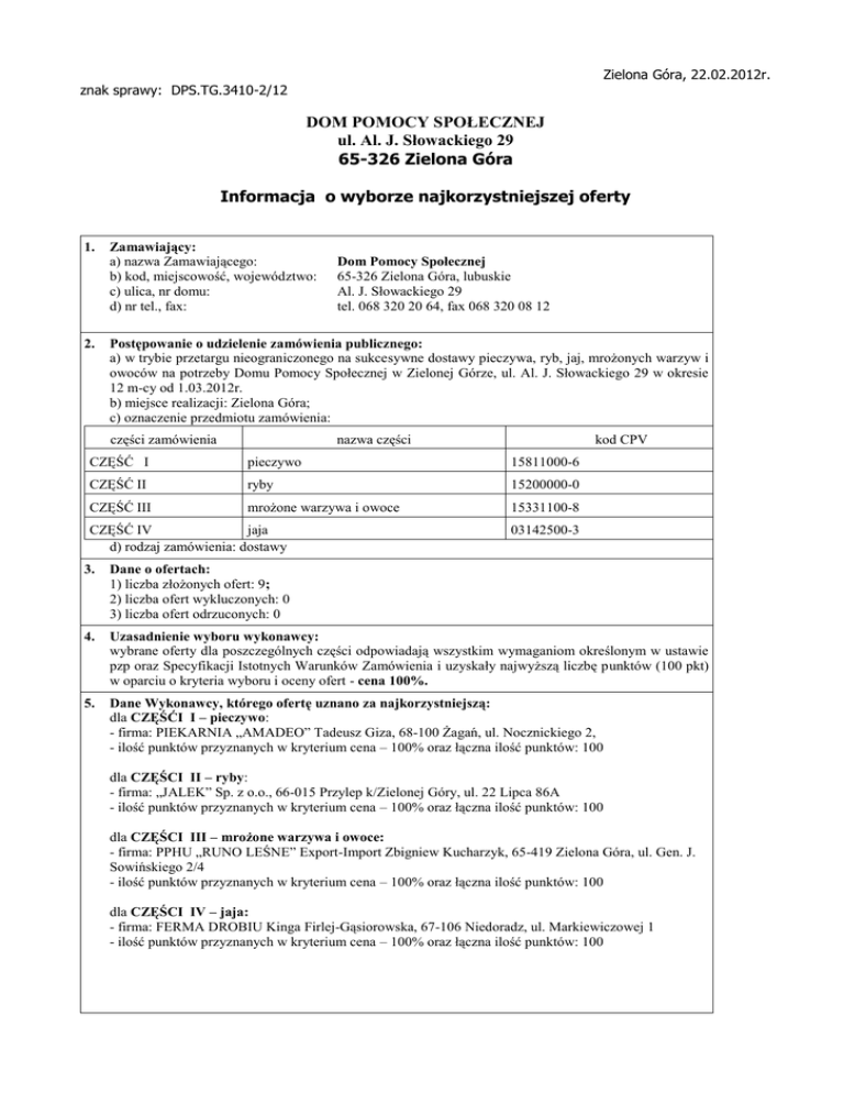 Zielona Góra, 22.02.2012r. znak sprawy: DPS.TG.3410-2/12 DOM POMOCY SPOŁECZNEJ ul. Al. J. Słowackiego 29 65-326 Zielona Góra Informacja o wyborze najkorzystniejszej oferty 1. 2. Zamawiający: a) nazwa Zamawiającego: b) kod, miejscowość, województwo: c) ulica, nr domu: d) nr tel., fax: Dom Pomocy Społecznej 65-326 Zielona Góra, lubuskie Al. J. Słowackiego 29 tel. 068 320 20 64, fax 068 320 08 12 Postępowanie o udzielenie zamówienia publicznego: a) w trybie przetargu nieograniczonego na sukcesywne dostawy pieczywa, ryb, jaj, mrożonych warzyw i owoców na potrzeby Domu Pomocy Społecznej w Zielonej Górze, ul. Al. J. Słowackiego 29 w okresie 12 m-cy od 1.03.2012r. b) miejsce realizacji: Zielona Góra; c) oznaczenie przedmiotu zamówienia: części zamówienia nazwa części kod CPV CZĘŚĆ I pieczywo 15811000-6 CZĘŚĆ II ryby 15200000-0 CZĘŚĆ III mrożone warzywa i owoce 15331100-8 CZĘŚĆ IV jaja d) rodzaj zamówienia: dostawy 03142500-3 3. Dane o ofertach: 1) liczba złożonych ofert: 9; 2) liczba ofert wykluczonych: 0 3) liczba ofert odrzuconych: 0 4. Uzasadnienie wyboru wykonawcy: wybrane oferty dla poszczególnych części odpowiadają wszystkim wymaganiom określonym w ustawie pzp oraz Specyfikacji Istotnych Warunków Zamówienia i uzyskały najwyższą liczbę punktów (100 pkt) w oparciu o kryteria wyboru i oceny ofert - cena 100%. 5. Dane Wykonawcy, którego ofertę uznano za najkorzystniejszą: dla CZĘŚĆI I – pieczywo: - firma: PIEKARNIA „AMADEO” Tadeusz Giza, 68-100 Żagań, ul. Nocznickiego 2, - ilość punktów przyznanych w kryterium cena – 100% oraz łączna ilość punktów: 100 dla CZĘŚCI II – ryby: - firma: „JALEK” Sp. z o.o., 66-015 Przylep k/Zielonej Góry, ul. 22 Lipca 86A - ilość punktów przyznanych w kryterium cena – 100% oraz łączna ilość punktów: 100 dla CZĘŚCI III – mrożone warzywa i owoce: - firma: PPHU „RUNO LEŚNE” Export-Import Zbigniew Kucharzyk, 65-419 Zielona Góra, ul. Gen. J. Sowińskiego 2/4 - ilość punktów przyznanych w kryterium cena – 100% oraz łączna ilość punktów: 100 dla CZĘŚCI IV – jaja: - firma: FERMA DROBIU Kinga Firlej-Gąsiorowska, 67-106 Niedoradz, ul. Markiewiczowej 1 - ilość punktów przyznanych w kryterium cena – 100% oraz łączna ilość punktów: 100 6. Dane o wykonawcach, którzy złożyli oferty: dla CZĘŚĆI I –pieczywo: - Oferta nr 3: REMA Sp. z o.o., ul. Dąbrowskiego 45, 65-021 Zielona Góra - ilość punktów przyznanych w kryterium cena – 100% oraz łączna ilość punktów: 59,03 - Oferta nr 6: OPTIMUM-„S” Sp. z o.o., ul. Spółdzielcza 2, 68-100 Żagań - ilość punktów przyznanych w kryterium cena – 100% oraz łączna ilość punktów: 79,47 - Oferta nr 7: Zakład Piekarniczo – Cukierniczy „ANTERS” Andrzej Antczak, Jabłonów, ul. Żagańska 29A, 68-113 Brzeźnica - ilość punktów przyznanych w kryterium cena – 100% oraz łączna ilość punktów: 95,54 - Oferta nr 8: PIEKARNIA „AMADEO” Tadeusz Giza, 68-100 Żagań, ul. Nocznickiego 2 - ilość punktów przyznanych w kryterium cena – 100% oraz łączna ilość punktów: 100 - Oferta nr 9: Produkcja Pieczywa i Ciastkarstwa Robert Szepelak, ul. Akacjowa 25, 66-001 Zawada - ilość punktów przyznanych w kryterium cena – 100% oraz łączna ilość punktów: 74,30 dla CZĘŚĆI II– ryby: - Oferta nr 1: PHU FALA Grzegorz Romanowski, UL. Al. Zjednoczenia 102, 65-021 Zielona Góra - ilość punktów przyznanych w kryterium cena – 100% oraz łączna ilość punktów: 97,29 - Oferta nr 5: „JALEK” Sp. z o.o., 66-015 Przylep k/Zielonej Góry, ul. 22 Lipca 86A - ilość punktów przyznanych w kryterium cena – 100% oraz łączna ilość punktów: 100 dla CZĘŚĆI III– mrożone warzywa i owoce: - Oferta nr 1: PHU FALA Grzegorz Romanowski, UL. Al. Zjednoczenia 102, 65-021 Zielona Góra - ilość punktów przyznanych w kryterium cena – 100% oraz łączna ilość punktów: 93,98 - Oferta nr 4: PPHU „RUNO LEŚNE” Export-Import Zbigniew Kucharzyk, 65-419 Zielona Góra, ul. Gen. J. Sowińskiego 2/4 - ilość punktów przyznanych w kryterium cena – 100% oraz łączna ilość punktów: 100 dla CZĘŚĆI IV– jaja: - Oferta nr 2: FERMA DROBIU Kinga Firlej-Gąsiorowska, 67-106 Niedoradz, ul. Markiewiczowej 1 - ilość punktów przyznanych w kryterium cena – 100% oraz łączna ilość punktów: 100 DYREKTOR Domu Pomocy Społecznej w Zielonej Górze mgr Elżbieta Michałowska