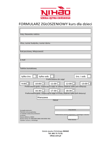 FORMULARZ ZGŁOSZENIOWY kurs dla dzieci Imię i Nazwisko rodzica Ulica, numer budynku, numer domu Kod pocztowy, Miejscowość e-mail Telefon kontaktowy tylko śro. tylko sob. śro. i sob. Preferowane dni zajęć 9:00 10:00 11:00 12:00 13:00 Preferowana godz. rozpoczęcia zajęć w soboty (wybrać tylko jeśli dotyczy) 16:30 17:30 18:30 Preferowana godz. rozpoczęcia zajęć w środy (wybrać tylko jeśli dotyczy) Warszawa Odział Szczegóły płatności: Płatność za kursy gotówką w siedzibie szkoły lub przelewem na konto: Nazwa odbiorcy: MAKS Numer konta: 67 2490 0005 0000 4500 8090 7842 Tytułem: za kurs j. chińskiego Imię dziecka Deklarowany poziom znajomości j. chińskiego u dziecka Wiek dziecka Szkoła Języka Chińskiego NIHAO Tel. 601 71 71 61 nihao.com.pl