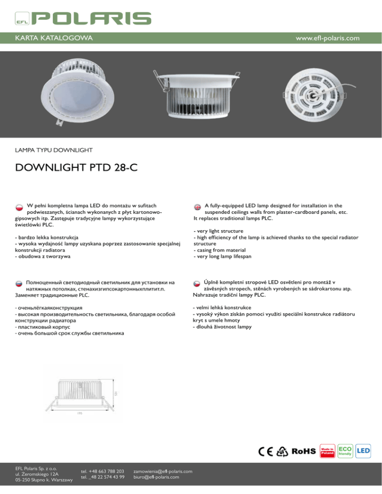KARTA KATALOGOWA www.efl-polaris.com LAMPA TYPU DOWNLIGHT DOWNLIGHT PTD 28-C W pełni kompletna lampa LED do montażu w sufitach podwieszanych, ścianach wykonanych z płyt kartonowogipsowych itp. Zastępuje tradycyjne lampy wykorzystujące świetlówki PLC. A fully-equipped LED lamp designed for installation in the suspended ceilings walls from plaster-cardboard panels, etc. It replaces traditional lamps PLC. - bardzo lekka konstrukcja - wysoka wydajność lampy uzyskana poprzez zastosowanie specjalnej konstrukcji radiatora - obudowa z tworzywa - very light structure - high efficiency of the lamp is achieved thanks to the special radiator structure - casing from material - very long lamp lifespan Полноценный светодиодный светильник для установки на натяжных потолках, стенахизгипсокартонныхплитит.п. Заменяет традиционные PLC. Úplně kompletní stropové LED osvětleni pro montáž v závěsných stropech, stěnách vyrobených se sádrokartonu atp. Nahrazuje tradiční lampy PLC. - оченьлёгкаяконструкция - высокая производительность светильника, благодаря особой конструкции радиатора - пластиковый корпус - очень большой срок службы светильника - velmi lehká konstrukce - vysoký výkon získán pomoci využiti speciální konstrukce radiátoru kryt s umele hmoty - dlouhá životnost lampy 105 195 Made in Poland EFL Polaris Sp. z o.o. ul. Żeromskiego 12A 05-250 Słupno k. Warszawy tel. +48 663 788 203 tel. _48 22 574 43 99 [email protected] [email protected] ECO friendly LED KARTA KATALOGOWA www.efl-polaris.com dane techniczne: / technical data: / технические условия: / specifikace: Specyfikacja Lampa Downlight PTD-28 - C PTD-28-C ciepła 2700 - 3200 K ≥ 80 176-264 V AC 106mA-159mA AC 50/60 Hz > 0,96 < 0,5 s 1800 lm 28 W 64,28 lm/W A 120° > 50 000 h -20°C do 40°C -30°C do 70°C 40 Wnętrze Tak ø 195 x 170 x 105 Materiały Cree Power Led 24 Aluminium/PMMA/Obudowa z tworzywa Dowolny Masa 0,90 kg 1,10 kg Produkt Kod Barwa światła Temperatura barwowa Wskaźnik oddawania barw Zasilanie Natężenie prądu Częstotliwość Współczynnik mocy Czas zapłonu Strumień świetlny Moc Efektywność Klasa energetyczna Kąt świecenia Żywotność Temperatura pracy Temperatura przechowywania Wskaźnik IP Zalecane miejsce zastosowania RoHS Wymiary LED Ilość LED Materiał Kolor obudowy Masa bez opakowania Masa z opakowaniem Obiekt Instalacja Numer projektu Data 1.2 : : : : 02.01.2014 EFL POLARIS, PTD-36-C () rozkład światła / light distribution / распределение света / distribuce světla 1.2.2 Krzywa światł. LDC 150° 180° 150° 120° 120° 90° 90° 100 200 60° 60° 300 0° 5° 10° 15° 20° 25° 30° 35° 40° 45° 50° 55° 60° 65° 70° 75° 80° 85° 90° C0 C90 C180 444 444 444 440 440 440 431 431 431 415 415 415 394 394 394 369 369 369 339 339 339 306 307 306 272 273 272 237 237 237 202 202 202 167 168 167 133 134 133 99 101 99 68 69 68 40 41 40 17 19 17 6 7 6 0 0 0 cd / 1000 lm 400 30° 0° C0 / C180 30° C90 / C270 cd / 1000 lm Producent Kod zamów. Nazwa oprawy Wyposażenie Wymiary Nazwa pliku : EFL POLARIS : : PTD-36-C : 1 x 0 / 3200 lm : D 235 mm x H 110 mm : PTD-36-C.ldt Sprawność Skuteczność świetlna Rozsył oświetlenia Kąt wiązki św. : 100% : 84.21 lm/W (A40) : sym. do C0-C180 / C90-C270 : 94.4° C0-C180 94.5° C90-C270 EFL Polaris Sp. z o.o. tel. +48 663 788 203 ul. Żeromskiego 12A -please put your own address heretel. _48 22 574 43 99 05-250 Słupno k. Warszawy 0201.rdf Made in Poland [email protected] [email protected] Strona 2/2 ECO friendly LED