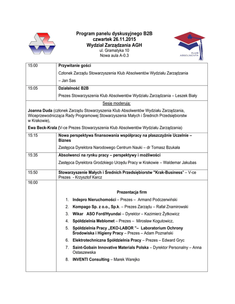 Program panelu dyskusyjnego B2B czwartek 26.11.2015 Wydział Zarządzania AGH ul. Gramatyka 10 Nowa aula A-0.3 15:00 Przywitanie gości Członek Zarządu Stowarzyszenia Klub Absolwentów Wydziału Zarządzania – Jan Sas 15:05 Działalność B2B Prezes Stowarzyszenia Klub Absolwentów Wydziału Zarządzania – Leszek Biały Sesję moderują: Joanna Duda (członek Zarządu Stowarzyszenia Klub Absolwentów Wydziału Zarządzania, Wiceprzewodnicząca Rady Programowej Stowarzyszenia Małych i Średnich Przedsiębiorstw w Krakowie), Ewa Beck-Krala (V-ce Prezes Stowarzyszenia Klub Absolwentów Wydziału Zarządzania) 15:15 Nowa perspektywa finansowania współpracy na płaszczyźnie Uczelnie – Biznes Zastępca Dyrektora Narodowego Centrum Nauki – dr Tomasz Bzukała 15:35 Absolwenci na rynku pracy – perspektywy i możliwości Zastępca Dyrektora Grodzkiego Urzędu Pracy w Krakowie – Waldemar Jakubas 15:50 Stowarzyszenie Małych i Średnich Przedsiębiorstw "Krak-Business" – V-ce Prezes - Krzysztof Karcz 16:00 Prezentacja firm 1. Indepro Nieruchomości – Prezes – Armand Podczerwiński 2. Kompago Sp. z o.o., Sp.k. – Prezes Zarządu – Rafał Znamirowski 3. Wikar ASO Ford/Hyundai – Dyrektor – Kazimierz Żytkowicz 4. Spółdzielnia Meblomet – Prezes – Mirosław Kogutowicz, 5. Spółdzielnia Pracy „EKO-LABOR ”– Laboratorium Ochrony Środowiska i Higieny Pracy – Prezes – Adam Poznański 6. Elektrotechniczna Spółdzielnia Pracy – Prezes – Edward Gryc 7. Saint-Gobain Innovative Materials Polska – Dyrektor Personalny – Anna Ostaszewska 8. INVENTI Consulting – Marek Warejko 16:50 Pytania i dyskusja ze studentami 17:05–17:20 Przerwa kawowa 17:20 Spotkane dyskusyjne (robocze) w sprawie programu i efektów kształcenia studentów z uczestnikami konferencji: Władze Wydziału Zarządzania (Dziekan dr hab. inż. Piotr Łebkowski, prof. AGH; Prodziekan ds. Naukowych dr hab. inż. Mariusz Kudełko, prof. AGH; Prodziekan ds. Kształcenia dr inż. Marek Dudek) Władzie Stowarzyszenia Klub Absolwentów Wydziału Zarządzania Członkowie Stowarzyszenia Małych i Średnich Przedsiębiorstw "KrakBusiness" Zastępca Dyrektora Narodowego Centrum Nauki – dr Tomasz Bzukała, Zastępca Dyrektora Grodzkiego Urzędu Pracy w Krakowie Waldemar Jakubas, Bożena Wojtas-Wójcik -kierownik Przedstawiciele przedsiębiorców