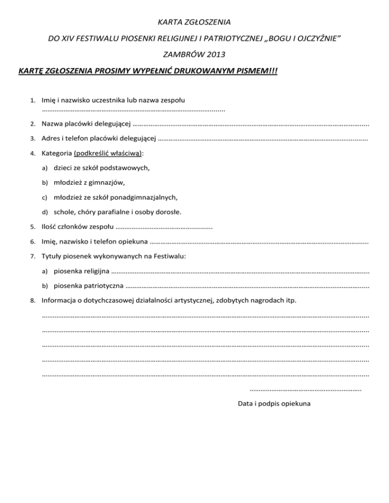 KARTA ZGŁOSZENIA DO XIV FESTIWALU PIOSENKI RELIGIJNEJ I PATRIOTYCZNEJ „BOGU I OJCZYŹNIE” ZAMBRÓW 2013 KARTĘ ZGŁOSZENIA PROSIMY WYPEŁNIĆ DRUKOWANYM PISMEM!!! 1. Imię i nazwisko uczestnika lub nazwa zespołu …………………………………………………………………………………........ 2. Nazwa placówki delegującej ………………………………………………………………………………………………………………..... 3. Adres i telefon placówki delegującej ………………………………………………………………………………………………........ 4. Kategoria (podkreślić właściwą): a) dzieci ze szkół podstawowych, b) młodzież z gimnazjów, c) młodzież ze szkół ponadgimnazjalnych, d) schole, chóry parafialne i osoby dorosłe. 5. Ilość członków zespołu ……………………………………........... 6. Imię, nazwisko i telefon opiekuna ……………………………………………………………………………………………………....... 7. Tytuły piosenek wykonywanych na Festiwalu: a) piosenka religijna …………………………………………………………………………………………………………………………..... b) piosenka patriotyczna …………………………………………………………………………………………………………………...... 8. Informacja o dotychczasowej działalności artystycznej, zdobytych nagrodach itp. …………………………………………………………………………………………………………………………………………………………....... …………………………………………………………………………………………………………………………………………………………....... …………………………………………………………………………………………………………………………………………………………....... …………………………………………………………………………………………………………………………………………………………....... …………………………………………………………………………………………………………………………………………………………....... …………………………………………………….. Data i podpis opiekuna
