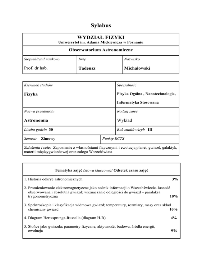 Sylabus WYDZIAŁ FIZYKI Uniwersytet im. Adama Mickiewicza w Poznaniu Obserwatorium Astronomiczne Stopień/tytuł naukowy Imię Nazwisko Prof. dr hab. Tadeusz Michałowski Kierunek studiów Specjalność Fizyka Fizyka Ogólna , Nanotechnologia, Informatyka Stosowana Nazwa przedmiotu Rodzaj zajęć Astronomia Wykład Liczba godzin 30 Rok studiów/tryb III Semestr Zimowy Punkty ECTS Założenia i cele: Zapoznanie z własnościami fizycznymi i ewolucją planet, gwiazd, galaktyk, materii międzygwiazdowej oraz całego Wszechświata Tematyka zajęć (słowa kluczowe)/ Odsetek czasu zajęć 1. Historia odkryć astronomicznych. 3% 2. Promieniowanie elektromagnetyczne jako nośnik informacji o Wszechświecie. Jasność obserwowana i absolutna gwiazd; wyznaczanie odległości do gwiazd – paralaksa trygonometryczna 10% 3. Spektroskopia i klasyfikacja widmowa gwiazd; temperatury, rozmiary, masy oraz skład chemiczny gwiazd 10% 4. Diagram Hertzsprunga-Russella (diagram H-R) 4% 5. Słońce jako gwiazda: parametry fizyczne, aktywność, budowa, źródła energii, ewolucja 9% 6. Układ Słoneczny oraz pozasłoneczne układy planetarne 9% 7. Diagramy H-R dla gromad gwiazd 5% 8. Materia międzygwiazdowa. 3% 9. Ewolucja gwiazd: protogwiazdy, gwiazdy Ciągu Głównego, olbrzymy i nadolbrzymy, białe karły, gwiazdy wybuchowe, pulsary, czarne dziury; źródła energii 12% 10. Cefeidy i ich wykorzystanie do wyznaczania odległości 5% 11. Gwiazdy podwójne: metody wykrywania podwójnosci oraz wyznaczanie mas gwiazd 12. Budowa Galaktyki; inne galaktyki we Wszechświecie 10% 5% 13. Rozszerzanie się Wszechświata – prawo Hubble’a; teoria Wielkiego Wybuchu oraz mikrofalowe promieniowanie tła; podstawy kosmologii 15% Sposoby oceny pracy studenta Udział w ocenie końcowej ocena ciągła (bieżące przygotowanie do zajęć i aktywność) śródsemestralne kolokwia pisemne/ustne końcowe zaliczenie pisemne egzamin pisemny egzamin ustny kontrola obecności Praca końcowa semestralna/roczna inne: 100% Literatura obowiązkowa 1. JM. Kreiner, Astronomia z Astrofizyką, PWN, 1988 2. E. Rybka, Astronomia Ogólna, PWN, 1977 3. B.W. Carroll, D. A. Ostie, An Introduction to Modern Astrophysics, Pearson Addison Wesley, 2007 4. R.A. Freedman, W.J. Kaufmann III, Universe, W.H. Freeman and Company, 2008 Literatura dodatkowa Dostępne źródła w Internecie