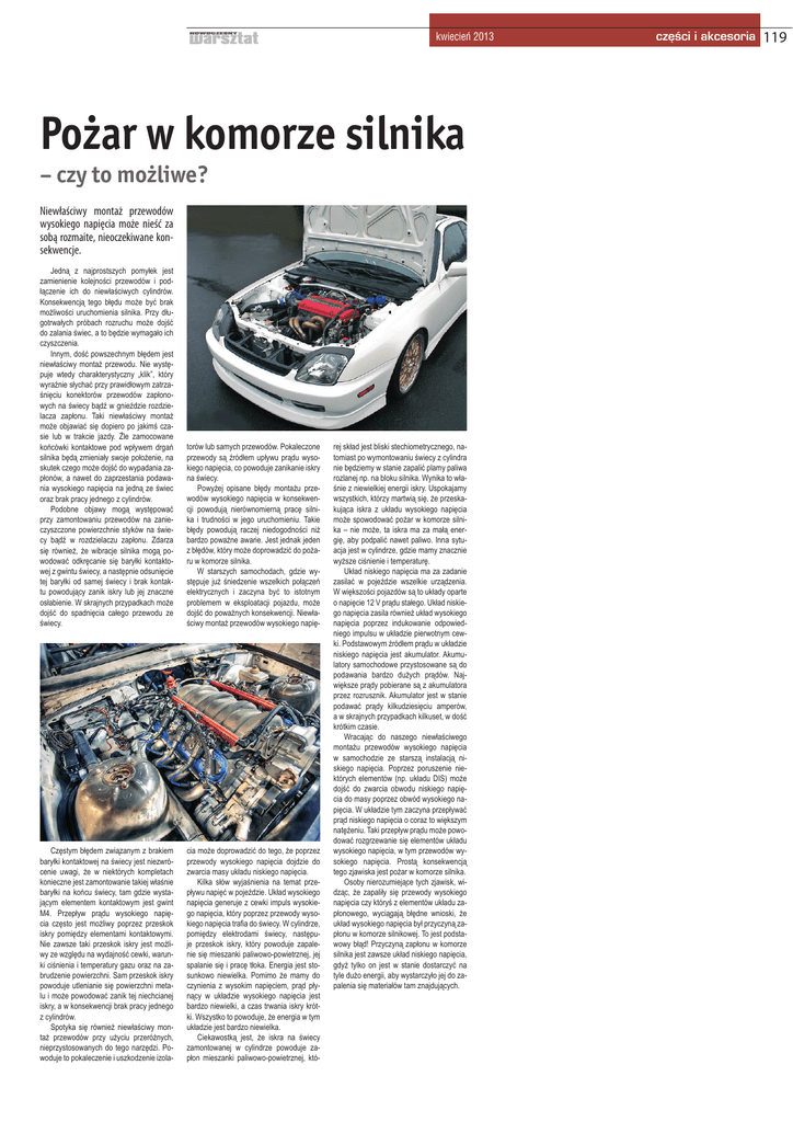 kwiecień 2013 Pożar w komorze silnika – czy to możliwe? Niewłaściwy montaż przewodów wysokiego napięcia może nieść za sobą rozmaite, nieoczekiwane konsekwencje. Jedną z najprostszych pomyłek jest zamienienie kolejności przewodów i podłączenie ich do niewłaściwych cylindrów. Konsekwencją tego błędu może być brak możliwości uruchomienia silnika. Przy długotrwałych próbach rozruchu może dojść do zalania świec, a to będzie wymagało ich czyszczenia. Innym, dość powszechnym błędem jest niewłaściwy montaż przewodu. Nie występuje wtedy charakterystyczny „klik”, który wyraźnie słychać przy prawidłowym zatrzaśnięciu konektorów przewodów zapłonowych na świecy bądź w gnieździe rozdzielacza zapłonu. Taki niewłaściwy montaż może objawiać się dopiero po jakimś czasie lub w trakcie jazdy. Źle zamocowane końcówki kontaktowe pod wpływem drgań silnika będą zmieniały swoje położenie, na skutek czego może dojść do wypadania zapłonów, a nawet do zaprzestania podawania wysokiego napięcia na jedną ze świec oraz brak pracy jednego z cylindrów. Podobne objawy mogą występować przy zamontowaniu przewodów na zanieczyszczone powierzchnie styków na świecy bądź w rozdzielaczu zapłonu. Zdarza się również, że wibracje silnika mogą powodować odkręcanie się baryłki kontaktowej z gwintu świecy, a następnie odsunięcie tej baryłki od samej świecy i brak kontaktu powodujący zanik iskry lub jej znaczne osłabienie. W skrajnych przypadkach może dojść do spadnięcia całego przewodu ze świecy. torów lub samych przewodów. Pokaleczone przewody są źródłem upływu prądu wysokiego napięcia, co powoduje zanikanie iskry na świecy. Powyżej opisane błędy montażu przewodów wysokiego napięcia w konsekwencji powodują nierównomierną pracę silnika i trudności w jego uruchomieniu. Takie błędy powodują raczej niedogodności niż bardzo poważne awarie. Jest jednak jeden z błędów, który może doprowadzić do pożaru w komorze silnika. W starszych samochodach, gdzie występuje już śniedzenie wszelkich połączeń elektrycznych i zaczyna być to istotnym problemem w eksploatacji pojazdu, może dojść do poważnych konsekwencji. Niewłaściwy montaż przewodów wysokiego napię- Częstym błędem związanym z brakiem baryłki kontaktowej na świecy jest niezwrócenie uwagi, że w niektórych kompletach konieczne jest zamontowanie takiej właśnie baryłki na końcu świecy, tam gdzie wystającym elementem kontaktowym jest gwint M4. Przepływ prądu wysokiego napięcia często jest możliwy poprzez przeskok iskry pomiędzy elementami kontaktowymi. Nie zawsze taki przeskok iskry jest możliwy ze względu na wydajność cewki, warunki ciśnienia i temperatury gazu oraz na zabrudzenie powierzchni. Sam przeskok iskry powoduje utlenianie się powierzchni metalu i może powodować zanik tej niechcianej iskry, a w konsekwencji brak pracy jednego z cylindrów. Spotyka się również niewłaściwy montaż przewodów przy użyciu przeróżnych, nieprzystosowanych do tego narzędzi. Powoduje to pokaleczenie i uszkodzenie izola- cia może doprowadzić do tego, że poprzez przewody wysokiego napięcia dojdzie do zwarcia masy układu niskiego napięcia. Kilka słów wyjaśnienia na temat przepływu napięć w pojeździe. Układ wysokiego napięcia generuje z cewki impuls wysokiego napięcia, który poprzez przewody wysokiego napięcia trafia do świecy. W cylindrze, pomiędzy elektrodami świecy, następuje przeskok iskry, który powoduje zapalenie się mieszanki paliwowo-powietrznej, jej spalanie się i pracę tłoka. Energia jest stosunkowo niewielka. Pomimo że mamy do czynienia z wysokim napięciem, prąd płynący w układzie wysokiego napięcia jest bardzo niewielki, a czas trwania iskry krótki. Wszystko to powoduje, że energia w tym układzie jest bardzo niewielka. Ciekawostką jest, że iskra na świecy zamontowanej w cylindrze powoduje zapłon mieszanki paliwowo-powietrznej, któ- rej skład jest bliski stechiometrycznego, natomiast po wymontowaniu świecy z cylindra nie będziemy w stanie zapalić plamy paliwa rozlanej np. na bloku silnika. Wynika to właśnie z niewielkiej energii iskry. Uspokajamy wszystkich, którzy martwią się, że przeskakująca iskra z układu wysokiego napięcia może spowodować pożar w komorze silnika – nie może, ta iskra ma za małą energię, aby podpalić nawet paliwo. Inna sytuacja jest w cylindrze, gdzie mamy znacznie wyższe ciśnienie i temperaturę. Układ niskiego napięcia ma za zadanie zasilać w pojeździe wszelkie urządzenia. W większości pojazdów są to układy oparte o napięcie 12 V prądu stałego. Układ niskiego napięcia zasila również układ wysokiego napięcia poprzez indukowanie odpowiedniego impulsu w układzie pierwotnym cewki. Podstawowym źródłem prądu w układzie niskiego napięcia jest akumulator. Akumulatory samochodowe przystosowane są do podawania bardzo dużych prądów. Największe prądy pobierane są z akumulatora przez rozrusznik. Akumulator jest w stanie podawać prądy kilkudziesięciu amperów, a w skrajnych przypadkach kilkuset, w dość krótkim czasie. Wracając do naszego niewłaściwego montażu przewodów wysokiego napięcia w samochodzie ze starszą instalacją niskiego napięcia. Poprzez poruszenie niektórych elementów (np. układu DIS) może dojść do zwarcia obwodu niskiego napięcia do masy poprzez obwód wysokiego napięcia. W układzie tym zaczyna przepływać prąd niskiego napięcia o coraz to większym natężeniu. Taki przepływ prądu może powodować rozgrzewanie się elementów układu wysokiego napięcia, w tym przewodów wysokiego napięcia. Prostą konsekwencją tego zjawiska jest pożar w komorze silnika. Osoby nierozumiejące tych zjawisk, widząc, że zapaliły się przewody wysokiego napięcia czy któryś z elementów układu zapłonowego, wyciągają błędne wnioski, że układ wysokiego napi