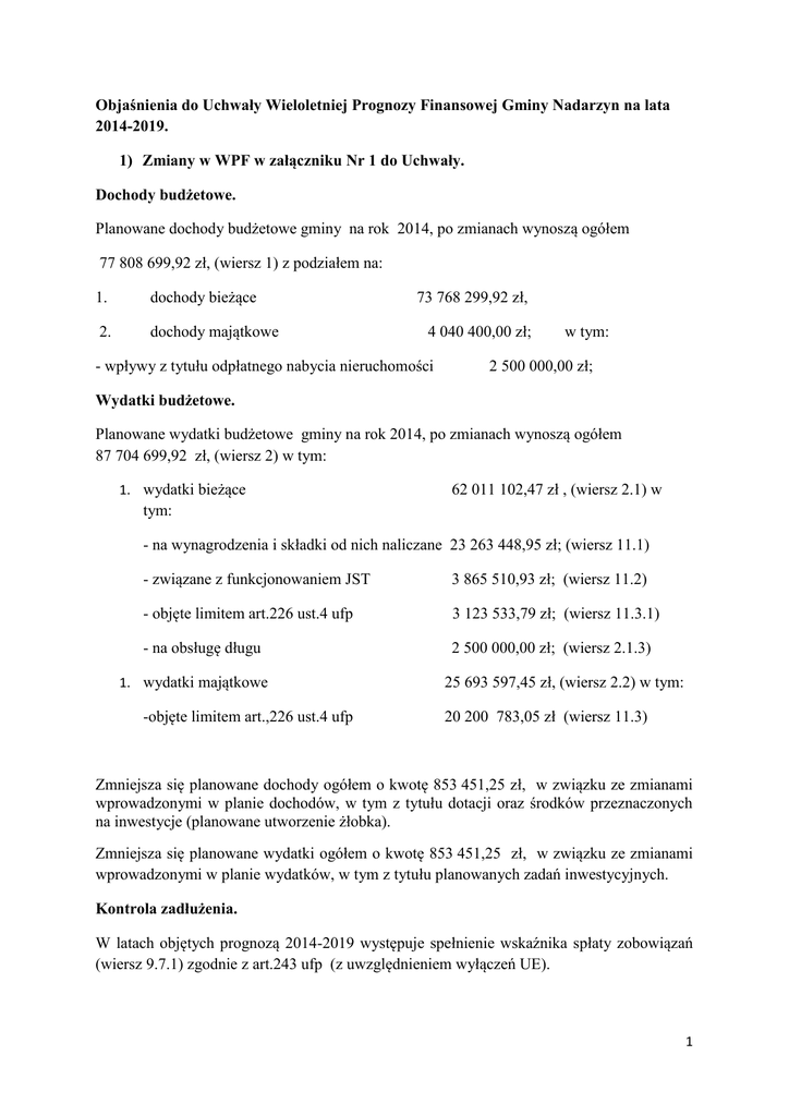 Objaśnienia do Uchwały Wieloletniej Prognozy Finansowej Gminy Nadarzyn na lata 2014-2019. 1) Zmiany w WPF w załączniku Nr 1 do Uchwały. Dochody budżetowe. Planowane dochody budżetowe gminy na rok 2014, po zmianach wynoszą ogółem 77 808 699,92 zł, (wiersz 1) z podziałem na: 1. dochody bieżące 2. dochody majątkowe 73 768 299,92 zł, 4 040 400,00 zł; - wpływy z tytułu odpłatnego nabycia nieruchomości w tym: 2 500 000,00 zł; Wydatki budżetowe. Planowane wydatki budżetowe gminy na rok 2014, po zmianach wynoszą ogółem 87 704 699,92 zł, (wiersz 2) w tym: 1. wydatki bieżące 62 011 102,47 zł , (wiersz 2.1) w tym: - na wynagrodzenia i składki od nich naliczane 23 263 448,95 zł; (wiersz 11.1) - związane z funkcjonowaniem JST 3 865 510,93 zł; (wiersz 11.2) - objęte limitem art.226 ust.4 ufp 3 123 533,79 zł; (wiersz 11.3.1) - na obsługę długu 2 500 000,00 zł; (wiersz 2.1.3) 1. wydatki majątkowe -objęte limitem art.,226 ust.4 ufp 25 693 597,45 zł, (wiersz 2.2) w tym: 20 200 783,05 zł (wiersz 11.3) Zmniejsza się planowane dochody ogółem o kwotę 853 451,25 zł, w związku ze zmianami wprowadzonymi w planie dochodów, w tym z tytułu dotacji oraz środków przeznaczonych na inwestycje (planowane utworzenie żłobka). Zmniejsza się planowane wydatki ogółem o kwotę 853 451,25 zł, w związku ze zmianami wprowadzonymi w planie wydatków, w tym z tytułu planowanych zadań inwestycyjnych. Kontrola zadłużenia. W latach objętych prognozą 2014-2019 występuje spełnienie wskaźnika spłaty zobowiązań (wiersz 9.7.1) zgodnie z art.243 ufp (z uwzględnieniem wyłączeń UE). 1 Spłata i obsługa długu. Prognoza długu obejmuje lata 2014-2019, w tym okresie z tytułu zaciągniętych zobowiązań w wierszu 5.1 „ Spłaty rat kapitałowych” uwzględniono spłaty rat kredytów i pożyczek, a w wierszu 2.1.3 ” Wydatki na obsługę długu " - (prowizja, odsetki). Natomiast spłaty rat z tytułu wykupu wierzytelności wykazane zostały w wierszu 14.3.2 " Wydatki zmniejszające dług, związane z umowami zaliczanymi do tytułów dłużnych wliczanych w państwowy dług publiczny", w każdym roku zaplanowana została kwota w wysokości 1.557.692,28 zł, a w 2019 – 1.557.692,52 zł. Zmiany w przedsięwzięciach do WPF w załączniku Nr 2 do Uchwały Objaśnienia do Uchwały Wieloletniej Prognozy Finansowej Gminy Nadarzyn na lata 2014-2019. 1)Zmiany w przedsięwzięciach do WPF w załączniku Nr 2 do Uchwały W części 1.1 .1 (wydatki bieżące): Wprowadzono nowy projekt: POKL „ Moja przyszłość”- kwota 41.000,00 zł na rok 2014. Wprowadzono nowy projekt: Rewitalizacja i wyposażenie budynku Nadarzyńskiego Ośrodka Kultury- kwota 244.445,69 zł na rok 2014 W części 1.1.2 (wydatki majątkowe): Projekt: Budowa ścieżek rowerowych – kwotę 50.000,00 zł przesunięto z roku 2014 na rok 2015. Projekt: Modernizacja i doposażenie placu zabaw przy świetlicy wiejskiej w miejscowości Wolicy – zwiększono plan wydatków na rok 2014 o kwotę 40.000,00 zł. Zmniejszono o kwotę 50.000,00 zł wydatki na przebudowę budynku świetlicy w Urzucie w związku ze zmianą źródeł finansowania. Wprowadzono nowy projekt: Rewitalizacja i wyposażenie budynku Nadarzyńskiego Ośrodka Kultury- kwota 223.260,00 zł na rok 2015 W części 1.3.2 (wydatki majątkowe): Zmniejszono o kwotę 117.000,00 zł wydatki na rok 2014, na budowę chodnika ul. Blońska Nadarzyn. 2 Plan wydatków na dokumentację projektowo-kosztorysową opracowania projektu budowlanego budowy kanalizacji sanitarnej w m. Siestrzeń, w kwocie 10.578,00 zł przeniesiono na rok 2015. Plan wydatków na dokumentację projektowo-kosztorysową renowacji zabytkowego pałacu i oficyny w Młochowie, w kwocie 66.000,00 zł przeniesiono na rok 2015. Zmniejszono plan wydatków na dokumentację projektowo-kosztorysową rozbudowy i przebudowy budynku świetlicy w m. Urzut o kwotę 5.264,40 zł Wprowadzono zadanie: dokumentacja projektowo-kosztorysowa i rozbudowa budynku świetlicy w Urzucie, w kwocie 15.264,40 zł na rok 2014. 3