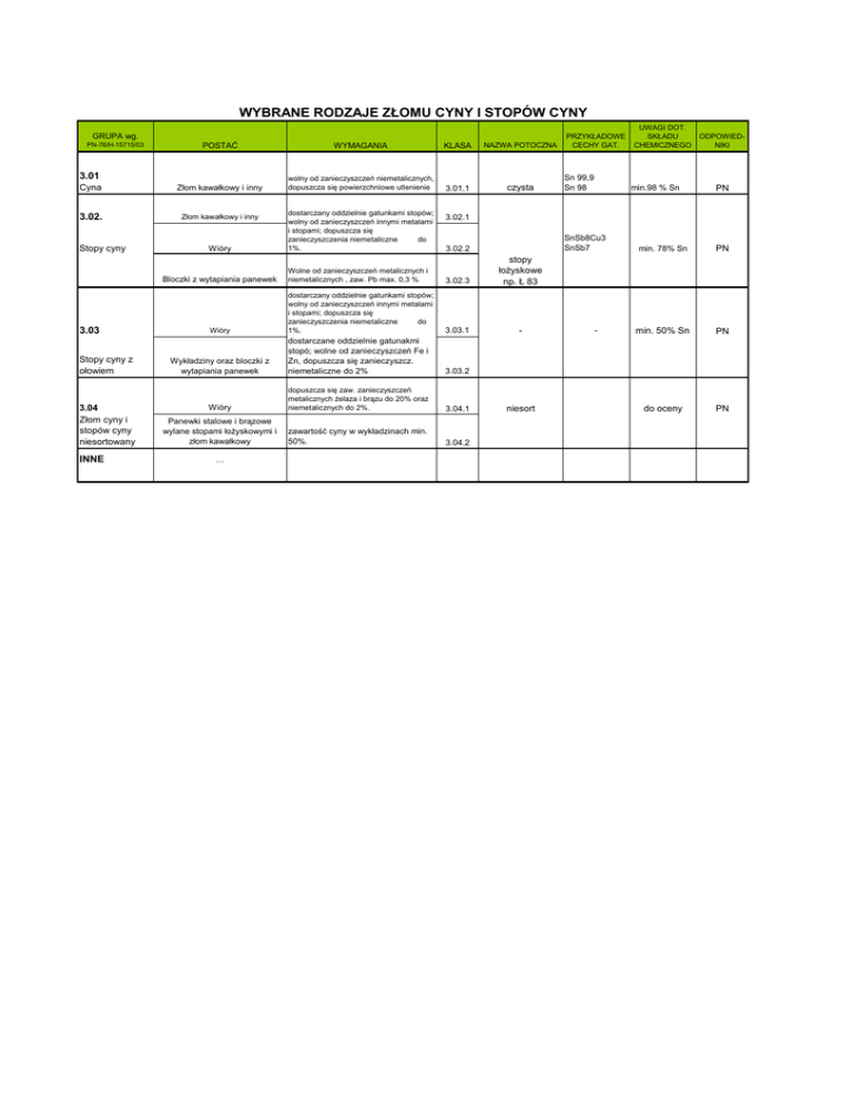 WYBRANE RODZAJE ZŁOMU CYNY I STOPÓW CYNY GRUPA wg. POSTAĆ WYMAGANIA KLASA NAZWA POTOCZNA Cyna Złom kawałkowy i inny wolny od zanieczyszczeń niemetalicznych, dopuszcza się powierzchniowe utlenienie 3.01.1 czysta 3.02. Złom kawałkowy i inny PN-76/H-15715/03 3.01 Stopy cyny Wióry Bloczki z wytapiania panewek 3.03 Wióry dostarczany oddzielnie gatunkami stopów; wolny od zanieczyszczeń innymi metalami i stopami; dopuszcza się zanieczyszczenia niemetaliczne do 1%. min.98 % Sn SnSb8Cu3 SnSb7 3.02.2 Wolne od zanieczyszczeń metalicznych i niemetalicznych , zaw. Pb max. 0,3 % 3.02.3 stopy łoŜyskowe np. Ł 83 dostarczany oddzielnie gatunkami stopów; wolny od zanieczyszczeń innymi metalami i stopami; dopuszcza się zanieczyszczenia niemetaliczne do 1%. 3.03.1 - 3.03.2 Stopy cyny z ołowiem Wykładziny oraz bloczki z wytapiania panewek 3.04 Złom cyny i stopów cyny niesortowany Wióry dopuszcza się zaw. zanieczyszczeń metalicznych Ŝelaza i brązu do 20% oraz niemetalicznych do 2%. 3.04.1 Panewki stalowe i brązowe wylane stopami łoŜyskowymi i złom kawałkowy zawartość cyny w wykładzinach min. 50%. 3.04.2 … Sn 99,9 Sn 98 UWAGI DOT. SKŁADU CHEMICZNEGO ODPOWIEDNIKI PN 3.02.1 dostarczane oddzielnie gatunakmi stopó; wolne od zanieczyszczeń Fe i Zn, dopuszcza się zanieczyszcz. niemetaliczne do 2% INNE PRZYKŁADOWE CECHY GAT. niesort - min. 78% Sn PN min. 50% Sn PN do oceny PN