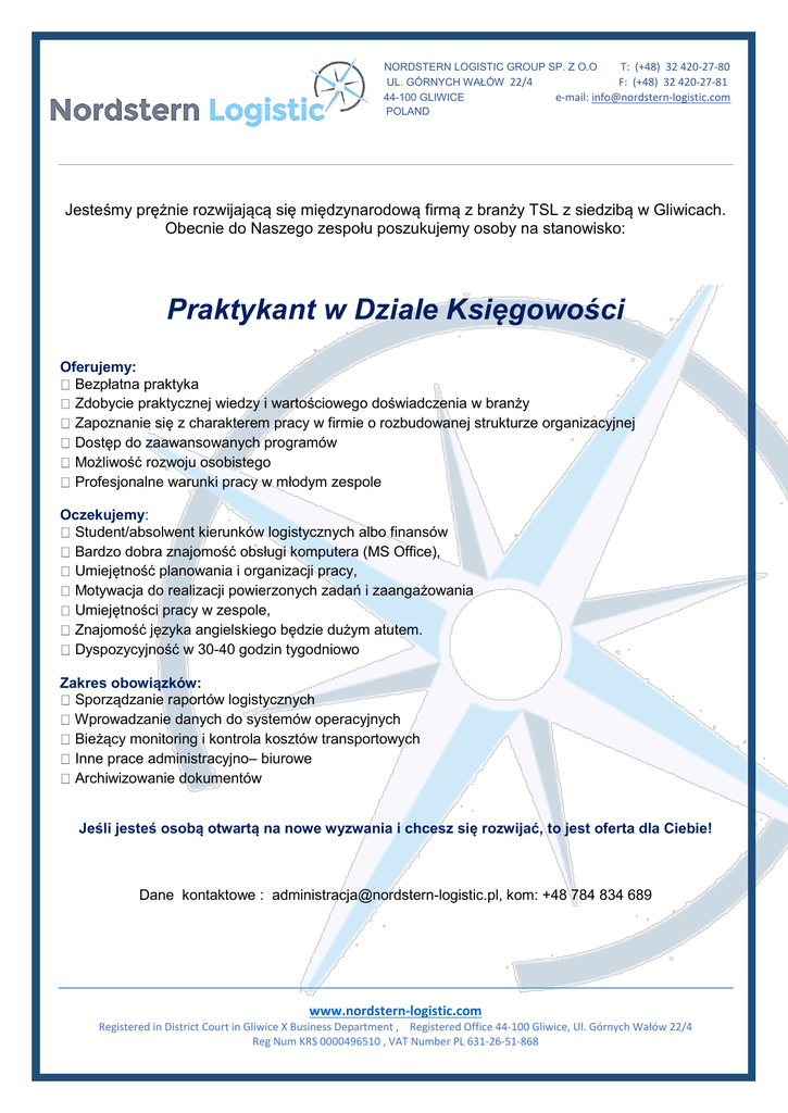 NORDSTERN LOGISTIC GROUP SP. Z O.O T: (+48) 32 420-27-80 UL. GÓRNYCH WAŁÓW 22/4 F: (+48) 32 420-27-81 44-100 GLIWICE e-mail: [email protected] POLAND Jesteśmy prężnie rozwijającą się międzynarodową firmą z branży TSL z siedzibą w Gliwicach. Obecnie do Naszego zespołu poszukujemy osoby na stanowisko: Praktykant w Dziale Księgowości Oferujemy: Bezpłatna praktyka Zdobycie praktycznej wiedzy i wartościowego doświadczenia w branży Zapoznanie się z charakterem pracy w firmie o rozbudowanej strukturze organizacyjnej Dostęp do zaawansowanych programów Możliwość rozwoju osobistego Profesjonalne warunki pracy w młodym zespole Oczekujemy: Student/absolwent kierunków logistycznych albo finansów Bardzo dobra znajomość obsługi komputera (MS Office), Umiejętność planowania i organizacji pracy, Motywacja do realizacji powierzonych zadań i zaangażowania Umiejętności pracy w zespole, Znajomość języka angielskiego będzie dużym atutem. Dyspozycyjność w 30-40 godzin tygodniowo Zakres obowiązków: Sporządzanie raportów logistycznych Wprowadzanie danych do systemów operacyjnych Bieżący monitoring i kontrola kosztów transportowych Inne prace administracyjno– biurowe Archiwizowanie dokumentów Jeśli jesteś osobą otwartą na nowe wyzwania i chcesz się rozwijać, to jest oferta dla Ciebie! Dane kontaktowe : [email protected], kom: +48 784 834 689 www.nordstern-logistic.com Registered in District Court in Gliwice X Business Department , Registered Office 44-100 Gliwice, Ul. Górnych Wałów 22/4 Reg Num KRS 0000496510 , VAT Number PL 631-26-51-868