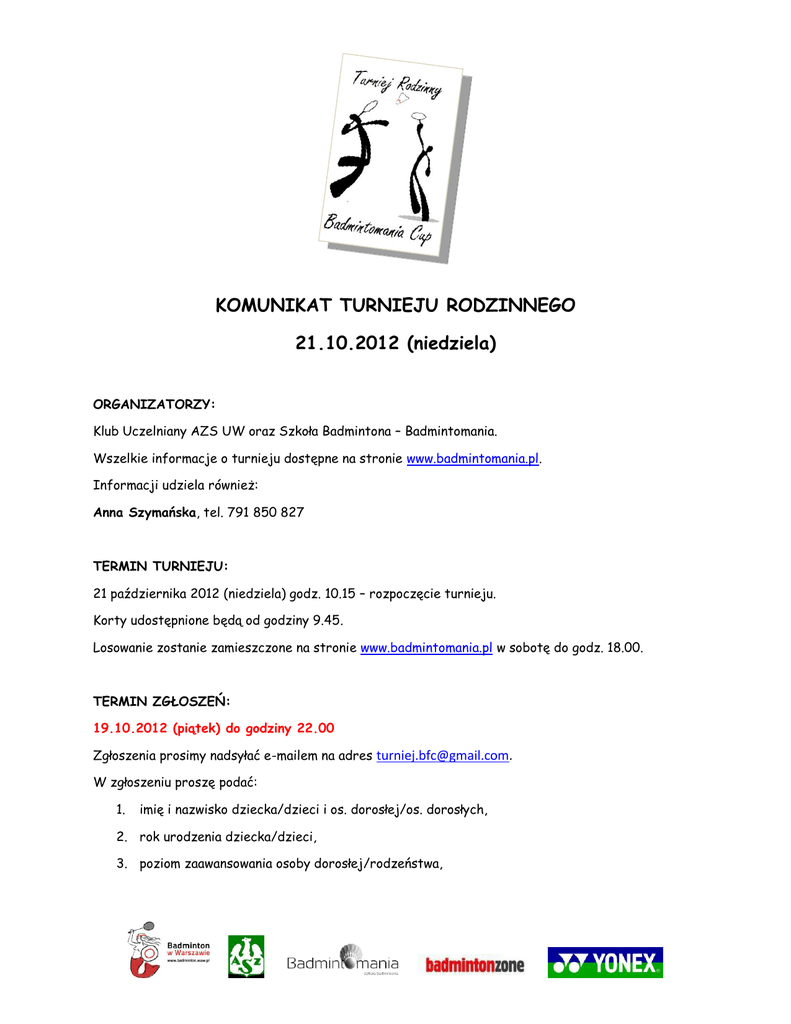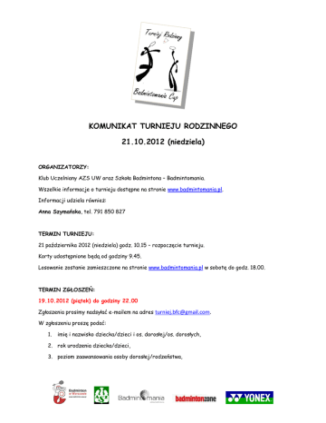 KOMUNIKAT TURNIEJU RODZINNEGO 21.10.2012 (niedziela) ORGANIZATORZY: Klub Uczelniany AZS UW oraz Szkoła Badmintona – Badmintomania. Wszelkie informacje o turnieju dostępne na stronie www.badmintomania.pl. Informacji udziela również: Anna Szymańska, tel. 791 850 827 TERMIN TURNIEJU: 21 października 2012 (niedziela) godz. 10.15 – rozpoczęcie turnieju. Korty udostępnione będą od godziny 9.45. Losowanie zostanie zamieszczone na stronie www.badmintomania.pl w sobotę do godz. 18.00. TERMIN ZGŁOSZEŃ: 19.10.2012 (piątek) do godziny 22.00 Zgłoszenia prosimy nadsyłać e-mailem na adres [email protected]. W zgłoszeniu proszę podać: 1. imię i nazwisko dziecka/dzieci i os. dorosłej/os. dorosłych, 2. rok urodzenia dziecka/dzieci, 3. poziom zaawansowania osoby dorosłej/rodzeństwa, 4. nazwa drużyny (w przypadku braku nazwy w losowaniu zostanie zamieszczone nazwisko). MIEJSCE: Warszawa, hala UW przy ul. Banacha 2a (4 korty). PRAWO GRY: W zawodach mogą uczestniczyć wyłącznie zespoły rodzinne. Za rodzinę uważane są osoby bezpośrednio ze sobą spokrewnione (oboje rodziców i dzieci ale również babcia, dziadek, syn, córka, wnuczek, wnuczka). KATEGORIE TURNIEJU: A. osoba dorosła/starsze rodzeństwo poziom średniozaawansowany/zaawansowany + dziecko do 10 lat (rocznik 2002 i młodsze) lub dwoje dzieci + osoba dorosła lub dziecko + dwie osoby dorosłe, B. osoba dorosła/starsze rodzeństwo poziom początkujący + dziecko do 10 lat (rocznik 2002 i młodsze) lub dwoje dzieci + osoba dorosła lub dziecko + dwie osoby dorosłe, C. osoba dorosła/starsze rodzeństwo poziom średniozaawansowany/zaawansowany + dziecko powyżej 10 lat (rocznik 2001 i starsze) lub dwoje dzieci + osoba dorosła lub dziecko + dwie osoby dorosłe. D. osoba dorosła/starsze rodzeństwo poziom początkujący + dziecko powyżej 10 lat (rocznik 2001 i starsze) lub dwoje dzieci + osoba dorosła lub dziecko + dwie osoby dorosłe. SYSTEM ROZGRYWEK: - zostanie ustalony przez organizatora po zamknięciu listy zgłoszeń i będzie zapewniał drużynie rozegranie minimum dwóch meczów, - aby dana kategoria została rozegrana muszą być zgłoszone min. 3 zespoły rodzinne, - na mecz drużynowy składają się: a) dwa single (os. dorosła/starsze rodzeństwo – os. dorosła/starsze rodzeństwo; dziecko – dziecko), b) debel (os. dorosła/starsze rodzeństwo + dziecko - os. dorosła/starsze rodzeństwo + dziecko), - mecze rozgrywane będą do 1 wygranego seta do 21 punktów; przy wyniku 20:20 gra odbywa się do przewagi 2 punktów, ale nie więcej niż do 30 punktów, - w zawodach obowiązują przepisy PZBad. NAGRODY: - za miejsca 1-3 medale i dyplomy, - każdy uczestnik otrzyma dyplom za udział w turnieju. LOTKI: - każdy uczestnik zobowiązany jest posiadać własne lotki, - obowiązują lotki piórowe, chyba że bezpośrednio zainteresowani postanowią inaczej, - organizator zapewnia możliwość nabycia lotek na miejscu w cenach promocyjnych. OPŁATA STARTOWA: - 45,00 PLN od drużyny Opłatę startową dokonuje się gotówką w dzień turnieju u organizatora przed rozpoczęciem gier. Po opłaceniu wpisowego każdy zawodnik otrzyma darmowy napój i batonik. OPIEKA MEDYCZNA: Zawodnicy biorą udział w zawodach na własną odpowiedzialność. SĘDZIA GLÓWNY TURNIEJU: Anna Szymańska INFORMACJE DODATKOWE: Podczas turniejów wśród uczestników odbędzie się losowanie sportowej niespodzianki.