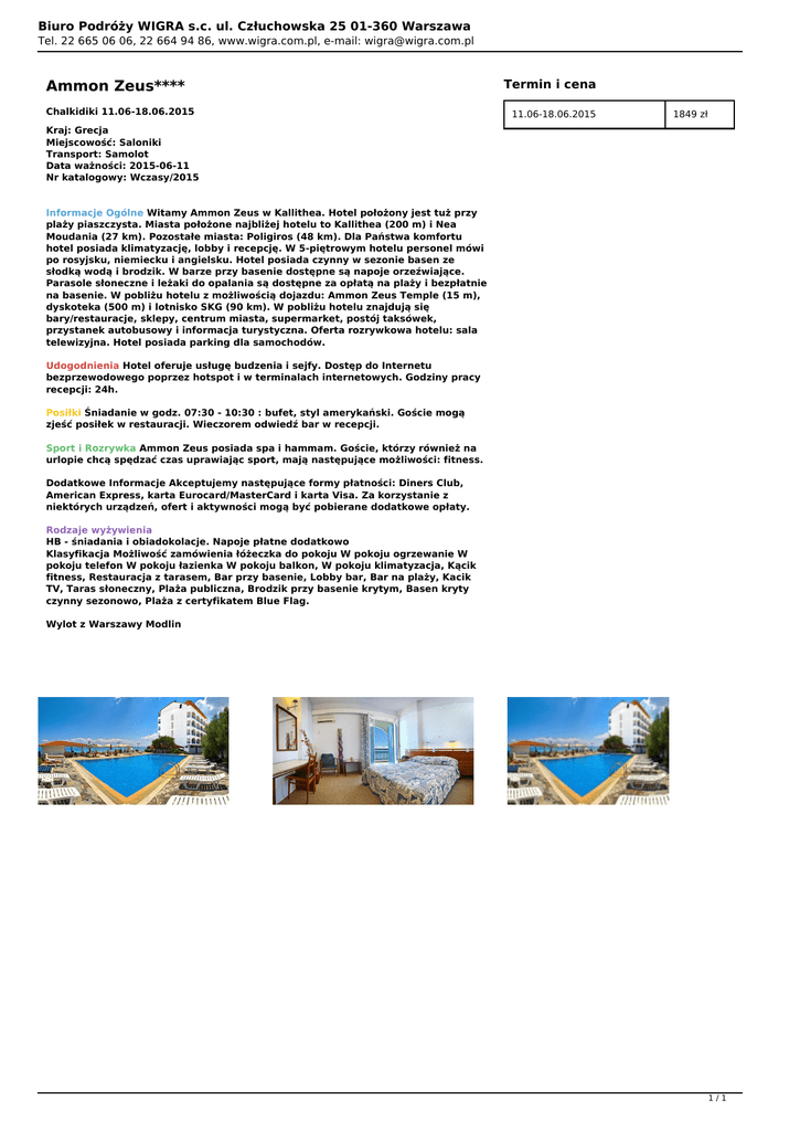 Biuro Podróży WIGRA s.c. ul. Człuchowska 25 01-360 Warszawa Tel. 22 665 06 06, 22 664 94 86, www.wigra.com.pl, e-mail: [email protected] Ammon Zeus**** Chalkidiki 11.06-18.06.2015 Termin i cena 11.06-18.06.2015 1849 zł Kraj: Grecja Miejscowość: Saloniki Transport: Samolot Data ważności: 2015-06-11 Nr katalogowy: Wczasy/2015 Informacje Ogólne Witamy Ammon Zeus w Kallithea. Hotel położony jest tuż przy plaży piaszczysta. Miasta położone najbliżej hotelu to Kallithea (200 m) i Nea Moudania (27 km). Pozostałe miasta: Poligiros (48 km). Dla Państwa komfortu hotel posiada klimatyzację, lobby i recepcję. W 5-piętrowym hotelu personel mówi po rosyjsku, niemiecku i angielsku. Hotel posiada czynny w sezonie basen ze słodką wodą i brodzik. W barze przy basenie dostępne są napoje orzeźwiające. Parasole słoneczne i leżaki do opalania są dostępne za opłatą na plaży i bezpłatnie na basenie. W pobliżu hotelu z możliwością dojazdu: Ammon Zeus Temple (15 m), dyskoteka (500 m) i lotnisko SKG (90 km). W pobliżu hotelu znajdują się bary/restauracje, sklepy, centrum miasta, supermarket, postój taksówek, przystanek autobusowy i informacja turystyczna. Oferta rozrywkowa hotelu: sala telewizyjna. Hotel posiada parking dla samochodów. Udogodnienia Hotel oferuje usługę budzenia i sejfy. Dostęp do Internetu bezprzewodowego poprzez hotspot i w terminalach internetowych. Godziny pracy recepcji: 24h. Posiłki Śniadanie w godz. 07:30 - 10:30 : bufet, styl amerykański. Goście mogą zjeść posiłek w restauracji. Wieczorem odwiedź bar w recepcji. Sport i Rozrywka Ammon Zeus posiada spa i hammam. Goście, którzy również na urlopie chcą spędzać czas uprawiając sport, mają następujące możliwości: fitness. Dodatkowe Informacje Akceptujemy następujące formy płatności: Diners Club, American Express, karta Eurocard/MasterCard i karta Visa. Za korzystanie z niektórych urządzeń, ofert i aktywności mogą być pobierane dodatkowe opłaty. Rodzaje wyżywienia HB - śniadania i obiadokolacje. Napoje płatne dodatkowo Klasyfikacja Możliwość zamówienia łóżeczka do pokoju W pokoju ogrzewanie W pokoju telefon W pokoju łazienka W pokoju balkon, W pokoju klimatyzacja, Kącik fitness, Restauracja z tarasem, Bar przy basenie, Lobby bar, Bar na plaży, Kacik TV, Taras słoneczny, Plaża publiczna, Brodzik przy basenie krytym, Basen kryty czynny sezonowo, Plaża z certyfikatem Blue Flag. Wylot z Warszawy Modlin 1/1 Powered by TCPDF (www.tcpdf.org)