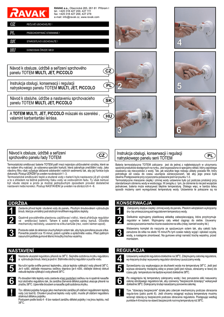 RAVAK a.s., Obecnická 285, 261 81 Příbram I tel.: +420 318 427 200, 427 111 fax: +420 318 427 269, 427 278 e-mail: [email protected], www.ravak.com PEČLIVĚ USCHOVEJTE ! PRZECHOWYWAĆ STARANNIE ! STAROSTLIVO USCHOVAJTE ! GONDOSAN ŐRIZZE MEG! Návod k obsluze, údržbě a seřízení sprchového panelu TOTEM MULTI, JET, PICCOLO CZ Instrukcja obsługi, konserwacji i regulacji natryskowego panelu TOTEM MULTI, JET, PICCOLO PL Návod k obsluhe, údržbe a nastaveniu sprchovacieho panelu TOTEM MULTI, JET, PICCOLO SK A TOTEM MULTI, JET, PICCOLO műszaki és szerelési , valamint karbantartási leírása. HU Návod k obsluze, údržbě a seřízení sprchového panelu řady TOTEM CZ Termostatická směšovací baterie TOTEM patří mezi nejsnáze udržovatelné výrobky, které se na našem trhu nabízejí. Je vybavena speciální kartuší, která zabraňuje znečištění vody. Jako všechny filtry však vyžaduje občasné odstranění vodních sedimentů tak, aby její funkce byla dokonalá. Postup ÚDRŽBY je uveden na obrázcích 1 - 3. Termostatické směšování teplé a studené vody v baterii bylo nastaveno již při výrobě a to s ohledem na běžné podmínky tlaku vody ve vodovodním řadu. Ty však nemusí být všude stejné a proto je možné jednoduchým způsobem provést dodatečné nastavení nebo korekci. Postup NASTAVENÍ je uveden na obrázcích 4 - 6. ÚDRŽBA PL Bateria termostatyczna TOTEM zaliczana jest do jednej z najłatwiejszych w utrzymaniu spośród produktów dostępnych na rynku. Jest wyposażona w specjalny wkład, który zapobiega osadzaniu się nieczystości z wody. Tak, jak wszytkie tego rodzaju układy posiada filtr, który potrzebuje od czasu do czasu usunięcia zanieczyszczeń, tak aby jego praca była idealna.Postępowanie przy czyszczeniu pokazane jest na rysunku 1-3. Termostatyczne mieszanie ciepłej i zimnej wody ustawione było już podczas produkcji przy standartowym ciśnieniu wody w wodociągu. W związku z tym, że ciśnienie to nie jest wszędzie jednakowe, bateria może wskazywać błędnie temperaturę. Dlatego więc, w bardzo łatwy sposób możemy sami wyregulować temperaturę wody. Ustawienia te pokazane są na KONSERWACJA Zastavte přívod teplé i studené vody do panelu. Plochým šroubovákem vyšroubujte šroub, který je umístěný pod otočným knoflíkem regulátoru teploty. Zakręcamy dopływ ciepłej i zimnej wody do panelu. Płaskim wkrętakiem wykręcamy śru- bę umieszczoną pod regulatorem temperatury wody. Opatrně povytáhněte plastovou zajišťovací vidlici, která přidržuje regulátor ve směšovací baterii. Tahem k sobě vyjměte celou kartuš. Očistěte mechanicky nečistoty, usazené na sítku kartuše (rez, vodní kámen apod). Delikatnie wyjmujemy plastikową wkładkę zabezpieczającą, która przytrzymuje regulator w baterii. Wyjmujemy cały wkład ciągnąc do siebie. Usuwamy zanieczyszczenia mecha-niczne osadzone na sitku (rdzę, kamień wodny itd.) Postavte celek do sklenice s kuchyňským octem tak, aby byla ponořena pouze sítka. Ponechte působit cca 15 minut, potom vyjměte a opláchněte vodou. Před zpětným nasunutím potřete gumové těsnicí kroužky trochou vazelíny. Wstawiamy komplet do naczynia ze spożywczym octem tak, aby całość była zanużona do sitka na około 15 minut.Po tym czasie należy wyjąć i opłukać czystą wodą, a następnie zmontować. Na gumowe oringi nanieść trochę wazeliny, przed montażem. NASTAVENÍ ! Instrukcja obsługi, konserwacji i regulacji natryskowego panelu serii TOTEM REGULACJA Nastavte ukazatel regulátoru přesně na 38 C. Sejměte ozdobnou krytku regulátoru a vyšroubujte šroub, který je pod ní. Stáhněte otočný regulátor a pusťte vodu. Ustawiamy wskaźnik regulatora dokładnie na 38 C. Zdejmujemy osłonkę regulatora, wy-kręcamy śrubę i wysuwamy regulator obrotowy i puszczamy wodę. Na ruční sprše ověřte pomocí teploměru, zda je teplota vytékající vody přesně 38 C. Je-li vyšší, otáčejte mosaznou osičkou doprava (je-li nižší, otáčejte doleva) dokud nebude teplota vytékající vody přesně 38 C. Sprawdzamy czy wypływająca ze słuchawki woda ma temperaturę 38 C. Jeśli jest wyższa obracamy mosiężną ośkę w prawo (jeśli jest niższa, obracamy w lewo) do czasu gdy temperatura nie będzie wynosić dokładnie 38 C. Po dosažení této teploty vodu zastavte a bez pootočení osičkou na ni opatrně nasaďte kryt otočného regulátoru tak, že zarážka (červená dětská pojistka) ukazuje přesně na značku 38 C. Upevněte šroubem a nasaďte zpět ozdobnou krytku. Po osiągnięciu tej temperatury zakręcamy wodę i bez poruszenia ośki nasuwamy osłonę obrotowego regulatora tak, aby czerwony "bezpiecznik dziecięcy" wskazywał dokładnie 38 C. Dokręcamy śrubęi nasadzamy ponownie osłonkę. Tzv. dětská pojistka funguje jako mechanická zarážka při otáčení regulátorem teploty vody (viz bod 6). Chcete-li používat teplotu vody vyšší, musíte při otáčení regulátoru stisknout dětskou pojistku. Postupem podle bodů 4 - 6 lze nastavit zarážku dětské pojistky i na jinou teplotu, než 38 C. Tzw. "dziecięcy bezpiecznik" działa jako zderzak mechaniczny podczas obracania regula-tora (patrz punkt 6). Jeśli chcemy osiągnąć wyższą temperaturę musimy wcisnąć dziecię-cy bezpiecznik podczas obracania regulatora. Postępując według punktów 4-6 można na-stawić bezpiecznik na inną temperaturę niż 38 C. Návod k obsluhe, údržbe a nastaveniu sprchovacieho panelu radu TOTEM SK Termostatická zmiešovacia batéria TOTEM patrí medzi najľahšie udržiavateľné výrobky, ktoré sa na našom trhu ponúkajú. Je vybavená špeciálnou kartušou, ktorá zabraňuje znečisteniu vody. Ako všetky filtre však vyžaduje občasné odstránenie vodných sedimentov tak, aby jeho funkcia bola dokonalá. Postup ÚDRŽBY je uvedený na obrázkoch 1 - 3. Termostatické zmiešovanie teple
