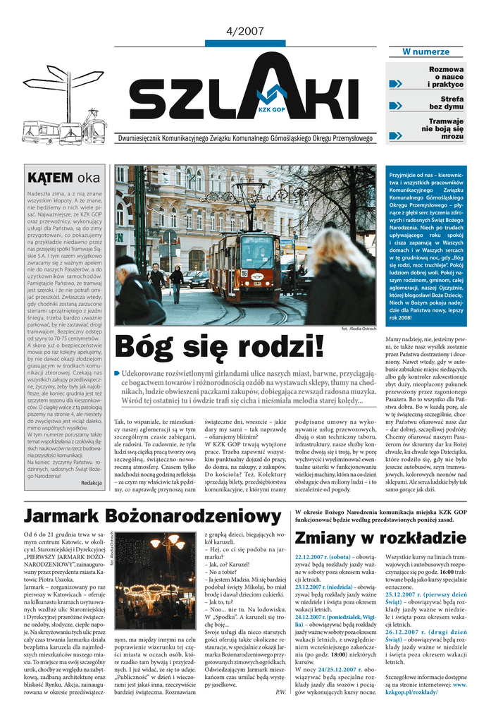 4/2007 a W numerze szl ki Dwumiesięcznik Komunikacyjnego Związku Komunalnego Górnośląskiego Okręgu Przemysłowego KĄTEM oka Nadeszła zima, a z nią znane wszystkim kłopoty. A że znane, nie będziemy o nich wiele pisać. Najważniejsze, że KZK GOP oraz przewoźnicy, wykonujący usługi dla Państwa, są do zimy przygotowani, co pokazujemy na przykładzie niedawno przez nas przejętej spółki Tramwaje Śląskie S.A. I tym razem wyjątkowo zwracamy się z ważnym apelem nie do naszych Pasażerów, a do użytkowników samochodów. Pamiętajcie Państwo, że tramwaj jest szeroki, i że nie potrafi omijać przeszkód. Zwłaszcza wtedy, gdy chodniki zostaną zarzucone stertami uprzątniętego z jezdni śniegu, trzeba bardzo uważnie parkować, by nie zastawiać drogi tramwajom. Bezpieczny odstęp od szyny to 70-75 centymetrów. A skoro już o bezpieczeństwie mowa: po raz kolejny apelujemy, by nie dawać okazji złodziejom grasującym w środkach komunikacji zbiorowej. Czekają nas wszystkich zakupy przedświąteczne, życzymy, żeby były jak najobfitsze, ale koniec grudnia jest też szczytem sezonu dla kieszonkowców. O ciągłej walce z tą patologią piszemy na stronie 4, ale niestety do zwycięstwa jest wciąż daleko, mimo wspólnych wysiłków. W tym numerze poruszamy także temat wspołdziałania z czołówką śląskich naukowców na rzecz budowania przyszłości komunikacji. Na koniec życzymy Państwu rodzinnych, radosnych Świąt Bożego Narodzenia! Redakcja Strefa bez dymu Tramwaje nie boją się mrozu Przyjmijcie od nas – kierownictwa i wszystkich pracowników Komunikacyjnego Związku Komunalnego Górnośląskiego Okręgu Przemysłowego – płynące z głębi serc życzenia zdrowych i radosnych Świąt Bożego Narodzenia. Niech po trudach upływającego roku spokój i cisza zapanują w Waszych domach i w Waszych sercach w tę grudniową noc, gdy „Bóg się rodzi, moc truchleje”. Pokój ludziom dobrej woli. Pokój naszym rodzinom, gminom, całej aglomeracji, naszej Ojczyźnie, której błogosławi Boże Dziecię. Niech w Bożym pokoju nadejdzie dla Państwa nowy, lepszy rok 2008! fot. Alodia Ostroch Bóg się rodzi! Udekorowane rozświetlonymi girlandami ulice naszych miast, barwne, przyciągające bogactwem towarów i różnorodnością ozdób na wystawach sklepy, tłumy na chodnikach, ludzie obwieszeni paczkami zakupów, dobiegająca zewsząd radosna muzyka. Wśród tej ostatniej tu i ówdzie trafi się cicha i nieśmiała melodia starej kolędy... Tak, to wspaniale, że mieszkańcy naszej aglomeracji są w tym szczególnym czasie zabiegani, ale radośni. To cudownie, że tylu ludzi swą ciężką pracą tworzy ową szczególną, świąteczno-noworoczną atmosferę. Czasem tylko nadchodzi nocną godziną refleksja – za czym my właściwie tak pędzimy, co naprawdę przynoszą nam świąteczne dni, wreszcie – jakie dary my sami – tak naprawdę – ofiarujemy bliźnim? W KZK GOP trwają wytężone prace. Trzeba zapewnić wszystkim punktualny dojazd do pracy, do domu, na zakupy, z zakupów. Do kościoła? Też. Kolektury sprzedają bilety, przedsiębiorstwa komunikacyjne, z którymi mamy fot. Alodia Ostroch Jarmark Bożonarodzeniowy Od 6 do 21 grudnia trwa w samym centrum Katowic, w okolicy ul. Staromiejskiej i Dyrekcyjnej „PIERWSZY JARMARK BOŻONARODZENIOWY”, zainaugurowany przez prezydenta miasta Katowic Piotra Uszoka. Jarmark – zorganizowany po raz pierwszy w Katowicach – oferuje na kilkunastu kramach usytuowanych wzdłuż ulic Staromiejskiej i Dyrekcyjnej przeróżne świąteczne ozdoby, słodycze, ciepłe napoje. Na skrzyżowaniu tych ulic przez cały czas trwania Jarmarku działa bezpłatna karuzela dla najmłodszych mieszkańców naszego miasta. To miejsce ma swój szczególny urok, choćby ze względu na zabytkową, zadbaną architekturę oraz bliskość Rynku. Akcja, zainaugurowana w okresie przedświątecz- Rozmowa o nauce i praktyce nym, ma między innymi na celu poprawienie wizerunku tej części miasta w oczach osób, które rzadko tam bywają i przyjezdnych. I już widać, że się to udaje. „Publiczność” w dzień i wieczorami jest jakaś inna, rzeczywiście bardziej świąteczna. Rozmawiam z grupką dzieci, biegających wokół karuzeli. – Hej, co ci się podoba na jarmarku? – Jak, co? Karuzel! – No a tobie? – Ja jestem Madzia. Mi się bardziej podobał święty Mikołaj, bo miał brodę i dawał dzieciom cukierki. – Jak to, tu? – Noo... nie tu. Na lodowisku. W „Spodku”. A karuzeli się trochę boję... Swoje usługi dla nieco starszych gości oferują także okoliczne restauracje, w specjalnie z okazji Jarmarku Bożonarodzeniowego przygotowanych zimowych ogródkach. Odwiedzającym Jarmark mieszkańcom czas umilać będą występy jasełkowe. P.W. podpisane umowy na wykonywanie usług przewozowych, dbają o stan techniczny taboru, infrastruktury, nasze służby kontrolne dwoją się i troją, by w porę wychwycić i wyeliminować ewentualne usterki w funkcjonowaniu wielkiej machiny, która na co dzień obsługuje dwa miliony ludzi – i to niezależnie od pogody. Mamy nadzieję, nie, jesteśmy pewni, że także nasz wysiłek zostanie przez Państwa dostrzeżony i doceniony. Nawet wtedy, gdy w autobusie zabraknie miejsc siedzących, albo gdy kontroler zakwestionuje zbyt duży, nieopłacony pakunek przewożony przez zagonionego Pasażera. Bo to wszystko dla Państwa dobra. Bo w każdą porę, ale w tę świąteczną szczególnie, chcemy Państwu ofiarować nasz dar – dar dobrej, szczęśliwej podróży. Chcemy ofiarować naszym Pasażerom ów skromny dar ku Bożej chwale, ku chwale tego Dzieciątka, które rodziło się, gdy nie było jeszcze autobusów, szyn tramwajowych, kolorowych neonów nad sklepami. Ale serca ludzkie były tak samo gorące jak dziś. W okresie Bożego Narodzenia komunikacja miejska KZK GOP funkcjonować będzie według przedstawionych poniżej zasad. Zmiany w rozkładzie 22.12.2007 r. (sobot