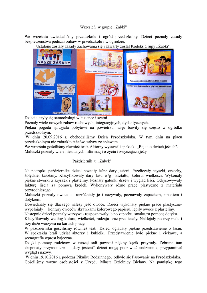 Wrzesień w grupie ,,Żabki'' We wrześniu zwiedzaliśmy przedszkole i ogród przedszkolny. Dzieci poznały zasady bezpieczeństwa podczas zabaw w przedszkolu i w ogrodzie. Ustalone zostały zasady zachowania się i zawarty został Kodeks Grupy ,,Żabki''. Dzieci uczyły się samoobsługi w łazience i szatni. Poznały wiele nowych zabaw ruchowych, integracyjnych, dydaktycznych. Piękna pogoda sprzyjała pobytowi na powietrzu, więc bawiły się często w ogródku przedszkolnym. W dniu 20.09.2016 r. obchodziliśmy Dzień Przedszkolaka. W tym dniu na placu przedszkolnym nie zabrakło tańców, zabaw ze śpiewem. We wrześniu gościliśmy również teatr. Aktorzy wystawili spektakl ,,Bajka o dwóch jeżach''. Maluszki poznały wiele nieznanych informacji o życiu i zwyczajach jeży. Październik u ,,Żabek'' Na początku października dzieci poznały leśne dary jesieni. Przeliczały szyszki, orzechy, żołędzie, kasztany. Klasyfikowały dary lasu w/g kształtu, koloru, wielkości. Wykonały piękne stworki z szyszek i plasteliny. Poznały gatunki drzew i wygląd liści. Odrysowywały fakturę liścia za pomocą kredek. Wykonywały różne prace plastyczne z materiału przyrodniczego. Maluszki poznały owoce - rozróżniały je i nazywały, poznawały zapachem, smakiem i dotykiem. Dowiedziały się dlaczego należy jeść owoce. Dzieci wykonały piękne prace plastycznewypełniały kontury owoców skrawkami kolorowego papieru, lepiły owoce z plasteliny. Następnie dzieci poznały warzywa- rozpoznawały je po zapachu, smaku,za pomocą dotyku. Klasyfikowały według koloru, wielkości, rodzaju oraz przeliczały. Naklejały po trzy małe i trzy duże warzywa na kartach pracy. W październiku gościliśmy również teatr. Dzieci oglądały piękne przedstawienie o Jasiu. W spektaklu brali udział aktorzy i kukiełki. Przedstawienie było piękne i ciekawe, a scenografia wprost bajeczna. Dzięki pomocy rodziców w naszej sali powstał piękny kącik przyrody. Zebrane tam eksponaty przyrodnicze - ,,dary jesieni''' dzieci mogą podziwiać codziennie, przypominać wygląd i nazwy. W dniu 19.10.2016 r. podczas Pikniku Rodzinnego, odbyło się Pasowanie na Przedszkolaka. Gościliśmy ważne osobistości z Urzędu Miasta Dzielnicy Bielany. Na pamiątkę tego wydarzenia grupa otrzymała prezent- pięknego słonia, który teraz w sali ,, czuwa '' nad naszą grupą. Maluszki przebrane w stroje żabek, przedstawiły przygotowany program artystyczny. Pani Dyrektor zadawała dzieciom pytania egzaminacyjne, na które dzieci odpowiedziały bezbłędnie. W nagrodę za tak piękne odpowiedzi pani Dyrektor każde dziecko pasowała na Przedszkolaka. Dzieci otrzymały dyplomy i upominki, a tort o kształcie żabki smakował wyśmienicie. Każdy mógł spróbować zdrowych potraw z warzyw i owoców oraz uczestniczyć w zabawach i tańcach oraz warsztatach. We wrześniu Żabki: uczyły się wiersza ,, Mam 3 latka'' Mam 3 latka 3 i pół, sięgam brodą ponad stół. Mam fartuszek z muchomorkiem, do przedszkola chodzę z workiem. Pantofelki pięknie zmieniam, myję rączki do jedzenia, Wszystko zjadam z talerzyka. Tańczę- kiedy gra muzyka. Umiem bajkę o koteczku, o upartym koziołeczku i o piesku, co był w polu- nauczyłem się w przedszkolu. śpiewały piosenkę ,,Przedszkolaczek''. I. Jestem sobie przedszkolaczek. Nie grymaszę i nie płaczę. Na bębenku marsza gram Ref. Ram tam tam, ram tam tam. II. Kto jest beksą i mazgajem, ten się do nas nie nadaje, niechaj w domu siedzi sam. Ref. III. Mamy klocki, kredki, farby. To są nasze wspólne skarby, bardzo dobrze tutaj nam. Ref. IV. Mamy tu kolegów wiele, razem bawić się weselej, bo przyjaciół dobrych mam. uczyły się piosenki ,,Kotek Puszek'' Kotek Puszek z czarną łatką, dziś w przedszkolu był z Agatką. A z kieszeni u fartuszka wyglądały małe uszka. Nagle ruszył się fartuszek, na podłogę skoczył Puszek. Teraz kotku będziesz z nami, my już Ciebie nie oddamy. W październiku ,,Żabki '': uczyły się wiersza,,Gruszka'' Wpadła gruszka do fartuszka, a za gruszką dwa jabłuszka, a śliweczka wpaść nie chciała, bo śliweczka niedojrzała. śpiewały: ,,Cebulka i buraczek'' Cebulka, cebulka- okrągła jak kulka. Buraczka złapała, zatańcować chciała. Buraczek, buraczek, miał czerwony fraczek, z cebulką tańcował, nóżek nie żałował.