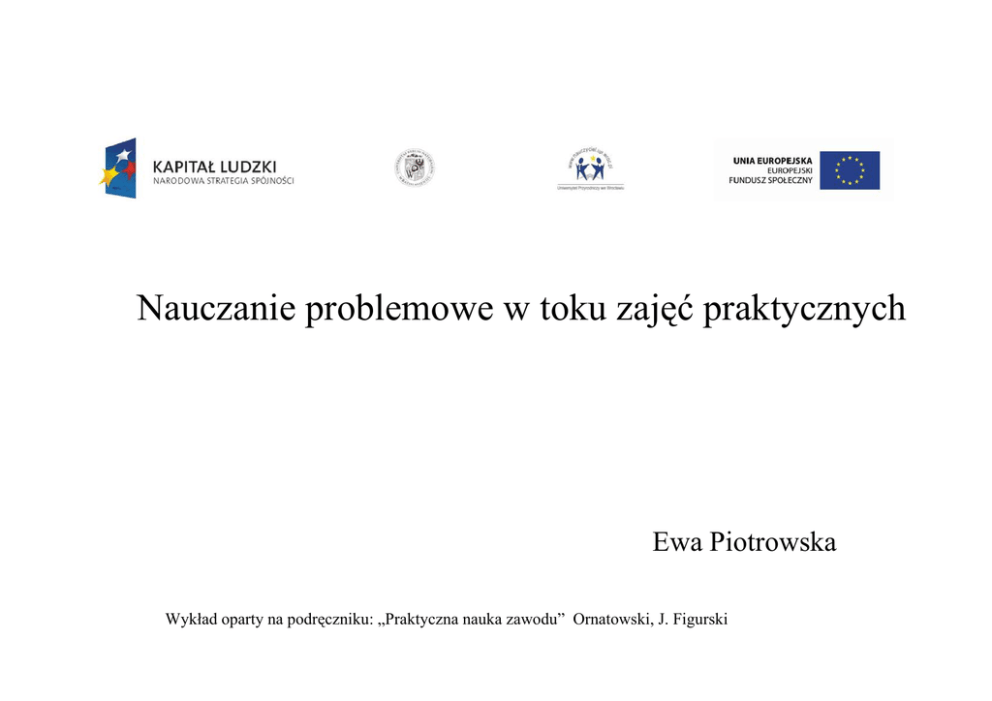 Nauczanie problemowe w toku zajęć praktycznych Ewa Piotrowska Wykład oparty na podręczniku: „Praktyczna nauka zawodu” Ornatowski, J. Figurski Nauczanie problemowe znajduje zastosowanie: • w nauczaniu teoretycznych przedmiotów zawodowych • w kształceniu praktycznym "Nauczyciel przedmiotów zawodowych w zakresie organizacji usług gastronomicznych i hotelarstwa oraz architektury krajobrazu - studia podyplomowe" projekt realizowany w ramach Programu Operacyjnego Kapitał Ludzki współfinansowanego ze środków Europejskiego Funduszu Społecznego. Uniwersytet Przyrodniczy we W rocławiu ul. C.K. Norwida 25/27, 50-375 W rocław, tel.: +48 (0)71 320 5108, fax: +48 (0)71 320 5137, email: [email protected] Dydaktyczna definicja problemu W dydaktyce problem to trudność o charakterze teoretycznym lub praktycznym, którą uczeń pokonuje przez aktywność badawczą. "Nauczyciel przedmiotów zawodowych w zakresie organizacji usług gastronomicznych i hotelarstwa oraz architektury krajobrazu - studia podyplomowe" projekt realizowany w ramach Programu Operacyjnego Kapitał Ludzki współfinansowanego ze środków Europejskiego Funduszu Społecznego. Uniwersytet Przyrodniczy we W rocławiu ul. C.K. Norwida 25/27, 50-375 W rocław, tel.: +48 (0)71 320 5108, fax: +48 (0)71 320 5137, email: [email protected] Fazy rozwiązywania problemów przez uczniów: • tworzenie sytuacji problemowej •wytwarzanie pomysłów rozwiązania ( stawianie hipotez) •sprawdzanie rozwiązania (weryfikacja hipotez) "Nauczyciel przedmiotów zawodowych w zakresie organizacji usług gastronomicznych i hotelarstwa oraz architektury krajobrazu - studia podyplomowe" projekt realizowany w ramach Programu Operacyjnego Kapitał Ludzki współfinansowanego ze środków Europejskiego Funduszu Społecznego. Uniwersytet Przyrodniczy we W rocławiu ul. C.K. Norwida 25/27, 50-375 W rocław, tel.: +48 (0)71 320 5108, fax: +48 (0)71 320 5137, email: [email protected] Istota nauczania problemowego Istota nauczania problemowego polega na tym, że stosując metody problemowe uczniowie zdobywają wiedzę nie na zasadzie gromadzenia informacji, ich zapamiętywania i rozumienia, jak metodach podających, lecz poprzez złożone procesy myślowe (analizę, syntezę, porównywanie, abstrahowanie i uogólnienie). "Nauczyciel przedmiotów zawodowych w zakresie organizacji usług gastronomicznych i hotelarstwa oraz architektury krajobrazu - studia podyplomowe" projekt realizowany w ramach Programu Operacyjnego Kapitał Ludzki współfinansowanego ze środków Europejskiego Funduszu Społecznego. Uniwersytet Przyrodniczy we W rocławiu ul. C.K. Norwida 25/27, 50-375 W rocław, tel.: +48 (0)71 320 5108, fax: +48 (0)71 320 5137, email: [email protected] Nauczanie problemowe jako strategia kształcenia Nauczanie problemowe nie jest metodą nauczania, lecz jest strategią kształcenia, która polega na takiej organizacji procesu dydaktycznego, który sprzyja rozwojowi myślenia (rozwiązaniu problemu). "Nauczyciel przedmiotów zawodowych w zakresie organizacji usług gastronomicznych i hotelarstwa oraz architektury krajobrazu - studia podyplomowe" projekt realizowany w ramach Programu Operacyjnego Kapitał Ludzki współfinansowanego ze środków Europejskiego Funduszu Społecznego. Uniwersytet Przyrodniczy we W rocławiu ul. C.K. Norwida 25/27, 50-375 W rocław, tel.: +48 (0)71 320 5108, fax: +48 (0)71 320 5137, email: [email protected] Nauczanie problemowe jako strategia kształcenia cd. Strategia kształcenia to ogół celów, środków i metod przygotowywanych i wykorzystywanych przez nauczycieli do osiągnięcia jak najlepszych efektów w ich działalności. "Nauczyciel przedmiotów zawodowych w zakresie organizacji usług gastronomicznych i hotelarstwa oraz architektury krajobrazu - studia podyplomowe" projekt realizowany w ramach Programu Operacyjnego Kapitał Ludzki współfinansowanego ze środków Europejskiego Funduszu Społecznego. Uniwersytet Przyrodniczy we W rocławiu ul. C.K. Norwida 25/27, 50-375 W rocław, tel.: +48 (0)71 320 5108, fax: +48 (0)71 320 5137, email: [email protected] Drogi rozwiązywania problemów: Na potrzeby kształcenia zawodowego wyodrębniono trzy drogi rozwiązywania problemów, charakteryzujące się innym wynikiem, inną sytuacją problemową i inną procedurą uzyskiwania wyników. Są to: • droga odkryć •droga wynalazcza •droga optymalnego planu działania T. Nowacki "Nauczyciel przedmiotów zawodowych w zakresie organizacji usług gastronomicznych i hotelarstwa oraz architektury krajobrazu - studia podyplomowe" projekt realizowany w ramach Programu Operacyjnego Kapitał Ludzki współfinansowanego ze środków Europejskiego Funduszu Społecznego. Uniwersytet Przyrodniczy we W rocławiu ul. C.K. Norwida 25/27, 50-375 W rocław, tel.: +48 (0)71 320 5108, fax: +48 (0)71 320 5137, email: [email protected] 1. Droga odkryć Polega na takim modelowaniu działalności uczniów, aby sami dochodzili do pewnych odkryć nowych informacji lub praw. Postępowanie ucznia na tej drodze jest podobne do postępowania uczonego, odkrywającego nowe prawa lub wzbogacającego wiedzę naukową. "Nauczyciel przedmiotów zawodowych w zakresie organizacji usług gastronomicznych i hotelarstwa oraz architektury krajobrazu - studia podyplomowe" projekt realizowany w ramach Programu Operacyjnego Kapitał Ludzki współfinansowanego ze środków Europejskiego Funduszu Społecznego. Uniwersytet Przyrodniczy we W rocławiu ul. C.K. Norwida 25/27, 50-375 W rocław, tel.: +48 (0)71 320 5108, fax: +48 (0)71 320 5137, email: [email protected] 2. Droga wynalazcza Polega na takim modelowaniu działalności uczniów w której ujawnia się postępowanie podobne do postępowania konstruktora lub wynalazcy. Kształcenie zawodowe potrzebuje takich modeli nauczania problemowego, w którym ujawnia się stosowanie teorii do działania praktycznego. Wynalazca, nawet jeśli nic nie dodaje do systemu wiedzy naukowej, to na jej podstawie t