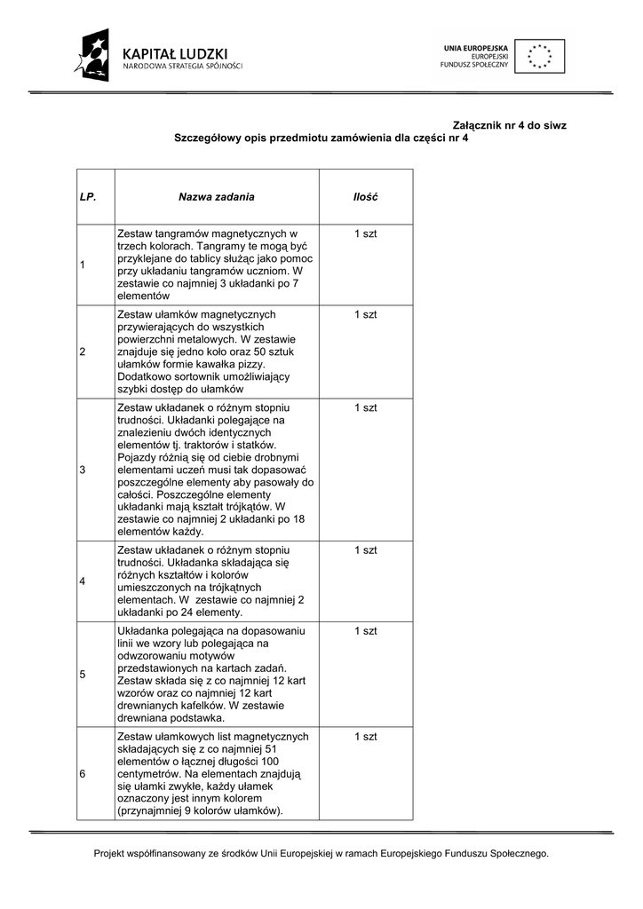 Załącznik nr 4 do siwz Szczegółowy opis przedmiotu zamówienia dla części nr 4 LP. Nazwa zadania Ilość 1 szt 1 Zestaw tangramów magnetycznych w trzech kolorach. Tangramy te mogą być przyklejane do tablicy służąc jako pomoc przy układaniu tangramów uczniom. W zestawie co najmniej 3 układanki po 7 elementów 1 szt 2 Zestaw ułamków magnetycznych przywierających do wszystkich powierzchni metalowych. W zestawie znajduje się jedno koło oraz 50 sztuk ułamków formie kawałka pizzy. Dodatkowo sortownik umożliwiający szybki dostęp do ułamków 1 szt 3 Zestaw układanek o różnym stopniu trudności. Układanki polegające na znalezieniu dwóch identycznych elementów tj. traktorów i statków. Pojazdy różnią się od ciebie drobnymi elementami uczeń musi tak dopasować poszczególne elementy aby pasowały do całości. Poszczególne elementy układanki mają kształt trójkątów. W zestawie co najmniej 2 układanki po 18 elementów każdy. 1 szt 4 Zestaw układanek o różnym stopniu trudności. Układanka składająca się różnych kształtów i kolorów umieszczonych na trójkątnych elementach. W zestawie co najmniej 2 układanki po 24 elementy. 1 szt 5 Układanka polegająca na dopasowaniu linii we wzory lub polegająca na odwzorowaniu motywów przedstawionych na kartach zadań. Zestaw składa się z co najmniej 12 kart wzorów oraz co najmniej 12 kart drewnianych kafelków. W zestawie drewniana podstawka. 1 szt 6 Zestaw ułamkowych list magnetycznych składających się z co najmniej 51 elementów o łącznej długości 100 centymetrów. Na elementach znajdują się ułamki zwykłe, każdy ułamek oznaczony jest innym kolorem (przynajmniej 9 kolorów ułamków). Projekt współfinansowany ze środków Unii Europejskiej w ramach Europejskiego Funduszu Społecznego. 7 Zestaw matematyczny z kartami zadań 1 szt 14 szt 8 Zestaw plansz wraz z Tangramowymi kształty - 4 plansze do gry 80 figur w 3 kształtach 1 kostka 1 klepsydra instrukcja 9 Pentomino - zestaw grupowy, 6 kompletów 8 szt 3 szt 10 Układanka dodawanie i odejmowanie do 1000 formie trójkątów. Układanka polega na dopasowaniu do boków trójkąta rozwiązań znajdujących się na bokach. W zestawie co najmniej 2 układanki po 24 trójkąty o boku co najmniej 6 cm. 3 szt 11 Układanka pozwalająca na ćwiczenie umiejętności ważenia oraz poprawnego przeliczania wag. Układanka polega na dopasowanie poszczególnych miar wagowych wyrażonych w różnych postaciach. Elementy układanki są trójkątami. W zestawie co najmniej 2 układanki po 24 trójkąty o boku co najmniej 6 cm. 3 szt 12 Układanka mnożenie i dzielenie do 1000 formie trójkątów. Układanka polega na dopasowaniu do boków trójkąta rozwiązań znajdujących się na bokach. W zestawie co najmniej 2 układanki po 24 trójkąty o boku co najmniej 6 cm. 3 szt 13 Układanka mnożenie i dzielenie do 100 formie trójkątów. Układanka polega na dopasowaniu do boków trójkąta rozwiązań znajdujących się na bokach. W zestawie co najmniej 2 układanki po 24 trójkąty o boku co najmniej 6 cm. 3 szt 14 Układanka pomagająca utrwalenia wiadomości z zapisu ułamka oraz zamiany ułamka niewłaściwego na ułamek właściwy. Układanka o różnym stopniu trudności. Elementy układanki są trójkątami o boku około 6 cm. W zestawie 2 układanki po 24 elementy każda. 3 szt 15 Układanka utrwalenia wiadomości z zapisu ułamka oraz zamiany ułamka zwykłego na dziesiętny. Układanka o różnym stopniu trudności. Elementy układanki są trójkątami o boku około 6 cm. W zestawie 2 układanki po 24 elementy każda 3 szt 16 Układanka pomagające dzieciom utrwalenie czasu. Elementy układanki prezentują czasu formie tarczy zegarowej oraz czasu zapisywanego Projekt współfinansowany ze środków Unii Europejskiej w ramach Europejskiego Funduszu Społecznego. cyfrowo. Należy dopasować tą samą godzinę wskazaną na zegarze tarczowym i cyfrowym. Elementy układanki są trójkątami o boku około 6 cm. W zestawie 2 układanki po 24 elementy każda. 3 szt 17 Układanka polegająca na dopasowaniu do siebie czasu zapisywanego w różnych postaciach. Elementy układanki są trójkątami o boku około 6 cm. W zestawie 2 układanki po 24 elementy każda. 1 szt 18 Układanka składająca się z trójkątów równobocznych. Przy pomocy różnych kafelek można układać różnorakie kształty, obrazy oraz wzory. W zestawie co najmniej 8 trójkątów równobocznych ( 4 czarne oraz białe) oraz co najmniej 12 kart ze wzorami. 1 szt 19 Układanka polegająca na dopasowaniu elementów we wzory przedstawione na kartach zadań. Zestaw składa się z co najmniej 14 kart wzorów oraz co najmniej 32 kart drewnianych kafelków. Kształty na kafelkach, po ułożeniu dają kształt koła. 1 szt 20 Tradycyjna logiczna chińska układanka składająca się z co najmniej 30 kompletów tangramów (po 7 elementów każdy) w co najmniej 4 kolorach. 3 szt 21 Zestaw pasków o różnej długości składający się z co najmniej 74 elementów plus 2 kątomierze Każda długość odpowiada jednemu kolorowi. Za pomocą łączenia pasków uczniowie poznają geometrię płaską. 1 szt 22 Zestaw liter alfabetu w różnych kolorach wraz z paskiem do nawlekania. Za pomocą liter oraz paska do nawlekania uczniowie poznają litery oraz wyrazy. Wysokość litery co najmniej 3,2 centymetra. W zestawie co najmniej 260 liter w 10 kolorach oraz co najmniej 15 sznurków. 1 szt 23 Paski o różnej długości, które pozwalają dzieciom na ułożenie różnych kształtów. W skład zestawu w chodzi co najmniej 68 elementów o różnych długościach oraz przynajmniej 200 metalowych zatyczek. Paski łączą się ze sobą w całość za pomocą zatyczek. Zbiór zgadywanek wraz z rozwiązaniami w formie obrazków. Za pomocą zgadywanek uczeń kształtuje logiczne 1 szt 24 Projekt współfinansowany ze środków Unii Europejskiej w ramach Europejskiego Funduszu Społecznego. myślenie. W