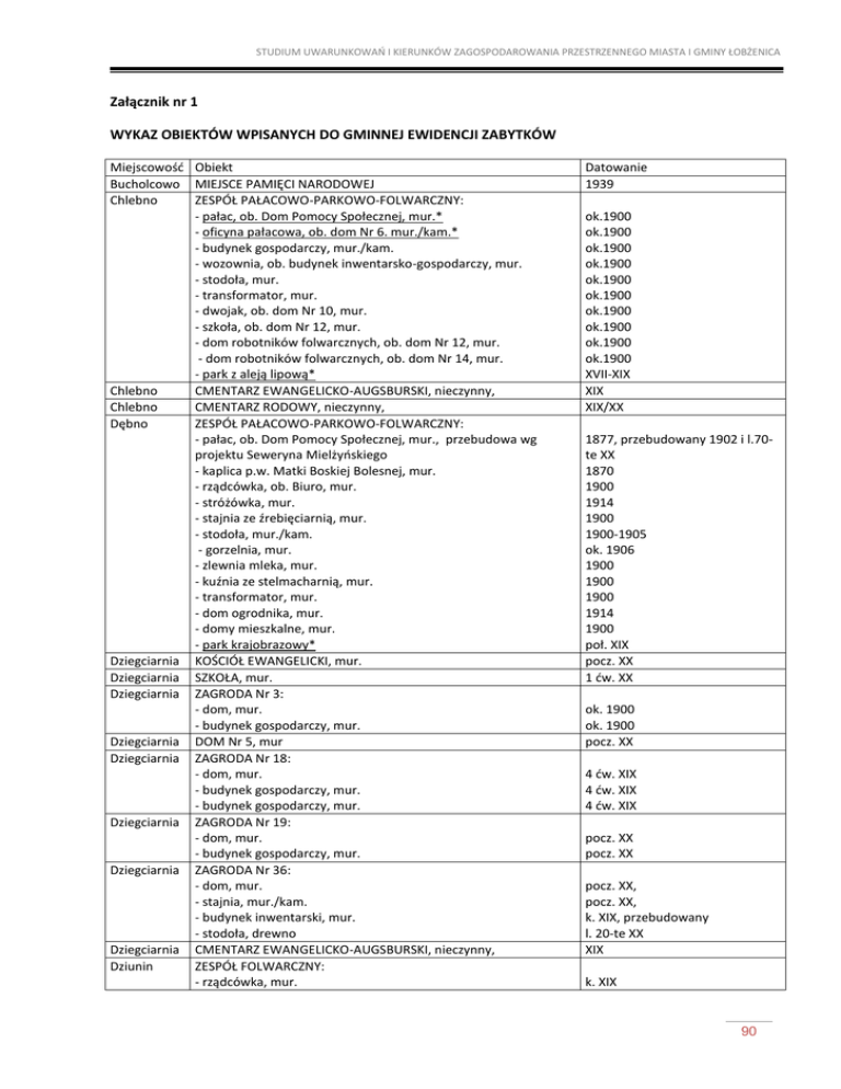 STUDIUM UWARUNKOWAŃ I KIERUNKÓW ZAGOSPODAROWANIA PRZESTRZENNEGO MIASTA I GMINY ŁOBŻENICA Załącznik nr 1 WYKAZ OBIEKTÓW WPISANYCH DO GMINNEJ EWIDENCJI ZABYTKÓW Miejscowość Obiekt Bucholcowo MIEJSCE PAMIĘCI NARODOWEJ Chlebno ZESPÓŁ PAŁACOWO-PARKOWO-FOLWARCZNY: - pałac, ob. Dom Pomocy Społecznej, mur.* - oficyna pałacowa, ob. dom Nr 6. mur./kam.* - budynek gospodarczy, mur./kam. - wozownia, ob. budynek inwentarsko-gospodarczy, mur. - stodoła, mur. - transformator, mur. - dwojak, ob. dom Nr 10, mur. - szkoła, ob. dom Nr 12, mur. - dom robotników folwarcznych, ob. dom Nr 12, mur. - dom robotników folwarcznych, ob. dom Nr 14, mur. - park z aleją lipową* Chlebno CMENTARZ EWANGELICKO-AUGSBURSKI, nieczynny, Chlebno CMENTARZ RODOWY, nieczynny, Dębno ZESPÓŁ PAŁACOWO-PARKOWO-FOLWARCZNY: - pałac, ob. Dom Pomocy Społecznej, mur., przebudowa wg projektu Seweryna Mielżyńskiego - kaplica p.w. Matki Boskiej Bolesnej, mur. - rządcówka, ob. Biuro, mur. - stróżówka, mur. - stajnia ze źrebięciarnią, mur. - stodoła, mur./kam. - gorzelnia, mur. - zlewnia mleka, mur. - kuźnia ze stelmacharnią, mur. - transformator, mur. - dom ogrodnika, mur. - domy mieszkalne, mur. - park krajobrazowy* Dziegciarnia KOŚCIÓŁ EWANGELICKI, mur. Dziegciarnia SZKOŁA, mur. Dziegciarnia ZAGRODA Nr 3: - dom, mur. - budynek gospodarczy, mur. Dziegciarnia DOM Nr 5, mur Dziegciarnia ZAGRODA Nr 18: - dom, mur. - budynek gospodarczy, mur. - budynek gospodarczy, mur. Dziegciarnia ZAGRODA Nr 19: - dom, mur. - budynek gospodarczy, mur. Dziegciarnia ZAGRODA Nr 36: - dom, mur. - stajnia, mur./kam. - budynek inwentarski, mur. - stodoła, drewno Dziegciarnia CMENTARZ EWANGELICKO-AUGSBURSKI, nieczynny, Dziunin ZESPÓŁ FOLWARCZNY: - rządcówka, mur. Datowanie 1939 ok.1900 ok.1900 ok.1900 ok.1900 ok.1900 ok.1900 ok.1900 ok.1900 ok.1900 ok.1900 XVII-XIX XIX XIX/XX 1877, przebudowany 1902 i l.70te XX 1870 1900 1914 1900 1900-1905 ok. 1906 1900 1900 1900 1914 1900 poł. XIX pocz. XX 1 ćw. XX ok. 1900 ok. 1900 pocz. XX 4 ćw. XIX 4 ćw. XIX 4 ćw. XIX pocz. XX pocz. XX pocz. XX, pocz. XX, k. XIX, przebudowany l. 20-te XX XIX k. XIX 90 STUDIUM UWARUNKOWAŃ I KIERUNKÓW ZAGOSPODAROWANIA PRZESTRZENNEGO MIASTA I GMINY ŁOBŻENICA Dźwierszno Małe Dźwierszno Małe Dźwierszno Małe Dźwierszno Małe Dźwierszno Małe Dźwierszno Wielkie Dźwierszno Wielkie Dźwierszno Wielkie Dźwierszno Wielkie Dźwierszno Wielkie Dźwierszno Wielkie Dźwierszno Wielkie Dźwierszno Wielkie Dźwierszno Wielkie Fanianowo Fanianowo Fanianowo Fanianowo Fanianowo Ferdynando wo Górka Klasztorna Górka Klasztorna Górka Klasztorna - stodoła z magazynem, mur. - stajnia, mur. - owczarnia, mur. - domy mieszkalne, mur. - obora, mur. k. XIX k. XIX k. XIX k. XIX k. XIX SZKOŁA, mur. 1 ćw. XX DOM Nr 13, mur. 1 ćw. XX DOM Nr 18, mur 1 ćw. XX CMENTARZ EWANGELICKO-AUGSBURSKI, nieczynny XIX GRODZISKO WCZESNOŚREDNIOWIECZNE - stan. 2.* ZESPÓŁ KOŚCIOŁA PARAFIALNEGO P.W. ŚW. MIKOŁAJA: - kościół, mur.* - plebania, mur. 1869 po 1869 DOM Nr 6, mur./szach. poł. XIX, przebudowany pocz. XX DOM Nr 9, mur. pocz. XX DOM Nr 11, mur. k. XIX DOM Nr 13, mur. 4 ćw. XIX CMENTARZ EWANGELICKO-AUGSBURSKI, nieczynny XIX CMENTARZ KATOLICKI, czynny XIX CMENTARZ KATOLICKI, nieczynny XIX GRODZISKO WCZESNOŚREDNIOWIECZNE* ZAGRODA Nr 19: - dom, mur. - budynek inwentarski, mur. DOM Nr 9, mur. DOM Nr 12, mur. KAPLICZKA, mur., figura św. Józefa CMENTARZ KATOLICKI, czynny pocz. XX k. XIX k. XIX, przebudowany 1 ćw. XX 1945, odnowiona 1995 XIX/XX DWÓR, wł POHZ Dobrzyniewo, mur.* 1913 ZESPÓŁ KLASZTORU BERNARDYNÓW, Sanktuarium Maryjne: - kościół par, p.w. Najśw. Panny Marii Niepokalanie Poczętej, mur.* - klasztor bernardynów, ob. Misjonarzy Świętej Rodziny, mur. - kaplica, mur. - kaplica, mur. - brama, mur. - Gaj Górecki* 1675-1680. sygnaturka 1741. odnowiony 1932-35 1654-87, przebudowany1976-78 k. XIX k. XIX XVIII XI, XIX/XX CMENTARZ KATOLICKI, czynny pocz. XX CMENTARZ PRZYKLASZTORNY, KATOLICKI, nieczynny XVIII 91 STUDIUM UWARUNKOWAŃ I KIERUNKÓW ZAGOSPODAROWANIA PRZESTRZENNEGO MIASTA I GMINY ŁOBŻENICA Izdebki Izdebki Izdebki Kościerzyn Mały Kościerzyn Mały Kruszki Kruszki Kruszki Kruszki Kruszki Kruszki Kruszki Kruszki Kruszki Kruszki Kruszki Kunowo Kunowo Kunowo Kunowo Kunowo Kunowo Lipki Liszkowo Liszkowo Liszkowo Liszkowo Liszkowo Luchowo Luchowo Luchowo DOM Nr 15, mur. DOM Nr 18, mur. KAPLICZKA, mur figura św. Wawrzyńca, drewno, ludowa k. XIX k. XIX 1945 XIX SZKOŁA, mur. pocz. XX CMENTARZ EWANGELICKO-AUGSBURSKI, nieczynny XIX SZKOŁA, mur. ZAGRODA Nr 19: dom, szach. budynek gospodarczy, mur. DOM Nr 6, mur DOM Nr 8, mur DOM Nr 10, mur. DOM Nr 25, ściany glinobite, mur./drewno DOM Nr 32, mur MLECZARNIA, ob. Zlewnia mleka, mur. KAPLICZKA, mur. CMENTARZ EWANGELICKO-AUGSBURSKI, nieczynny CMENTARZ EWANGELICKO-AUGSBURSKI, nieczynny DOM Nr 7, mur./drewno DOM Nr 8, mur. DOM Nr 9, mur DOM Nr 11, mur. DOM Nr 48, mur. KAPLICZKA, mur., figura św. Wawrzyńca, ludowa ZAGRODA LEŚNICZEGO: - dom, mur. - budynek inwentarski, mur./drewno - budynek gospodarczy, mur. - stodoła, drewno ZESPÓŁ DWORSKO-PARKOWO-FOLWARCZNY: - dwór, mur. - oficyna mieszkalna, mur. - park krajobrazowy* - stajnia, mur./kam. - obora, mur. - transformator, mur. - brama i mur ogrodzeniowy folwarku, mur. - chlewnia z magazynem, mur. - stodoła, mur. - kuźnia, mur. - budynek gospodarczy, mur. - domy mieszkalne, mur. pocz. XX DOM Nr 10, szach poł. XIX pocz. XX 1 ćw. XX. 1 ćw. XX 1 ćw. XX ok. poł. XIX 1 ćw. XX pocz. XX 1946 XIX XIX/XX 2 poł. XIX. pocz. XX k. XIX 1 ćw. XX pocz. XX XIX, odnowiona 1984 1 ćw. XX 1 ćw. XX 1 ćw. XX 1 ćw. XX 2 ćw. XIX, przebudowany 1910 k. XIX poł. XIX 1890, przebud. l.20-30-te XX 1894, odnowiona po pożarze w 1.90-tych XX 1914 1935 k. XIX k. XIX k. XIX k. XIX k. XIX 1 poł. XIX, przebudowany pocz. XX DOM Nr 16, mur./szach 1 poł. XIX, przebudowany pocz. XX DOM Nr 17, szach. CMENTARZ EWANGELICKO-AUGSBURSKI, nieczynny SZKOŁA, Nr 2, mur.