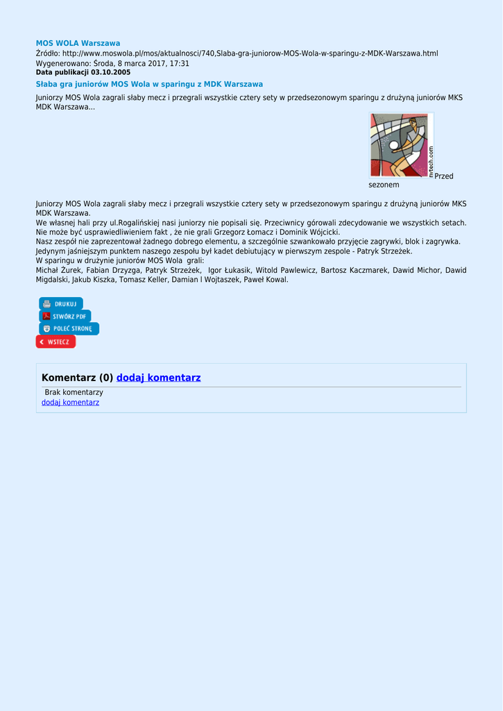 MOS WOLA Warszawa Źródło: http://www.moswola.pl/mos/aktualnosci/740,Slaba-gra-juniorow-MOS-Wola-w-sparingu-z-MDK-Warszawa.html Wygenerowano: Środa, 8 marca 2017, 17:31 Data publikacji 03.10.2005 Słaba gra juniorów MOS Wola w sparingu z MDK Warszawa Juniorzy MOS Wola zagrali słaby mecz i przegrali wszystkie cztery sety w przedsezonowym sparingu z drużyną juniorów MKS MDK Warszawa... sezonem Przed Juniorzy MOS Wola zagrali słaby mecz i przegrali wszystkie cztery sety w przedsezonowym sparingu z drużyną juniorów MKS MDK Warszawa. We własnej hali przy ul.Rogalińskiej nasi juniorzy nie popisali się. Przeciwnicy górowali zdecydowanie we wszystkich setach. Nie może być usprawiedliwieniem fakt , że nie grali Grzegorz Łomacz i Dominik Wójcicki. Nasz zespół nie zaprezentował żadnego dobrego elementu, a szczególnie szwankowało przyjęcie zagrywki, blok i zagrywka. Jedynym jaśniejszym punktem naszego zespołu był kadet debiutujący w pierwszym zespole - Patryk Strzeżek. W sparingu w drużynie juniorów MOS Wola grali: Michał Żurek, Fabian Drzyzga, Patryk Strzeżek, Igor Łukasik, Witold Pawlewicz, Bartosz Kaczmarek, Dawid Michor, Dawid Migdalski, Jakub Kiszka, Tomasz Keller, Damian l Wojtaszek, Paweł Kowal. Komentarz (0) dodaj komentarz Brak komentarzy dodaj komentarz