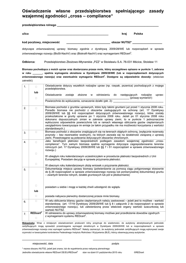 Oświadczenie własne przedsiębiorstwa spełniającego wzajemnej zgodności „cross – compliance“ zasady przedsiębiorstwa rolnego _________________________________________________________________ ulica _______________________________________ kod pocztowy, miejscowość kraj Polska ____________________________ obszar NUTS2* ___________________ dotyczące zrównoważonej uprawy biomasy zgodnie z dyrektywą 2009/28/WE lub rozporządzeń w sprawie zrównoważonego rozwoju (BioSt-NachV) oraz (Biokraft-NachV) oraz wymaganiami REDcert2. Przedsiębiorstwo Zbożowo-Młynarskie „PZZ“ w Stoisławiu S.A. 76-031 Mścice, Stoisław 11 Odbiorca: Biomasa pochodząca z moich upraw oraz dostarczana przeze mnie, którą szczegółowo opisano w punkcie 1, zebrana w roku _______, spełnia wymagania określone w Dyrektywie 2009/28/WE (lub w rozporządzeniach dotyczących zrównoważonego rozwoju) oraz ewentualnie wymagania REDcert2. Dostępne są odpowiednie dowody: (właściwe zakreślić) 1. lub 2. 3. 4. 5. Oświadczenie dotyczy wszelkich rodzajów upraw (np. rzepak, pszenica) pochodzących z mojego przedsiębiorstwa. Oświadczenie zostaje złożone w odniesieniu do następujących rodzajów upraw: _________________________________________________________ (proszę wymienić!) Powierzchnie do wykluczenia, oznaczenie działki (pkt. 2): __________________________________ Biomasa pochodzi z gruntów uprawnych, które były takimi gruntami już przed 1 stycznia 2008 roku. Ponadto biomasa nie pochodzi z obszarów zasługujących na ochronę (art. 17 Dyrektywy 2009/28/WE lub §§ 4-6 rozporządzeń dotyczących zrównoważonego rozwoju), które zostały przekształcone w grunty uprawne po 1 stycznia 2008 roku. Jeżeli po 01 stycznia 2008 roku dokonano dopuszczalnych zmian w zakresie uprawy ziemi, to w punkcie 1 jednoznacznie wykluczono odpowiednie powierzchnie lub w ramach własnego obliczania gazów cieplarnianych uwzględniono towarzyszące im emisje (w takim przypadku nie ma możliwości korzystania z wartości standardowych.) Biomasa pochodzi z obszarów znajdujących się na terenach objętych ochroną, (wyłącznie rezerwaty przyrody – bez rezerwatów wodnych), na których zezwala się na działalność związaną z uprawą ziemi. Przestrzegane są polecenia dotyczących obszarów chronionych. Jako beneficjent płatności bezpośrednich podlegam zasadom wzajemnej zgodności „crosscompliance“. Tym samym biomasa spełnia wymagania dotyczące zagospodarowania terenów rolniczych (art. 17 Dyrektywy 2009/28/WE lub §§ 7 i 51 rozporządzeń w sprawie zrównoważonego rozwoju.) W ubiegłym roku kalendarzowym uczestniczyłem w procedurze płatności bezpośrednich z Unii Europejskiej. Posiadam decyzję w sprawie przyznania płatności. W obecnym roku kalendarzowym złożę wniosek o przyznanie płatności. Dokumentację miejsca uprawy biomasy (potwierdzenie za pomocą ciągu poligonowego stosownie do § 26 rozporządzeń w sprawie zrównoważonego rozwoju lub porównywalnej dokumentacji gruntu – zwartych terenów rolnych, działek gruntowych lub pól w płodozmianie) posiadam u siebie i mogę w każdej chwili udostępnić do wglądu lub posiada nabywca pierwotny dostarczonej przeze mnie biomasy. 6. 7. REDcert2 W celu obliczenia bilansu gazów cieplarnianych należy zastosować – jeżeli jest to możliwe - wartość standardową (art. 17/19 Dyrektywy 2009/28/WE lub § 8 i załącznik 2 do rozporządzeń w sprawie zrównoważonego rozwoju), lub zatwierdzoną przez właściwe organy wartość szacunkową lub wartość NUTS2. W odniesieniu do uprawy zrównoważonej biomasy możliwe jest przedłożenie dowodów zgodnych z wymaganiami systemu REDcert2. Wskazówka: Wraz z niniejszym oświadczeniem producent rolny przyjmuje do wiadomości, że audytorzy akredytowanych jednostek certyfikujących mogą sprawdzić przestrzeganie wymagań określonych w Dyrektywie 2009/28/WE lub w rozporządzeniach w sprawie zrównoważonego rozwoju oraz wymagań systemu REDcert2. Należy zaznaczyć, że audytorzy jednostek certyfikujących mogą wykonywać swoje czynności w towarzystwie kontrolerów Federalnego Instytutu Rolnictwa i Wyżywienia (BLE), którzy obserwują pracę audytorów. _______________________ ____________________________ miejscowość, data podpis * nazwa obszaru NUTS2, jeżeli jest znana, lub do wypełnienia przez nabywcę pierwotnego Jednolite oświadczenie własne REDcert DE/EU/REDcert2 stan na dzień 01 października 2015 roku ©REDcert