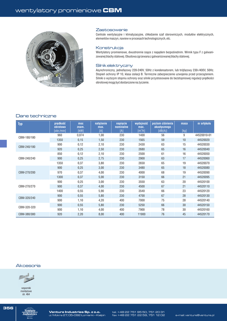wentylatory promieniowe CBM Zastosowanie Centrale wentylacyjne i klimatyzacyjne, ch³odzenie szaf sterowniczych, modu³ów elektrycznych, elementów maszyn, nawiew w procesach technologicznych, etc. Konstrukcja Wentylatory promieniowe, dwustronnie ss¹ce z napêdem bezpoœrednim. Wirnik typu F z galwanizowanej blachy stalowej. Obudowa zgrzewana z galwanizowanej blachy stalowej. Silnik elektryczny Asynchroniczny, jednofazowy 220-240V, 50Hz z kondensatorem, lub trójfazowy 230-/400V, 50Hz. Stopieñ ochrony IP 10, klasa izolacji B. Termiczne zabezpieczenie uzwojenia przed przeci¹¿eniem. Silniki o wy¿szym stopniu ochrony oraz silniki przystosowane do bezstopniowej regulacji prêdkoœci obrotowej mog¹ byæ dostarczone na ¿yczenie. Dane techniczne Typ CBM-180/180 CBM-240/180 CBM-240/240 CBM-270/200 CBM-270/270 CBM-320/240 CBM-320-320 CBM-380/380 prêdkoœæ obrotowa [obr./min] 960 moc znam. [kW] 0,074 natê¿enie max. [A] 1,00 napiêcie nominalne [A] 230 wydajnoœæ max. [m3/h] 1400 poziom ciœnienia akustycznego [dB(A)] 56 masa nr artyku³u [kg] 9 44520010-01 1350 0,15 1,50 230 1565 59 10 44520020 900 0,12 2,10 230 2430 63 15 44520030 920 0,25 2,50 230 2680 65 16 44520040 850 0,12 2,10 230 2500 61 16 44520050 900 0,25 2,75 230 2900 63 17 44520060 1350 0,37 3,80 230 2650 65 19 44520070 900 0,25 3,00 230 3480 65 18 44520080 970 Typ 1300 0,37 4,00 230 4000 68 19 44520090 0,37 5,00 230 3150 66 21 44520095 900 0,25 3,00 230 3550 63 20 44520100 900 0,37 4,00 230 4500 67 21 44520110 1400 0,55 5,90 230 3540 66 23 44520120 900 0,55 5,80 230 4700 67 28 44520130 900 1,10 4,20 400 7000 75 28 44520140 900 0,55 5,80 230 5250 66 30 44520150 900 1,10 4,00 400 7900 78 30 44520160 920 2,20 8,00 400 11900 76 45 44520170 Akcesoria wsporniki monta¿owe str. 464 356 Venture Industries Sp. z o.o. ul. Mokra 27, 05-092 £omianki - Kie³pin tel. +48 22 751 95 50, 751 20 31 fax +48 22 751 22 59, 751 12 02 e-mail: [email protected] wentylatory promieniowe CBM Wymiary [mm] Figury Typ CBM-180/180 A B C D E F G H I J K L M N O P 269 233 328 309 145 210 225 49 314 57 333 28 15 10 6 188 CBM-240/180 289 234 393 381 183 256 298 33 383 67 393 67 40 33 7 217 CBM-240/240 345 300 393 381 183 256 298 33 383 67 393 67 40 33 7 217 CBM-270/200 344 265 440 421 202 288 339 40 424 67 444 67 38 40 7 246 CBM-270/270 379 334 440 421 202 288 339 40 424 67 444 67 38 40 7 246 CBM-320/240 389 309 515 490 230 343 407 52 489 55 517 55 35 52 9 289 CBM-320/320 433 395 515 490 230 343 407 52 489 55 517 55 35 52 9 289 CBM-380/380 630 471 625 580 264 404 - - - - - - - - - 347 Charakterystyki pracy Pst [Pa] [mm H2O] CBM 180/180 (7/7) Pst [Pa] [mm H2O] 3 Q [m /h] 3 Q [m /s] www.venture.pl CBM 240/180 (9/7) Q [m3/h] Q [m3/s] 357 wentylatory promieniowe CBM Charakterystyki pracy Pst [Pa] [mm H2O] CBM 240/240 (9/9) Pst [Pa] [mm H2O] CBM 270/200 (10/8) Q [m3/h] 3 Q [m /s] Pst [Pa] [mm H2O] 3 Q [m /h] 3 Q [m /s] CBM 270/270 (10/10) Pst [Pa] [mm H2O] CBM 270/200 (10/8) 3 Q [m3/h] Q [m3/s] Q [m /h] 3 Q [m /s] Pst [Pa] [mm H2O] CBM 180/180 (7/7) Pst [Pa] [mm H2O] CBM 380/380 (15/15) 3 Q [m3/h] Q [m3/s] Q [m /h] 3 Q [m /s] 358 Venture Industries Sp. z o.o. ul. Mokra 27, 05-092 £omianki - Kie³pin tel. +48 22 751 95 50, 751 20 31 fax +48 22 751 22 59, 751 12 02 e-mail: [email protected]