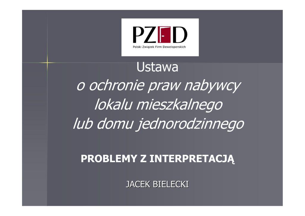 Ustawa o ochronie praw nabywcy lokalu mieszkalnego lub domu jednorodzinnego PROBLEMY Z INTERPRETACJĄ JACEK BIELECKI Licencjonowanie działalności deweloperskiej Ustawa zabrania prowadzenia działalności deweloperskiej bez prowadzenia rachunku powierniczego Ustawa nie dopuszcza innych alternatywnych sposobów zabezpieczenia wpłat nabywców (przewłaszczenie w trakcie inwestycji w miarę wpłacanych zaliczek, kontrolę przez inne podmioty, gwarancje lub ubezpieczenie jako samodzielne zabezpieczenie) Banki zapowiadają, że nie każdemu działającemu nawet od lat deweloperowi otworzą rachunek (patrz Rekomendacja ZBP) Nowe podmioty będą miały bardzo utrudnioną możliwość prowadzenia działalności deweloperskiej W praktyce jedne podmioty gospodarcze – banki, będą wydawały licencję na prowadzenie innego rodzaju działalności - deweloperskiej UMOWA PRZEDWSTĘPNA Z jakim dokumentem nabywca ma zgłaszać się do banku po kredyt ? Umowa deweloperska powoduje wpisanie roszczenia do KW, podczas, gdy nabywca nie dysponuje jeszcze środkami na nabycie mieszkania. Stwarza to ryzyko pozostawienia roszczenia w KW i zablokowania dysponowania lokalem przez dewelopera, jeśli nabywca nie złoży stosownego oświadczenia Umowa zobowiązująca do zawarcia umowy deweloperskiej musi mieć formę aktu notarialnego. Są różne interpretacje, czy można na jej podstawie wpisać roszczenie do KW. Jeśli sądy uznają, że tak, problem podobny do umowy deweloperskiej Brak w ustawie uregulowania umowy rezerwacyjnej, która powinna być ograniczona w czasie, ograniczona górną granicą wpłaty przez nabywcę i nieograniczona co do formy. Powinna zawierać zobowiązanie dewelopera do zwrotu wpłaconej „kaucji” w przypadku nieuzyskania kredytu w określonym czasie. Taka umowa minimalizowałaby ryzyko obu stron transakcji. GWARANCJE BANKOWE I UBEZPIECZENIOWE Obecny zapis art. 4. punkty 2 i 3 nie ma sensu. Samodzielna gwarancja jest silniejszym zabezpieczeniem niż rachunek powierniczy otwarty. Obecny zapis w praktyce wyklucza zastosowanie gwarancji. Banki i ubezpieczyciele deklarują, że nie są zainteresowani oferowaniem gwarancji, gdyż nie widzą możliwości dostatecznego zabezpieczenia. Bezwzględność sformułowania art. 15. jest sprzeczna z art. 4. i art. 16. Należy przeredagować ten przepis. Obowiązki kontrolne banku Zapisy art. 8. i 12. czytane łącznie powodują problemy z jednoznacznym określeniem obowiązków kontrolnych banku. ZBP przyjął Rekomendację, która próbuje to rozstrzygnąć, ale jest w tym sporo ekwilibrystyki. Należy jednoznacznie określić zakres obowiązku banku prowadzącego omrp. Obowiązki kontrolne banku Należy doprecyzować zakres kontroli przez bank oświadczenia o odstąpieniu od umowy. Obecne brzmienie nakazuje bankowi zwrot zaliczek, bez badania choćby podstawowej przesłanki uprawniającej do odstąpienia czyli upłynięcia terminów uprawniających do odstąpienia od umowy. Rachunek powierniczy Prawo wypowiedzenia umowy o prowadzenie rachunku powierniczego przysługuje wyłącznie bankowi Jest to niedopuszczalna nierównoprawność podmiotów, nieznajdująca uzasadnienia w celu ustawy. W razie wypowiedzenia umowy deweloper musi środki na nim zgromadzone przelać na inny rachunek powierniczy lub bank zwraca nabywcy wszystkie znajdujące się na nim środki. Niemożność rozwiązania umowy przez dewelopera może być problemem w przypadku uzyskania finansowania budowy w innym banku niż bank prowadzący mrp. Zakres informacji w prospekcie Konieczność informowania o wszystkich inwestycjach w promieniu 1 km, niezależnie od ich charakteru. Wynika z tego konieczność informowania o przebudowie 200 m odcinka wodociągu w odległości 800 m, ale już nie trzeba informować o wysypisku śmieci w odległości 1200 m. Należy wprowadzić przepis o konieczności informowania o inwestycjach mogących oddziaływać na nieruchomość, na podstawie przepisów odrębnych (jak to jest w Prawie budowlanym) oraz zapisach w planie miejscowym Prospekt informacyjny Absurdalne przepisy karne grożące 2 latami więzienia za nieprawdziwe informacje w prospekcie i dla pracownika banku za wypłatę z rachunku powierniczego niezgodnie z ustawą. Mniejsza kara za niesporządzenie prospektu ! Prospekt informacyjny W prospekcie podaje się cenę 1m2 mieszkania, w umowie cenę mieszkania wraz z przynależnościami (balkon, komórka, miejsce postojowe). Umowa deweloperska Nie wykorzystano możliwości ustawowego uregulowania sytuacji konfliktowych: Określenia dopuszczalnej różnicy powierzchni projektowanej i wykonanej Górnej granicy kary umownej na rzecz dewelopera Brak tych uregulowań zwiększa ryzyko działalności deweloperskiej TERMINY OBOWIĄZYWANIA I SKUTKI WEJŚCIA W ŻYCIE USTAWY Ustawa wchodzi w życie 29 kwietnia 2012 roku, z wyjątkiem uregulowań dotyczących zabezpieczeń wpłat dla przedsięwzięć deweloperskich, których sprzedaż rozpoczęto przed 29 kwietnia 2012 r. Rozpoczęcie sprzedaży (art. 3. punkt 10) to podanie do publicznej wiadomości informacji na temat rozpoczęcia procesu oferowania mieszkań w ramach określonego przedsięwzięcia deweloperskiego 29 kwietnia trzeba mieć prospekt informacyjny czyli co najmniej dysponować gruntem i mieć projekt budowlany Skutki wejścia wżycie ustawy Regulacja nakłada obowiązki, które mogą być sprzeczne z zawartymi umowami Zakaz odbioru przez nabywcę lokalu przed dopuszczeniem do użytkowania. Odbiór można rozumieć jako weryfikację techniczną wykonania lokalu lub jako przekazanie we władanie (przekazanie kluczy). Biorąc pod uwagę cel przepisu, zabronione jest to drugie przed dopuszczeniem do użytkowania. Zakaz jednostronnego odbioru przez dewelopera Możliwość odstąpienia od umowy przez dewelopera przy opóźnieniu wpłat, pomimo wezwania i z upłynięciem dodatkowego 30 dniowego terminu Możliwość odstąpienia od umowy przez dewelopera w przypadku niestawienia się nabywcy do o