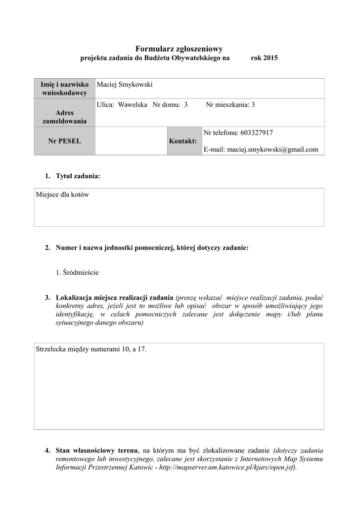 Formularz zgłoszeniowy projektu zadania do Budżetu Obywatelskiego na Imię i nazwisko wnioskodawcy rok 2015 Maciej Smykowski Ulica: Wawelska Nr domu: 3 Nr mieszkania: 3 Adres zameldowania Nr telefonu: 603327917 Nr PESEL Kontakt: E-mail: [email protected] 1. Tytuł zadania: Miejsce dla kotów 2. Numer i nazwa jednostki pomocniczej, której dotyczy zadanie: 1. Śródmieście 3. Lokalizacja miejsca realizacji zadania (proszę wskazać miejsce realizacji zadania, podać konkretny adres, jeżeli jest to możliwe lub opisać obszar w sposób umożliwiający jego identyfikację, w celach pomocniczych zalecane jest dołączenie mapy i/lub planu sytuacyjnego danego obszaru) Strzelecka między numerami 10, a 17. 4. Stan własnościowy terenu, na którym ma być zlokalizowane zadanie (dotyczy zadania remontowego lub inwestycyjnego, zalecane jest skorzystanie z Internetowych Map Systemu Informacji Przestrzennej Katowic - http://mapserver.um.katowice.pl/kjarc/open.jsf). Własność Gminy bez wieczystego użytkowania 5. Opis zadania (proszę wskazać główne działania związane z jego realizacją, opisać, co dokładnie ma zostać wykonane w ramach zadania). Zakup budki dla kotów wolno żyjących w celu ich ochrony i ułatwienia dokarmiania. 6. Skrócony opis zadania (proszę w max. 3 zdaniach przedstawić kluczowe informacje o zadaniu. Uwaga: skrócony opis będzie publikowany w ramach działań promocyjnych oraz na etapie głosowania.) To nieprawda, że koty w mieście same łatwo znajdą sobie pożywienie i schronienie, częste przypadki zamykania piwnicznych okienek, likwidacja bazarów, targowisk i rozbudowa miasta ograniczają kotom dostęp do bezpiecznego schronienia, skazując je na choroby i śmierć. Koty wolnożyjące to koty, które nie są bezdomne, to zwierzęta dzikie lub półdzikie, dlatego nie należy ich wyłapywać, wywozić, ani utrudniać im życia w danym miejscu. Kot wolnożyjący potrzebuje pomocy człowieka, a człowiek, aby uniknąć plagi szczurów potrzebuje kotów wolnożyjących – dlatego potrzebujemy zainstalować budkę dla naszych przyjaciół kotów. 7. Szacunkowe koszty zadania (proszę uwzględnić wszystkie składowe części zadania oraz ich szacunkowe koszty). Składowe części zadania 1. Budka dla kotów 2. środki czystości 3. Ogrodzenie wysokości min. 150 cm x 12 m długości 4. Krzewy x 20 Koszt 500 20 220 200 5. ŁĄCZNIE 940 8. Uwagi pozostałe (proszę przedstawić inne wyżej nieuwzględnione informacje istotne dla zadania, jak np. wskazanie odpowiedzialnych za współpracę przy realizacji zadania, jeżeli taka jest przewidywana, określenie podmiotu, który przejmie odpowiedzialność za wykonaną inwestycję (w tym bieżące utrzymanie) - jeżeli zadanie ma charakter inwestycyjny lub remontowy) Miejsce odpoczynku/dokarmiania musi być czyste (myte lub wymieniane), resztki jedzenia usuwane. Bardzo dobre są plastikowe pojemniki i tacki styropianowe po produktach żywnościowych. Odpowiedzialność za sprzątanie mogą ponosić karmiciele/organizacja pozarządowe, lub agendy urzędu. Ogrodzenie siatką wysokości półtora metra z wejściem/bramką tejże wysokości, wszystko w kolorze zielonym lub innym komponującym się z otoczeniem, ogrodzenie może być obsadzone pnączami lub krzewami od wewnątrz. Ustawienie ocieplanych budek i karmików na paletach aby zimą śnieg nie wpadał do środka. 9. Załączniki obowiązkowe: • Lista z podpisami co najmniej 15 mieszkańców miasta Katowice, popierających zadanie. Każda dodatkowa strona listy winna mieć taką samą formę za wyjątkiem oznakowania kolejnym numerem strony. • Oświadczenie podmiotu zewnętrznego (właściciela/zarządcy terenu) o przejęciu odpowiedzialności za bieżące utrzymanie zadania w przypadku jego wykonania (dotyczy lokalizacji na terenie spółdzielni lub wspólnoty mieszkaniowej). 10. Dodatkowe załączniki (nieobowiązkowe): a) zdjęcie/a dotyczące zgłaszanego zadania; b) mapa z zaznaczeniem lokalizacji zgłaszanego zadania; c) inne, istotne dla zgłaszanego zadania, jakie? …............................................................... …....................................................................................................................................... OŚWIADCZENIE: Oświadczam, że mam ukończone 16 lat, jestem zameldowany pod podanym wyżej adresem, a wszystkie dane, które zostały zawarte w niniejszym formularzu zgłoszeniowym są zgodne z aktualnym stanem prawnym i faktycznym. Przyjmuję także do wiadomości, iż podanie danych osobowych w formularzu zgłoszeniowym jest dobrowolne, jednak niezbędne dla jego ważności. Dane będą przetwarzane (zgodnie z ustawą z dnia 29 sierpnia 1997 r. o ochronie danych osobowych – Dz.U. z 2002, nr 101, poz. 926 z późn. zm.) przez administratora danych – Miasto Katowice reprezentowane przez Prezydenta Miasta Katowice z siedzibą w Katowicach przy ul. Młyńskiej 4 – wyłącznie w celu weryfikacji poprawności procesu zgłaszania propozycji zadania do Budżetu Obywatelskiego. Przysługuje mi także prawo dostępu do moich danych osobowych oraz ich poprawiania. Czytelny podpis wnioskodawcy: ................................................