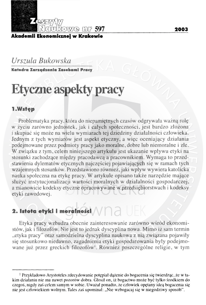 Etyka pracy wzbudza obecnie zainteresowanie zarówno wśród ekonomistów,jak i filozofów . Nic jest to jednak dyscyplina nowa . Mimo iż sam termin