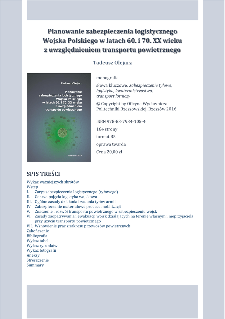 Planowanie zabezpieczenia logistycznego Wojska Polskiego w latach 60. i 70. XX wieku z uwzględnieniem transportu powietrznego Tadeusz Olejarz monografia słowa kluczowe: zabezpieczenie tyłowe, logistyka, kwatermistrzostwo, transport lotniczy © Copyright by Oficyna Wydawnicza Politechniki Rzeszowskiej, Rzeszów 2016 ISBN 978-83-7934-105-4 164 strony format B5 oprawa twarda Cena 20,00 zł SPIS TREŚCI Wykaz ważniejszych skrótów Wstęp I. Zarys zabezpieczenia logistycznego (tyłowego) II. Geneza pojęcia logistyka wojskowa III. Ogólne zasady działania i zadania tyłów armii IV. Zabezpieczenie materiałowe procesu mobilizacji V. Znaczenie i rozwój transportu powietrznego w zabezpieczeniu wojsk VI. Zasady zaopatrywania i ewakuacji wojsk działających na terenie własnym i nieprzyjaciela przy użyciu transportu powietrznego VII. Wznowienie prac z zakresu przewozów powietrznych Zakończenie Bibliografia Wykaz tabel Wykaz rysunków Wykaz fotografii Aneksy Streszczenie Summary