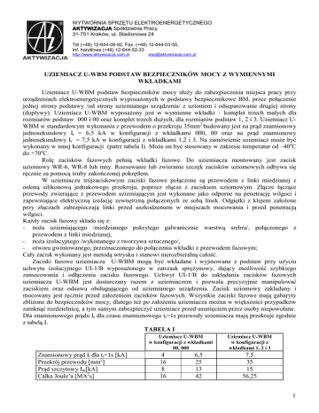 WYTWÓRNIA SPRZĘTU ELEKTROENERGETYCZNEGO AKTYWIZACJA Spółdzielnia Pracy 31-751 Kraków, ul. Stadionowa 24 Tel (+48) 12-644-08-92, Fax. (+48) 12-644-03-55, Inf. handlowa (+48) 12-644-52-33 http://www.aktywizacja.com.pl [email protected] UZIEMIACZ U-WBM PODSTAW BEZPIECZNIKÓW MOCY Z WYMIENNYMI WKŁADKAMI Uziemiacz U-WBM podstaw bezpieczników mocy służy do zabezpieczenia miejsca pracy przy urządzeniach elektroenergetycznych wyposażonych w podstawy bezpiecznikowe BM, przez połączenie jednej strony podstawy /od strony uziemianego urządzenia/ z uziomem i odseparowanie drugiej strony (dopływy). Uziemiacz U-WBM wyposażony jest w wymienne wkładki – komplet trzech małych dla rozmiarów podstaw 000 i 00 oraz komplet trzech dużych, dla rozmiarów podstaw 1, 2 i 3. Uziemiacz UWBM w standardowym wykonaniu z przewodem o przekroju 35mm2 budowany jest na prąd znamionowy jednosekundowy Ir = 6,5 kA w konfiguracji z wkładkami 000, 00 oraz na prąd znamionowy jednosekundowy Ir = 7,5 kA w konfiguracji z wkładkami 1,2 i 3. Na zamówienie uziemiacz może być wykonany w innej konfiguracji (patrz tabela I). Może on być stosowany w zakresie temperatur od –40oC do +70oC. Rolę zacisków fazowych pełnią wkładki fazowe. Do uziemiacza montowany jest zacisk uziomowy WR-6, WR-8 lub inny. Rozsuwanie lub zwieranie szczęk zacisków uziomowych odbywa się ręcznie za pomocą śruby zakończonej pokrętłem. W uziemiaczu trójzaciskowym zaciski fazowe połączone są przewodem z linki miedzianej z osłoną silikonową jednakowego przekroju, poprzez złącze z zaciskiem uziomowym. Złącze łączące przewody zwierające z przewodem uziemiającym jest wykonane jako odporne na penetrację wilgoci i zapewniające elektryczną izolację zewnętrzną połączonych ze sobą linek. Odgiętki z klejem założone przy złączach zabezpieczają linki przed uszkodzeniem w miejscach mocowania i przed penetracją wilgoci. Każdy zacisk fazowy składa się z: - noża uziemiającego /miedzianego pokrytego galwanicznie warstwą srebra/, połączonego z przewodem z linki miedzianej, - noża izolacyjnego /wykonanego z tworzywa sztucznego/, - otworu gwintowanego, przeznaczonego do połączenia wkładki z przewodem fazowym; Cały zacisk wykonany jest metodą wtrysku i stanowi nierozbieralną całość. Zaciski fazowe uziemiacza U-WBM mogą być wkładane i wyjmowane z podstaw przy użyciu uchwytu izolacyjnego UI-1/B wyposażonego w zatrzask sprężynowy, dający możliwość szybkiego zamocowania i odłączenia zacisku fazowego. Uchwyt UI-1/B do zakładania zacisków fazowych uziemiacza U-WBM jest dostarczany razem z uziemiaczem i pozwala precyzyjnie manipulować zaciskiem oraz odsuwa obsługującego od uziemianego urządzenia. Zacisk uziomowy zakładany i mocowany jest ręcznie przed założeniem zacisków fazowych. Wszystkie zaciski fazowe mają gabaryty zbliżone do bezpieczników mocy, dlatego też po założeniu uziemiacza można w większości przypadków zamknąć rozdzielnicę, a tym samym zabezpieczyć uziemiacz przed usunięciem przez osoby niepowołane. Dla znamionowego prądu Ir dla czasu znamionowego tr=1s przewody uziemiacza mają przekroje zgodnie z tabelą I. TABELA I Uziemiacz U-WBM w konfiguracji z wkładkami 00, 000 Znamionowy prąd Ir dla tr=1s [kA] Przekrój przewodu [mm2] Prąd szczytowy Im[kA] Całka Joule’a [MA2s] 4 16 8 16 6,5 25 13 42 Uziemiacz U-WBM w konfiguracji z wkładkami 1, 2 i 3 7,5 35 15 56,25 1 Sposób doboru w/w uziemiacza dla pozostałych wyszczególnionych w normie PN-EN 61230:2011 wartości czasu znamionowego tr i odpowiadających im prądów znamionowych Ir obrazuje wykres I. WYKRES I Dopuszczalny prąd zwarcia Ir w funkcji czasu zwarcia tr dla różnych przekrojów przewodów uziemiaczy 100 90 Prąd zwarcia Ir [kA] 80 70 60 Przekrój przewodu [mm2 ] 50 40 30 20 10 0 0 0,25 0,5 0,75 1 1,25 1,5 1,75 2 2,25 2,5 2,75 3 150 120 95 50 35 25 16 Czas zwarcia tr [s] UWAGA: Uziemiacze mogą być stosowane w zakresie: tr 1s ÷ 3s – prąd przeliczeniowy gwarantowany Uziemiacze mają standardowe długości zgodnie z tabelą II. TABELA II Wersja uziemiacza U3-WBM Długość przewodu uziemiającego L [m] Długość przewodów zwierających L1 [m] 2 - Długości przewodów zwierających [m] L1 L2 L3 0,4 0,6 0,8 Istnieje możliwość wykonania uziemiacza o innych długościach L i L1 z gradacją co 0,02 lub 0,05 [m] przy założeniu, że: - długość przewodu L uziemiacza jednozaciskowego lub - suma długości przewodów L+L1 lub L+L3 (gdy długości przewodów zwierających są różne i L1<L2<L3) uziemiacza wielozaciskowego o przewodach połączonych równolegle nie przekroczy 4 [m]. Opakowanie jednostkowe uziemiacza stanowi torba wykonana z tkaniny powlekanej wodoodpornej. PRZYKŁAD OZNACZENIA UZIEMIACZA U-WBM UX-WBM-L/L1-I/t-S-(B)(C) 2 gdzie: A - oznaczenie zacisku fazowego: WBM – zacisk wymienny do podstaw bezpieczników mocy wielkości 00, 000 lub 1, 2 i 3 w tym do wyposażonych w osłony szczęk nożowych, zakładany uchwytem izolacyjnym UI-1/B, X – ilość zacisków fazowych L - długość przewodu uziemiającego (od 0,2 [m] do 4,0 [m] z gradacją co 0,02 lub 0,05 [m]) L1 - długość przewodu zwierającego (od 0,2 [m] z gradacją co 0,02 lub 0,05 [m]) L2 - długość przewodu zwierającego (od 0,2 [m] z gradacją co 0,02 lub 0,05 [m]) L3 - długość przewodu zwierającego (od 0,2 [m] z gradacją co 0,02 lub 0,05 [m]) UWAGA 1: Długość przewodów L1<L2<L3. UWAGA 2: Suma długości przewodów L+L1 lub L+L3 (gdy długości przewodów zwierających są różne) nie może przekraczać 4 m. I - Ir znamionowy prąd zwarcia dla czasu zwarcia tr [kA] t - tr znamionowy czas zwarcia [s] S - przekrój przewodów uziemiacza wynikający ze znamionowego prądu i czasu zwarcia [mm2] B - sposób połączenia przewodów uziemiacza wielozaciskowego: - I uziemiacz ze złączem środkowym izolowanym C - oznaczenie zacisku uziomowego (WR-6, WR-8 lub inny) UWAGA: W przypadku przewodów w osł