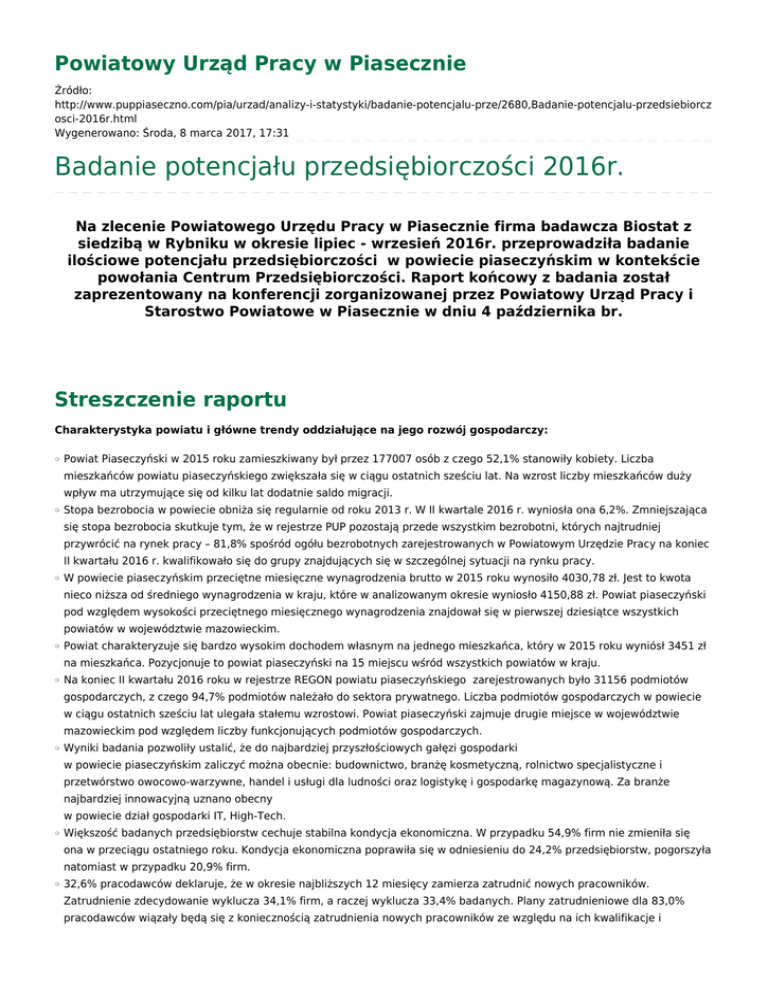 Powiatowy Urząd Pracy w Piasecznie Źródło: http://www.puppiaseczno.com/pia/urzad/analizy-i-statystyki/badanie-potencjalu-prze/2680,Badanie-potencjalu-przedsiebiorcz osci-2016r.html Wygenerowano: Środa, 8 marca 2017, 17:31 Badanie potencjału przedsiębiorczości 2016r. Na zlecenie Powiatowego Urzędu Pracy w Piasecznie firma badawcza Biostat z siedzibą w Rybniku w okresie lipiec - wrzesień 2016r. przeprowadziła badanie ilościowe potencjału przedsiębiorczości w powiecie piaseczyńskim w kontekście powołania Centrum Przedsiębiorczości. Raport końcowy z badania został zaprezentowany na konferencji zorganizowanej przez Powiatowy Urząd Pracy i Starostwo Powiatowe w Piasecznie w dniu 4 października br. Streszczenie raportu Charakterystyka powiatu i główne trendy oddziałujące na jego rozwój gospodarczy: ❍ Powiat Piaseczyński w 2015 roku zamieszkiwany był przez 177007 osób z czego 52,1% stanowiły kobiety. Liczba mieszkańców powiatu piaseczyńskiego zwiększała się w ciągu ostatnich sześciu lat. Na wzrost liczby mieszkańców duży wpływ ma utrzymujące się od kilku lat dodatnie saldo migracji. ❍ Stopa bezrobocia w powiecie obniża się regularnie od roku 2013 r. W II kwartale 2016 r. wyniosła ona 6,2%. Zmniejszająca się stopa bezrobocia skutkuje tym, że w rejestrze PUP pozostają przede wszystkim bezrobotni, których najtrudniej przywrócić na rynek pracy – 81,8% spośród ogółu bezrobotnych zarejestrowanych w Powiatowym Urzędzie Pracy na koniec II kwartału 2016 r. kwalifikowało się do grupy znajdujących się w szczególnej sytuacji na rynku pracy. ❍ W powiecie piaseczyńskim przeciętne miesięczne wynagrodzenia brutto w 2015 roku wynosiło 4030,78 zł. Jest to kwota nieco niższa od średniego wynagrodzenia w kraju, które w analizowanym okresie wyniosło 4150,88 zł. Powiat piaseczyński pod względem wysokości przeciętnego miesięcznego wynagrodzenia znajdował się w pierwszej dziesiątce wszystkich powiatów w województwie mazowieckim. ❍ Powiat charakteryzuje się bardzo wysokim dochodem własnym na jednego mieszkańca, który w 2015 roku wyniósł 3451 zł na mieszkańca. Pozycjonuje to powiat piaseczyński na 15 miejscu wśród wszystkich powiatów w kraju. ❍ Na koniec II kwartału 2016 roku w rejestrze REGON powiatu piaseczyńskiego zarejestrowanych było 31156 podmiotów gospodarczych, z czego 94,7% podmiotów należało do sektora prywatnego. Liczba podmiotów gospodarczych w powiecie w ciągu ostatnich sześciu lat ulegała stałemu wzrostowi. Powiat piaseczyński zajmuje drugie miejsce w województwie mazowieckim pod względem liczby funkcjonujących podmiotów gospodarczych. ❍ Wyniki badania pozwoliły ustalić, że do najbardziej przyszłościowych gałęzi gospodarki w powiecie piaseczyńskim zaliczyć można obecnie: budownictwo, branżę kosmetyczną, rolnictwo specjalistyczne i przetwórstwo owocowo-warzywne, handel i usługi dla ludności oraz logistykę i gospodarkę magazynową. Za branże najbardziej innowacyjną uznano obecny w powiecie dział gospodarki IT, High-Tech. ❍ Większość badanych przedsiębiorstw cechuje stabilna kondycja ekonomiczna. W przypadku 54,9% firm nie zmieniła się ona w przeciągu ostatniego roku. Kondycja ekonomiczna poprawiła się w odniesieniu do 24,2% przedsiębiorstw, pogorszyła natomiast w przypadku 20,9% firm. ❍ 32,6% pracodawców deklaruje, że w okresie najbliższych 12 miesięcy zamierza zatrudnić nowych pracowników. Zatrudnienie zdecydowanie wyklucza 34,1% firm, a raczej wyklucza 33,4% badanych. Plany zatrudnieniowe dla 83,0% pracodawców wiązały będą się z koniecznością zatrudnienia nowych pracowników ze względu na ich kwalifikacje i umiejętności. ❍ Około ¼ badanych firm deklaruje trudności związane z pozyskaniem odpowiednich kandydatów do pracy. ❍ Na terenie powiatu piaseczyńskiego powstają działalności typu start up – przykładem jest firma GeniCore, która w 2015 roku wygrała w plebiscycie „Rzeczpospolitej” jako najbardziej perspektywiczny start up w Polsce. ❍ Według stanu na wrzesień 2015 r. do najpopularniejszych kierunków kształcenia wśród młodzieży powiatu piaseczyńskim należą: technik informatyk (287 osób), technik weterynarii (182 osoby) oraz technik administracji (116 osób). Wśród popularnych kierunków kształcenia znajdują się również: technik organizacji reklamy (104 osoby), oraz technik żywienia i usług gastronomicznych (104 osoby). Analiza ilościowa potencjału przedsiębiorczości w Powiecie Piaseczyńskim w kontekście uruchomienia Centrum Przedsiębiorczości – skala zainteresowania osób bezrobotnych: ❍ Uruchomienie własnej działalności gospodarczej jako formę znalezienia pracy rozważają najczęściej osoby z grupy wiekowej 25-54 lata. Tylko bezrobotni z tych kategorii wiekowych obecnie przygotowują się do uruchomienia firmy. Wyłącznie 36,9% bezrobotnych w wieku 35-44 lata nigdy nie zastanawiało się nad założeniem własnego przedsiębiorstwa. ❍ Zdecydowanie najczęściej wskazywaną przyczyną powstrzymującą bezrobotnych przed uruchomieniem firmy był brak funduszy na rozpoczęcie działalności – odpowiedź taką wskazało 51,4% respondentów. Kolejne cztery odpowiedzi wskazywane były przez zbliżone odsetki badanych: rynkowej konkurencji obawia się 23,9% ankietowanych, brak wiedzy merytorycznej w zakresie aspektów prawnych prowadzenia działalności powstrzymuje 23,1% bezrobotnych, strach przed porażką wskazało 21,5%, a skomplikowaną procedurę uzyskania środków z urzędu pracy - 21,1%. ❍ Wyniki badania przekonują, że ewentualnie uruchomione Centrum Przedsiębiorczości mogłoby liczyć na duże początkowe zainteresowanie ze strony osób bezrobotnych – większość bezrobotnych chciałoby nawiązać współpracę. W części prawdopodobnie także tych, którzy dotąd nie rozważali samozatrudnienia. ❍ Wyniki badania wskazują, że projektowana dla