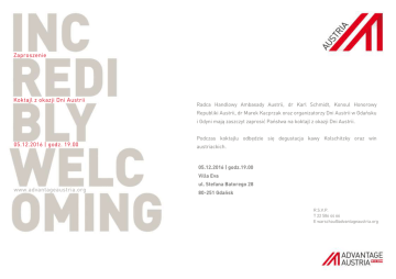Zaproszenie Koktajl z okazji Dni Austrii Radca Handlowy Ambasady Austrii, dr Karl Schmidt, Konsul Honorowy Republiki Austrii, dr Marek Kacprzak oraz organizatorzy Dni Austrii w Gdańsku i Gdyni mają zaszczyt zaprosić Państwa na koktajl z okazji Dni Austrii. 05.12.2016 | godz. 19.00 Podczas koktajlu odbędzie się degustacja kawy Kolschitzky oraz win austriackich. 05.12.2016 | godz.19.00 Villa Eva www.advantageaustria.org ul. Stefana Batorego 28 80-251 Gdańsk R.S.V.P. T 22 586 44 66 E [email protected]