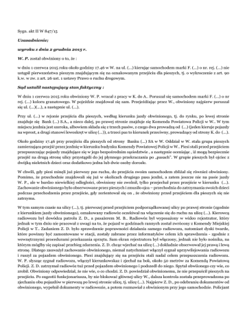 Sygn. akt II W 847/15 Uzasadnienie; wyroku z dnia 2 grudnia 2015 r. W. P. został obwiniony o to, że : w dniu 1 czerwca 2015 roku około godziny 17.46 w W. na ul. (...) kierując samochodem marki F. (...) o nr. rej. (...) nie ustąpił pierwszeństwa pieszym znajdującym się na oznakowanym przejściu dla pieszych, tj. o wykroczenie z art. 90 k.w. w zw. z art. 26 ust. 1 ustawy Prawo o ruchu drogowym. Sąd ustalił następujący stan faktyczny : W dniu 1 czerwca 2015 roku obwiniony W. P. wracał z pracy w K. do A.. Poruszał się samochodem marki F. (...) o nr rej. (...) koloru granatowego. W pojeździe znajdował się sam. Przejeżdżając przez W., obwiniony najpierw poruszał się ul. (...)(...), a następnie ul. (...). Przy ul. (...) w rejonie przejścia dla pieszych, według kierunku jazdy obwinionego, tj. do rynku, po lewej stronie znajduje się Bank (...) S.A., a nieco dalej, po prawej stronie znajduje się Komenda Powiatowa Policji w W.. W tym miejscu jezdnia jest szeroka, albowiem składa się z trzech pasów, z czego dwa prowadzą od (...) (jeden kieruje pojazdy na wprost, a drugi stanowi lewoskręt w ulicę (...)), a trzeci pas to kierunek przeciwny, prowadzący od strony K. do (...). Około godziny 17.46 przy przejściu dla pieszych od strony Banku (...) SA w W. Oddział w W. stała grupa pieszych zamierzająca przejść przez jezdnię w kierunku budynku Komendy Powiatowej Policji w W.. Piesi stali przed przejściem przepuszczając pojazdy znajdujące się w jego bezpośrednim sąsiedztwie , a następnie oceniając , iż mogą bezpiecznie przejść na drugą stronę ulicy przystąpili do jej płynnego przekraczania po „pasach”. W grupie pieszych był ojciec z dwójką nieletnich dzieci oraz dodatkowo jedna lub dwie osoby dorosłe. W chwili, gdy piesi minęli już pierwszy pas ruchu, do przejścia swoim samochodem zbliżał się również obwiniony. Pomimo, że przechodnie znajdowali się już w okolicach drugiego pasa jezdni, a zatem jeszcze nie na pasie jazdy W. P., ale w bardzo niewielkiej odległości, obwiniony nie zwolnił, tylko przejechał przez przejście w kierunku (...). Zachowanie obwinionego było obserwowane przez pieszych i zmusiło ojca – przechodnia do zatrzymania swoich dzieci podczas przechodzenia przez przejście, gdy zorientował się on , że obwiniony przed przejściem dla pieszych się nie zatrzyma. W tym samym czasie na ulicy (...), tj. pierwszej przed przejściem podporządkowanej ulicy po prawej stronie (zgodnie z kierunkiem jazdy obwinionego), oznakowany radiowóz oczekiwał na włączenie się do ruchu na ulicę (...). Kierowcą radiowozu był dowódca patrolu Z. D., a pasażerem M. B.. Radiowóz był wyposażony w wideo rejestrator, który jednak w tym dniu nie pracował z uwagi na to, że pojazd w godzinach rannych został zwrócony z Komendy Miejskiej Policji w T.. Zadaniem Z. D. było sprawdzenie poprawności działania samego radiowozu, natomiast dyski twarde, które powinny być zamontowane w stacji, zostały zabrane przez informatyków celem ich sprawdzenia - zgodnie z wewnętrznymi procedurami przekazania sprzętu. Sam ekran rejestratora był włączony, jednak nie było nośnika, na którym mógłby się zapisać przebieg zdarzenia. Z. D. chcąc wjechać na ulicę (...) dokładnie obserwował jej prawą i lewą stronę. Dlatego zauważył zachowanie obwinionego, niemal natychmiast włączył sygnał uprzywilejowania radiowozu i ruszył za pojazdem obwinionego. Piesi znajdujący się na przejściu stali nadal celem przepuszczenia radiowozu. W. P. słysząc sygnał radiowozu, włączył kierunkowskaz i zjechał na bok, około 50 metrów za Komendą Powiatową Policji. Z. D. zatrzymał radiowóz tuż przed pojazdem obwinionego i podszedł do niego. Spytał obwiionego czy wie, co zrobił. Obwiniony odpowiedział, że nie wie, o co chodzi. Z. D. powiedział obwinionemu, że nie przepuścił pieszych na przejściu. Po sugestii funkcjonariusza, by nie blokować głównej ulicy W., dalsza kontrola została przeprowadzona po zjechaniu obu pojazdów w pierwszą po lewej stronie ulicę, tj. ulicę (...). Najpierw Z. D., po odebraniu dokumentów od obwinionego, wypełnił dokumenty w radiowozie, a potem rozmawiał z obwinionym przy jego samochodzie. Policjant M. B. pozostał w radiowozie w odległości dwóch samochodów. Z uwagi na to, że obwiniony nie przyznawał się do winy, twierdził, że na przejściu nie było żadnych pieszych i odmówił przyjęcia mandatu karnego w wysokości 350 zł (10 punktów karnych), Z. D. poinformował go o skierowaniu wniosku o ukaranie do Sądu Rejonowego w Wadowicach. Przed budynkiem Banku (...) S.A. znajdują się kamery banku, jednak pochodzący z nich zapis po upływie trzech miesięcy jest automatycznie usuwany. Ponadto rejon przejścia dla pieszych znajdujący się bezpośrednio przed KPP w W. na ul. (...) nie jest objęty monitoringiem zarządzanym przez Straż Miejską w W.. ( dowód :zeznania świadka Z. D. – k. 25 – 26v. i 2 – 3, zeznania świadka M. B. – k. 26v. – 27v. w zw. z k. 2 – 3, częściowo wyjaśnienia obwinionego W. P. – k. 24v. – 25 w zw. z k. 4, notatka urzędowa z dnia 1 czerwca 2015 r. – k. 1, pismo Straży Miejskiej w W. z dnia 4 listopada 2015 r. – k. 33, pismo Banku (...) z dnia 6 listopada 2015 r. – k. 36) Obwiniony W. P. nie przyznał się do popełnienia zarzuconego mu czynu. W toku postępowania sądowego wyjaśnił, że w dniu 1 czerwca 2015 roku wracał z pracy z K. do A. i przejeżdżał wówczas przez centrum W.. Wyjaśnił, że w samochodzie był sam, jechał F. (...) o nr rej. (...) w kolorze granatowym, a w momencie kiedy przejechał obok Komendy Powiatowej Policji w W., usłyszał sygnał radiowozu policyjnego. Wyjaśnił, że ustąpił pierwszeństwa, bo myślał, że policjanci jadą na jakąś akcję, włączył kierunkowskaz i zjechał na bok po to, aby przepuścić Policję, a było to zaraz za Komendą, jakieś 50 metrów. Obwiniony wyjaśni