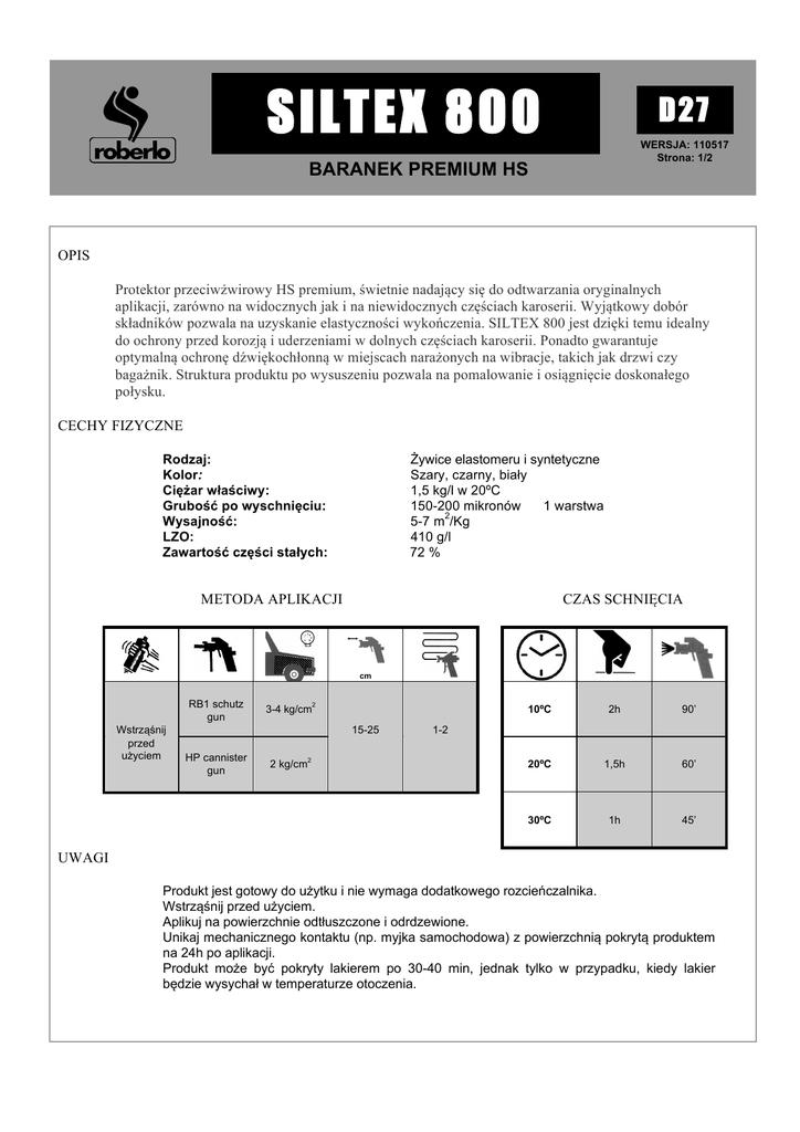 SILTEX 800 D27 WERSJA: 110517 Strona: 1/2 BARANEK PREMIUM HS OPIS Protektor przeciwżwirowy HS premium, świetnie nadający się do odtwarzania oryginalnych aplikacji, zarówno na widocznych jak i na niewidocznych częściach karoserii. Wyjątkowy dobór składników pozwala na uzyskanie elastyczności wykończenia. SILTEX 800 jest dzięki temu idealny do ochrony przed korozją i uderzeniami w dolnych częściach karoserii. Ponadto gwarantuje optymalną ochronę dźwiękochłonną w miejscach narażonych na wibracje, takich jak drzwi czy bagażnik. Struktura produktu po wysuszeniu pozwala na pomalowanie i osiągnięcie doskonałego połysku. CECHY FIZYCZNE Rodzaj: Kolor: Ciężar właściwy: Grubość po wyschnięciu: Wysajność: LZO: Zawartość części stałych: Żywice elastomeru i syntetyczne Szary, czarny, biały 1,5 kg/l w 20ºC 150-200 mikronów 1 warstwa 2 5-7 m /Kg 410 g/l 72 % METODA APLIKACJI CZAS SCHNIĘCIA cm RB1 schutz gun Wstrząśnij przed użyciem 2 3-4 kg/cm 15-25 HP cannister gun 2 kg/cm 2 10ºC 2h 90’ 20ºC 1,5h 60’ 30ºC 1h 45’ 1-2 UWAGI Produkt jest gotowy do użytku i nie wymaga dodatkowego rozcieńczalnika. Wstrząśnij przed użyciem. Aplikuj na powierzchnie odtłuszczone i odrdzewione. Unikaj mechanicznego kontaktu (np. myjka samochodowa) z powierzchnią pokrytą produktem na 24h po aplikacji. Produkt może być pokryty lakierem po 30-40 min, jednak tylko w przypadku, kiedy lakier będzie wysychał w temperaturze otoczenia. SILTEX 800 D27 BARANEK PREMIUM HS WERSJA: 110517 Strona: 2/2 CZYSZCZENIE SPRZĘTU Wyczyść przy użyciu rozpuszczalnika zanim produkt stwardnieje. BEZPIECZEŃSTWO Stosuj się do instrukcji zawartych na opakowaniu produktu. Po więcej informacji zapoznaj się z kartą bezpieczeństwa. PRZECHOWYWANIE Przechowywać w dobrze wentylowanym pomieszczeniu z dala od słońca w temperaturze od +5ºC do +30ºC. GWARANCJA W oryginalny, nieotwartym opakowaniu, jeden rok od daty produkcji. Po wszelkie techniczne informacje prosimy kontaktować się bezpośrednio z naszym Działem Technicznym lub poprzez dystrybutora. ROBERLO SA nie ponosi żadnej odpowiedzialności z powodu nieprawidłowego użytkowania produktu ROBERLO S.A. · Ctra. N-II, km 706,5 · 17457 RIUDELLOTS DE LA SELVA (Girona) SPAIN Tel. +34-972 478 060 · Fax +34-972 477 394 · e-mail: [email protected]