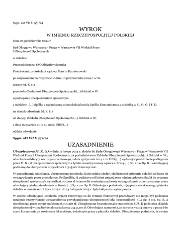 Sygn. akt VII U 551/14 WYROK W IMIENIU RZECZYPOSPOLITEJ POLSKIEJ Dnia 23 października 2014 r. Sąd Okręgowy Warszawa - Praga w Warszawie VII Wydział Pracy i Ubezpieczeń Społecznych w składzie: Przewodniczący: SSO Zbigniew Szczuka Protokolant: protokolant sądowy Marcin Kamionowski po rozpoznaniu na rozprawie w dniu 10 października 2014 r. w W. sprawy M. K. (1) przeciwko Zakładowi Ubezpieczeń Społecznych(...)Oddział w W. o podleganie ubezpieczeniom społecznym z udziałem (...) Spółka z ograniczoną odpowiedzialnością Spółka Komandytowa z siedzibą w S., M. O. i T. D. na skutek odwołania M. K. (1) od decyzji Zakładu Ubezpieczeń Społecznych (...) Oddział w W. z dnia 15 stycznia 2014 r., znak: UBS/(...) oddala odwołanie. Sygn. akt VII U 551/14 UZASADNIENIE Ubezpieczona M. K. (1) w dniu 11 lutego 2014 r. złożyła do Sądu Okręgowego Warszawa - Praga w Warszawie VII Wydział Pracy i Ubezpieczeń Społecznych, za pośrednictwem Zakładu Ubezpieczeń Społecznych(...) Oddział w W., odwołanie od decyzji ww. organu rentowego, z dnia 15 stycznia 2014 r. nr UBS/(...) wydanej w przedmiocie podlegania przez M. K. (1) ubezpieczeniom społecznym z tytułu zawartej umowy o pracę z firmą (...) Sp. z o.o. Sp. K. i określającej podstawę do ubezpieczeń w wysokości 2.345,00 zł miesięcznie. W uzasadnieniu odwołania, ubezpieczona podniosła, iż nie miała wiedzy, okoliczności opłacania składek od kwot jej wynagrodzenia przez pracodawcę. Podkreśliła, iż podstawa od której pracodawca winien opłacać składki do systemu ubezpieczeń społecznych wynosiła 6.000,00 zł i stanowiła comiesięczną kwotę wynagrodzenia otrzymywanego przez odwołującą tytułu zatrudnienia w firmie (...) Sp. z o.o. Sp. K. Odwołująca podniosła, iż jej praca u wskazanego płatnika składek w okresie od 17 lipca 2013 r. do 13 listopada 2013 r. była faktycznie wykonywana. W ocenie odwołującej, ustalenia organu rentowego co do sytuacji finansowej pracodawcy nie mogą być podstawą ustalenia rzeczywistego wynagrodzenia przysługującego ubezpieczonej jako pracownikowi (...) Sp. z o.o. Sp. K, a określonego przez strony na kwotę 6.000,00 zł. Ubezpieczona kwestionowała stanowisko ZUS, iż podstawa składek ubezpieczonej winna być ustalona na kwotę 2.345,00 zł. Odwołująca zaznaczyła, że zawarła ważną umowę o pracę i do czasu korzystania ze zwolnienia lekarskiego, świadczyła pracę u płatnika składek. Ubezpieczona podniosła, że swoim postępowaniem w okresie zatrudnienia u płatnika składek nie naruszyła jakichkolwiek zasad współżycia społecznego (odwołanie k. 2-6 a.s). Zakład Ubezpieczeń Społecznych (...) Oddział w W. w odpowiedzi na odwołanie, złożonej do tutejszego Sądu Okręgowego w dniu 12 marca 2014r., wniósł o oddalenie odwołania. W uzasadnieniu odpowiedzi na odwołanie organ rentowy wskazał, że wysokość wynagrodzenia odwołującej od lipca 2013 r. została ustalona w celu uzyskania wysokich świadczeń przysługujących z ubezpieczenia chorobowego. Organ rentowy podniósł, iż z dokumentacji kontroli przeprowadzonej u płatnika składek, wynikało, iż pracodawcy nie było stać na zatrudnienie pracownika za wynagrodzeniem w wysokości 6.000,00 zł miesięcznie. Organ rentowy podkreślił, iż pozostali pracownicy płatnika (...) Sp. z o.o. Sp. K, zgłoszeni zostali do ubezpieczeń społecznych od podstawy wynagrodzenia ustalonej na kwotę 2.345,00 zł. Ponadto organ rentowy zaznaczył, iż spółka pomimo krótkiej działalności, nie opłaciła składek na ubezpieczenie społeczne i ubezpieczenie zdrowotne za pracowników. Organ rentowy wskazał, iż obecnie jedynie M. K. (1) jest zgłoszona do ubezpieczeń społecznych. Na miejsce odwołującej, pracodawca nie zatrudnił nowego pracownika. Mając na uwadze powyższe, organ rentowy wskazał, iż odwołanie ubezpieczonej winno podlegać oddaleniu (odpowiedź na odwołanie k. 27-29) Postanowieniem wydanym w dniu 12 maja 2014 r. Sąd Okręgowy Warszawa-Praga w Warszawie wezwał do udziału w sprawie w charakterze zainteresowanego (...) Sp. z o.o. Sp. K. z siedziba w N. (postanowienie k. 41 a.s) Sąd Okręgowy Warszawa-Praga w Warszawie na podstawie zgromadzonego materiału dowodowego ustalił następujący stan faktyczny: Płatnik składek prowadzący działalność gospodarczą pod nazwą (...) Sp. z o.o. Sp. K z siedzibą w S. przy ul. (...), (kod pocztowy: (...)-(...) N.), wpisaną do rejestru przedsiębiorców pod numerem KRS (...), REGON (...) w dniu 17 lipca 2013 r. zawarł umowę o pracę na czas nieokreślony M. K. (1), na stanowisku Kierownika Działu Obsługi Sprzedaży w wymiarze pełnego etatu, za wynagrodzeniem 6.000,00 zł. (vide: k.54-48 ar.). Następnie płatnik składek zgłosił M. K. do ubezpieczenia społecznego od dnia 2 sierpnia 2013 r. Od dnia 13 listopada 2013 r. ubezpieczona przebywała na zwolnieniu lekarskim z tytułu ciążyć (okoliczność bezsporna). W dniu 16 grudnia 2013 r. organ rentowy wszczął postępowanie wyjaśniające dotyczące zgłoszenia do ubezpieczeń (...) M. K. (1). W toku tego postępowania, organ rentowy ustalił, iż firma (...) Sp. z o.o. Sp. K. zajmuje się działalnością związaną z reklamą, drukiem oraz sprzedażą miejsc reklamowych. Na podstawie deklaracji VAT-7 zus ustalił, iż za okres od marca 2013 r. do listopada 2013 r. spółka prowadzi działalność usługową w małym zakresie i nie było jej stać na zatrudnienie pracownika – M. K. (1) za wynagrodzeniem miesięcznym w wysokości 6.000,00 zł, a jedynie za wynagrodzeniem 2.345,00 zł – jak pozostałych pracowników firmy Według ustaleń organu rentowego, w dniu 4 grudnia 2013 r. wyrejestrowano pracowników spółki, a do chwili obecnej jedynie M. K. (1) jest zgłoszona do ubezpieczeń społecznych. ZUS na podstawie przeprowadzonej kontroli płatnika składek, ustalił, iż na miejsce odwołującej nie zatrudniono innego pracownika. Obowiązki odwołującej, korz