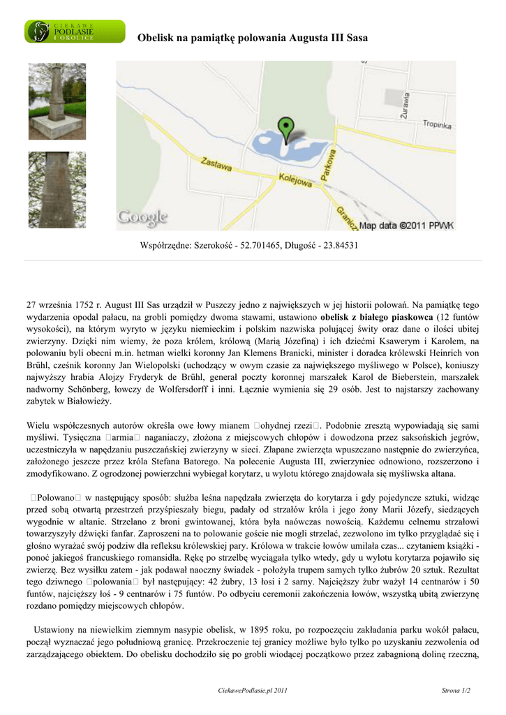 Obelisk na pamiątkę polowania Augusta III Sasa Współrzędne: Szerokość - 52.701465, Długość - 23.84531 27 września 1752 r. August III Sas urządził w Puszczy jedno z największych w jej historii polowań. Na pamiątkę tego wydarzenia opodal pałacu, na grobli pomiędzy dwoma stawami, ustawiono obelisk z białego piaskowca (12 funtów wysokości), na którym wyryto w języku niemieckim i polskim nazwiska polującej świty oraz dane o ilości ubitej zwierzyny. Dzięki nim wiemy, że poza królem, królową (Marią Józefiną) i ich dziećmi Ksawerym i Karolem, na polowaniu byli obecni m.in. hetman wielki koronny Jan Klemens Branicki, minister i doradca królewski Heinrich von Brühl, cześnik koronny Jan Wielopolski (uchodzący w owym czasie za największego myśliwego w Polsce), koniuszy najwyższy hrabia Alojzy Fryderyk de Brühl, generał poczty koronnej marszałek Karol de Bieberstein, marszałek nadworny Schönberg, łowczy de Wolfersdorff i inni. Łącznie wymienia się 29 osób. Jest to najstarszy zachowany zabytek w Białowieży. Wielu współczesnych autorów określa owe łowy mianem ohydnej rzezi . Podobnie zresztą wypowiadają się sami myśliwi. Tysięczna armia naganiaczy, złożona z miejscowych chłopów i dowodzona przez saksońskich jegrów, uczestniczyła w napędzaniu puszczańskiej zwierzyny w sieci. Złapane zwierzęta wpuszczano następnie do zwierzyńca, założonego jeszcze przez króla Stefana Batorego. Na polecenie Augusta III, zwierzyniec odnowiono, rozszerzono i zmodyfikowano. Z ogrodzonej powierzchni wybiegał korytarz, u wylotu którego znajdowała się myśliwska altana. Polowano w następujący sposób: służba leśna napędzała zwierzęta do korytarza i gdy pojedyncze sztuki, widząc przed sobą otwartą przestrzeń przyśpieszały biegu, padały od strzałów króla i jego żony Marii Józefy, siedzących wygodnie w altanie. Strzelano z broni gwintowanej, która była naówczas nowością. Każdemu celnemu strzałowi towarzyszyły dźwięki fanfar. Zaproszeni na to polowanie goście nie mogli strzelać, zezwolono im tylko przyglądać się i głośno wyrażać swój podziw dla refleksu królewskiej pary. Królowa w trakcie łowów umilała czas... czytaniem książki ponoć jakiegoś francuskiego romansidła. Rękę po strzelbę wyciągała tylko wtedy, gdy u wylotu korytarza pojawiło się zwierzę. Bez wysiłku zatem - jak podawał naoczny świadek - położyła trupem samych tylko żubrów 20 sztuk. Rezultat tego dziwnego polowania był następujący: 42 żubry, 13 łosi i 2 sarny. Najcięższy żubr ważył 14 centnarów i 50 funtów, najcięższy łoś - 9 centnarów i 75 funtów. Po odbyciu ceremonii zakończenia łowów, wszystką ubitą zwierzynę rozdano pomiędzy miejscowych chłopów. Ustawiony na niewielkim ziemnym nasypie obelisk, w 1895 roku, po rozpoczęciu zakładania parku wokół pałacu, począł wyznaczać jego południową granicę. Przekroczenie tej granicy możliwe było tylko po uzyskaniu zezwolenia od zarządzającego obiektem. Do obelisku dochodziło się po grobli wiodącej początkowo przez zabagnioną dolinę rzeczną, CiekawePodlasie.pl 2011 Strona 1/2 Obelisk na pamiątkę polowania Augusta III Sasa a później przez stawy, powstałe poprzez wybranie gleby, którą przeznaczono na kwietniki zakładane przy pałacu. W czasach carskich pomnik był nadzwyczaj pieczołowicie chroniony. Zimą nakładano nań specjalny pokrowiec, zabezpieczający przed niekorzystnym wpływem czynników atmosferycznych. Latem, dla ozdoby, urządzano przy nim kwietnik. W sierpniu 1915 roku obelisk został wywieziony przez wojsko rosyjskie w głąb Rosji. W 1921 roku, w drodze rewindykacji, powrócił do Polski. Rozłamany był na dwie części i mocno poobijany. Przez wiele lat przechowywano go w Warszawie. Do Białowieży przywieziono dopiero w 1938 roku, po dokonaniu renowacji. W okresie powojennym, a dokładnie 27 kwietnia 1973 roku, Wojewódzki Konserwator Zabytków w Białymstoku wpisał pomnik na listę obiektów zabytkowych. Ciekawe informacje o pamiętnym polowaniu zaczerpnięto ze strony Encyklopedia- Puszcza Białowieska. CiekawePodlasie.pl 2011 Strona 2/2