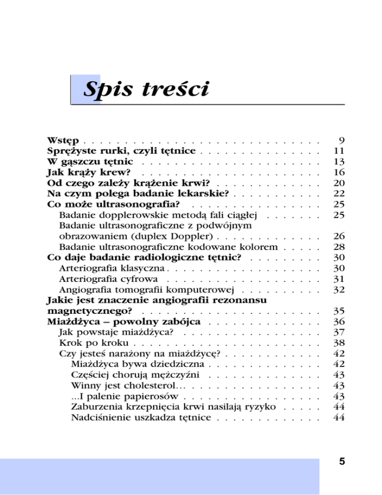 Spis treści Wstęp . . . . . . . . . . . . . . . . . . . . . . . . Sprężyste rurki, czyli tętnice . . . . . . . . . . W gąszczu tętnic . . . . . . . . . . . . . . . . . Jak krąży krew? . . . . . . . . . . . . . . . . . Od czego zależy krążenie krwi? . . . . . . . . Na czym polega badanie lekarskie? . . . . . . Co może ultrasonografia? . . . . . . . . . . . Badanie dopplerowskie metodą fali ciągłej . . Badanie ultrasonograficzne z podwójnym obrazowaniem (duplex Doppler) . . . . . . . . Badanie ultrasonograficzne kodowane kolorem Co daje badanie radiologiczne tętnic? . . . . Arteriografia klasyczna . . . . . . . . . . . . . . Arteriografia cyfrowa . . . . . . . . . . . . . . Angiografia tomografii komputerowej . . . . . Jakie jest znaczenie angiografii rezonansu magnetycznego? . . . . . . . . . . . . . . . . . Miażdżyca – powolny zabójca . . . . . . . . . Jak powstaje miażdżyca? . . . . . . . . . . . . Krok po kroku . . . . . . . . . . . . . . . . . . Czy jesteś narażony na miażdżycę? . . . . . . . Miażdżyca bywa dziedziczna . . . . . . . . . Częściej chorują mężczyźni . . . . . . . . . Winny jest cholesterol… . . . . . . . . . . . ...I palenie papierosów . . . . . . . . . . . . Zaburzenia krzepnięcia krwi nasilają ryzyko Nadciśnienie uszkadza tętnice . . . . . . . . . . . . . . . . . . . . . . . . . . . . . . . . . . . . . . . . . . . . . . . . 9 11 13 16 20 22 25 25 . . . . . . . . . . . . . . . . . . . . . . . . . . . . . . 26 28 30 30 31 32 . . . . . . . . . . . . . . . . . . . . . . . . . . . . . . . . . . . . . . . . . . . . . . . . . . . . . . . 35 36 37 38 42 42 43 43 43 44 44 Otyłość jest niebezpieczna . . . . . . . . . . . . Mała aktywność fizyczna dużo szkodzi . . . . . Jak uchronić się przed miażdżycą? . . . . . . . . . Pod okiem lekarza . . . . . . . . . . . . . . . . . Bez papierosa . . . . . . . . . . . . . . . . . . . Dieta czyni cuda . . . . . . . . . . . . . . . . . Waga pod kontrolą . . . . . . . . . . . . . . . . Więcej aktywności fizycznej . . . . . . . . . . . Dbaj o sen . . . . . . . . . . . . . . . . . . . . . Trzymaj się ciepło . . . . . . . . . . . . . . . . . Optymiści żyją dłużej . . . . . . . . . . . . . . . Cudów nie ma, czyli o leczeniu miażdżycy . . . . Ufaj tylko lekarzowi . . . . . . . . . . . . . . . . . Lekarstwa . . . . . . . . . . . . . . . . . . . . . . . Do wód! Leczenie w sanatorium . . . . . . . . . . Gdy inne choroby idą w parze . . . . . . . . . . . Gdy konieczna jest operacja . . . . . . . . . . . . . Decyzja o operacji . . . . . . . . . . . . . . . . Przygotowanie do operacji . . . . . . . . . . . . Rodzaje znieczulenia . . . . . . . . . . . . . . . Po operacji . . . . . . . . . . . . . . . . . . . . . Operacje tradycyjne . . . . . . . . . . . . . . . . Udrożnienie tętnicy . . . . . . . . . . . . . . Pomostowanie tętnic . . . . . . . . . . . . . . Wycięcie odcinka tętnicy . . . . . . . . . . . Operacja tętniaków . . . . . . . . . . . . . . Sympatektomia . . . . . . . . . . . . . . . . . Zamiast skalpela, czyli o przezskórnych zabiegach wewnątrznaczyniowych . . . . . . . . . . . . . . . Przygotowanie do zabiegu . . . . . . . . . . . . Zespół i sala zabiegowa . . . . . . . . . . . . . . Po zabiegu . . . . . . . . . . . . . . . . . . . . . Jakie są zabiegi wewnątrznaczyniowe? . . . . . Angioplastyka balonowa . . . . . . . . . . . . Stenty i stent-grafty – podpórki tętnic . . . . Zwężenia i niedrożności tętnic szyjnych . . . . . . Zespół podkradania tętnicy podobojczykowej . . . . . . . . . . . . . . . . . . . . . . . . . . . . . . . . . . . . . . . . . . . . . . . . . . . . . . . . . 44 45 45 46 46 47 52 54 57 57 58 58 59 60 64 65 66 66 67 67 68 69 70 71 73 75 76 . . . . . . . . . . . . . . . . . . 77 78 78 79 80 80 81 85 89 Zwężenia i niedrożności tętnic kręgowych . . . . . . Niedokrwienie jelit . . . . . . . . . . . . . . . . . . . Niedokrwienie nerek . . . . . . . . . . . . . . . . . . Przewlekłe niedokrwienie kończyn dolnych . . . . . Objawy . . . . . . . . . . . . . . . . . . . . . . . . Bladość i oziębienie stopy . . . . . . . . . . . . Chromanie przestankowe . . . . . . . . . . . . . Bóle spoczynkowe . . . . . . . . . . . . . . . . . Zmiany martwicze . . . . . . . . . . . . . . . . . Postacie miażdżycy tętnic kończyn dolnych. . . . . Stopnie zaawansowania niedokrwienia . . . . . . . Na czym polega leczenie? . . . . . . . . . . . . . . Więcej ruchu . . . . . . . . . . . . . . . . . . . . Trening na bieżni ruchomej . . . . . . . . . . . . Leczenie sanatoryjne . . . . . . . . . . . . . . . Jak dbać o nogi? . . . . . . . . . . . . . . . . . . Jak powinny odpoczywać nogi? . . . . . . . . . Kiedy wskazana jest operacja? . . . . . . . . . . Kiedy konieczna jest amputacja nogi? . . . . . . Leczenie chirurgiczne . . . . . . . . . . . . . . . Jakie są wyniki operacji tętnic kończyn dolnych? Miażdżycę i cukrzycę naprawdę da się leczyć! . . . Na dobrej stopie – stopa cukrzycowa . . . . . . Jak zapobiec powstaniu stopy cukrzycowej? . . Tętniaki . . . . . . . . . . . . . . . . . . . . . . . . . . Tętniak prawdziwy . . . . . . . . . . . . . . . . . . . Tętniak aorty wstępującej i aorty piersiowej . . . . Tętniak aorty brzusznej . . . . . . . . . . . . . . . Tętniaki innych tętnic . . . . . . . . . . . . . . . . Tętniak rzekomy . . . . . . . . . . . . . . . . . . . . . Tętniak rozwarstwiający aorty . . . . . . . . . . . . . Przetoki tętniczo-żylne . . . . . . . . . . . . . . . . . Wadliwe naczynia . . . . . . . . . . . . . . . . . . . . Choroba Buergera . . . . . . . . . . . . . . . . . . . . Choroba Takayashu . . . . . . . . . . . . . . . . . . . Nerwice naczyniowe . . . . . . . . . . . . . . . . . . . Choroba Raynauda . . . . . . . . . . . . . . . . . . . . . . . . . . . . . . . . . . . . . . . . . . . . . . . . . . . . . . . . 91 92 93 94 95 95 96 97 99 100 102 103 103 107 109 109 110 111 113 114 115 116 116 118 11
