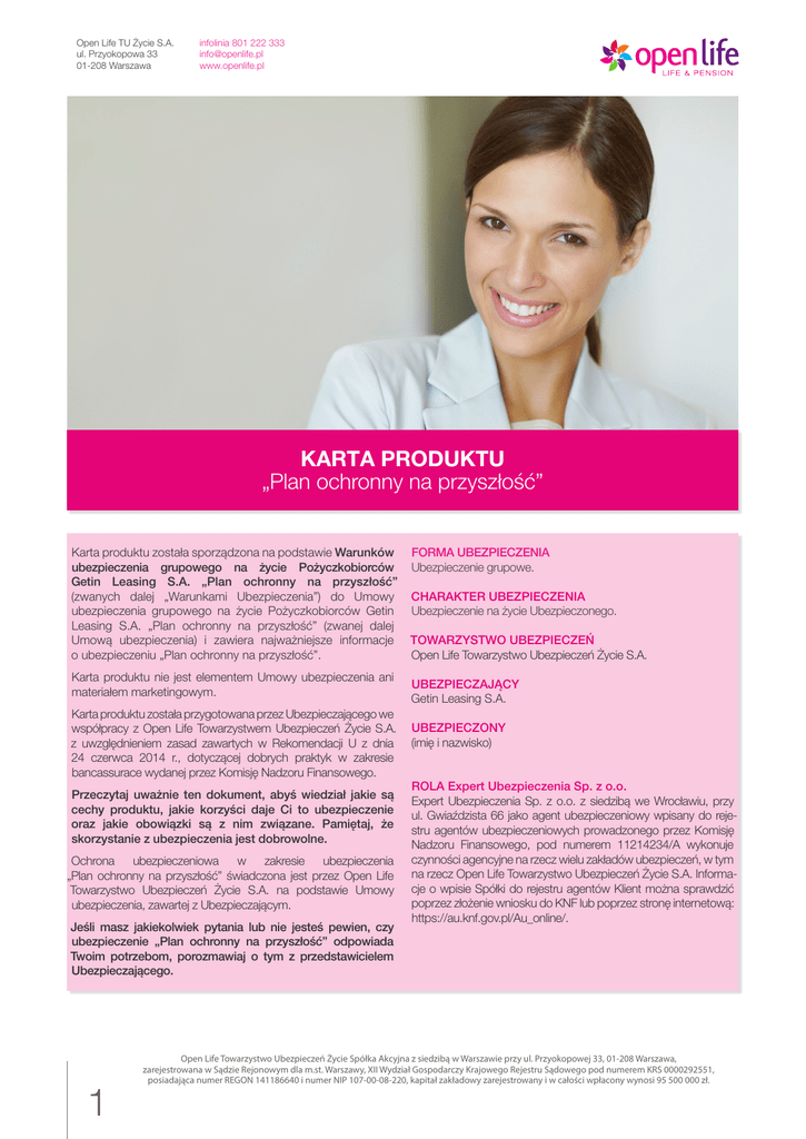 Open Life TU Życie S.A. ul. Przyokopowa 33 01-208 Warszawa infolinia 801 222 333 [email protected] www.openlife.pl KARTA PRODUKTU „Plan ochronny na przyszłość” Karta produktu została sporządzona na podstawie Warunków ubezpieczenia grupowego na życie Pożyczkobiorców Getin Leasing S.A. „Plan ochronny na przyszłość” (zwanych dalej „Warunkami Ubezpieczenia”) do Umowy ubezpieczenia grupowego na życie Pożyczkobiorców Getin Leasing S.A. „Plan ochronny na przyszłość” (zwanej dalej Umową ubezpieczenia) i zawiera najważniejsze informacje o ubezpieczeniu „Plan ochronny na przyszłość”. Karta produktu nie jest elementem Umowy ubezpieczenia ani materiałem marketingowym. Karta produktu została przygotowana przez Ubezpieczającego we współpracy z Open Life Towarzystwem Ubezpieczeń Życie S.A. z uwzględnieniem zasad zawartych w Rekomendacji U z dnia 24 czerwca 2014 r., dotyczącej dobrych praktyk w zakresie bancassurace wydanej przez Komisję Nadzoru Finansowego. Przeczytaj uważnie ten dokument, abyś wiedział jakie są cechy produktu, jakie korzyści daje Ci to ubezpieczenie oraz jakie obowiązki są z nim związane. Pamiętaj, że skorzystanie z ubezpieczenia jest dobrowolne. Ochrona ubezpieczeniowa w zakresie ubezpieczenia „Plan ochronny na przyszłość” świadczona jest przez Open Life Towarzystwo Ubezpieczeń Życie S.A. na podstawie Umowy ubezpieczenia, zawartej z Ubezpieczającym. Jeśli masz jakiekolwiek pytania lub nie jesteś pewien, czy ubezpieczenie „Plan ochronny na przyszłość” odpowiada Twoim potrzebom, porozmawiaj o tym z przedstawicielem Ubezpieczającego. 1 FORMA UBEZPIECZENIA Ubezpieczenie grupowe. CHARAKTER UBEZPIECZENIA Ubezpieczenie na życie Ubezpieczonego. TOWARZYSTWO UBEZPIECZEŃ Open Life Towarzystwo Ubezpieczeń Życie S.A. UBEZPIECZAJĄCY Getin Leasing S.A. UBEZPIECZONY (imię i nazwisko) ROLA Expert Ubezpieczenia Sp. z o.o. Expert Ubezpieczenia Sp. z o.o. z siedzibą we Wrocławiu, przy ul. Gwiaździsta 66 jako agent ubezpieczeniowy wpisany do rejestru agentów ubezpieczeniowych prowadzonego przez Komisję Nadzoru Finansowego, pod numerem 11214234/A wykonuje czynności agencyjne na rzecz wielu zakładów ubezpieczeń, w tym na rzecz Open Life Towarzystwo Ubezpieczeń Życie S.A. Informacje o wpisie Spółki do rejestru agentów Klient można sprawdzić poprzez złożenie wniosku do KNF lub poprzez stronę internetową: https://au.knf.gov.pl/Au_online/. Open Life Towarzystwo Ubezpieczeń Życie Spółka Akcyjna z siedzibą w Warszawie przy ul. Przyokopowej 33, 01-208 Warszawa, zarejestrowana w Sądzie Rejonowym dla m.st. Warszawy, XII Wydział Gospodarczy Krajowego Rejestru Sądowego pod numerem KRS 0000292551, posiadająca numer REGON 141186640 i numer NIP 107-00-08-220, kapitał zakładowy zarejestrowany i w całości wpłacony wynosi 95 500 000 zł. Open Life TU Życie S.A. ul. Przyokopowa 33 01-208 Warszawa infolinia 801 222 333 [email protected] www.openlife.pl PODSTAWOWE INFORMACJE O UBEZPIECZENIU Zakres ochrony ubezpieczeniowej: Śmierć Ubezpieczonego w Okresie ubezpieczenia. Warunki objęcia ochroną ubezpieczeniową: 1. Ochroną ubezpieczeniową może zostać objęty Pożyczkobiorca, który: 1) na dzień złożenia podpisanej Deklaracji zgody ukończył 18. rok życia i nie ukończy 67. roku życia w dniu przewidywanego zakończenia Okresu ubezpieczenia, oraz 2) zawarł Umowę pożyczki, gdzie kwota Pożyczki z dnia zawarcia Umowy pożyczki, wskazana w Umowie pożyczki nie przekracza 100 000 zł z tytułu jednej Umowy pożyczki, a w przypadku gdy Pożyczkobiorca posiada zawarte inne Umowy pożyczki, w związku z którymi został objęty ochroną ubezpieczeniową na podstawie niniejszych Warunków Ubezpieczenia, łączna kwota tych Pożyczek, wskazanych w poszczególnych Umowach pożyczki na dzień ich zawarcia nie przekracza 200 000 zł, oraz 3) udzielił odpowiedzi „NIE” na wszystkie pytania zawarte w ankiecie dotyczącej stanu zdrowia w Deklaracji zgody, z zastrzeżeniem ust. 3. 2. Warunkiem objęcia ochroną ubezpieczeniową jest: 1) złożenie przez Pożyczkobiorcę podpisanej Deklaracji zgody; 2) zgłoszenie Pożyczkobiorcy do Towarzystwa Ubezpieczeń przez Ubezpieczającego w celu objęcia go ochroną ubezpieczeniową, z zastrzeżeniem postanowień ust. 3. 3. W przypadku, gdy Pożyczkobiorca nie spełnia któregokolwiek z warunków objęcia ochrona ubezpieczeniową, wskazanych w ust. 1, objęcie ochroną ubezpieczeniową Pożyczkobiorcy możliwe jest wyłącznie po uzyskaniu indywidualnej zgody Towarzystwa Ubezpieczeń, z uwzględnieniem dodatkowo postanowień określonych w ust. 4 - 5. 4. W przypadku, o którym mowa w ust. 3, Pożyczkobiorca zobligowany jest dodatkowo do: 1) dostarczenia wypełnionej oferty wstępnej i kwestionariusza medycznego; 2) wykonania badań lekarskich wskazanych i sfinansowanych przez Towarzystwo Ubezpieczeń lub dostarczenia dodatkowej dokumentacji - w uzasadnionych przypadkach. 5. Ochrona ubezpieczeniowa w stosunku do Pożyczkobiorcy, o którym mowa w ust. 3, rozpoczyna się w dniu uruchomienia Pożyczki, jednak nie wcześniej niż w dniu następującym po dniu akceptacji przez Towarzystwo Ubezpieczeń dokumentów, o których mowa w ust. 4. 6. Pożyczkobiorca może zostać objęty ochroną ubezpieczeniową na podstawie Warunków Ubezpieczenia w związku z więcej niż jedną Umową pożyczki na podstawie odrębnie złożonych Deklaracji zgody. 7. W ramach jednej Umowy pożyczki Deklarację zgody może złożyć jeden lub więcej Pożyczkobiorców pod warunkiem, że spełniają warunki o których mowa w ust. 1, z zastrzeżeniem dodatkowo postanowień ust. 3 - 5. W takim przypad- ku wymagane jest złożenie przez każdego z Pożyczkobiorców odrębnych Deklaracji zgody. Wyłączenia i ograniczenia odpowiedzialności Towarzystwa Ubezpieczeń: 1. Towarzystwo Ubezpieczeń nie ponosi odpowiedzialności z tytułu śmierci Ubezpieczonego, która zaistniała w wyniku: 1) samo