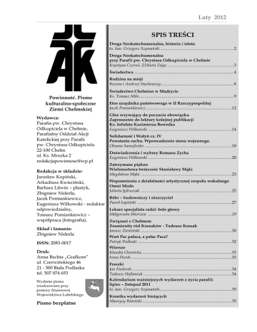 Luty 2012 SPIS TREŚCI Droga Neokatechumenalna, historia i istota ks. kan. Grzegorz Szymański ................................................................... 2 Droga Neokatechumenalna przy Parafii pw. Chrystusa Odkupiciela w Chełmie Krystyna Czernii, Elżbieta Zając ............................................................. 3 Świadectwa ............................................................................................ 4 Rodzina na misji Bożena i Andrzej Stachowscy ................................................................... 8 Powinność. Pismo kulturalno-społeczne Ziemi Chełmskiej Wydawca: Parafia pw. Chrystusa Odkupiciela w Chełmie, Parafialny Oddział Akcji Katolickiej przy Parafii pw. Chrystusa Odkupiciela 22-100 Chełm ul. Ks. Mrozka 2 [email protected] Redakcja w składzie: Jarosław Kopiński, Arkadiusz Kwieciński, Barbara Litwin – plastyk, Zbigniew Niderla, Jacek Pomiankiewicz, Eugeniusz Wilkowski - redaktor odpowiedzialny, Tomasz Pomiankiewicz – współpraca (fotografia). Skład i łamanie: Zbigniew Niderla ISSN: 2083-0017 Druk: Anna Bechta „Grafkom” ul. Czerwińskiego 46 21 - 500 Biała Podlaska tel. 507 074 653 Wydanie pisma zrealizowano przy pomocy finansowej Województwa Lubelskiego Pismo bezpłatne Świadectwo Chełmian w Madrycie Ks. Tomasz Milo ....................................................................................... 9 Etos urzędnika państwowego w II Rzeczypospolitej Jacek Pomiankiewicz ............................................................................... 12 Głos wzywający do poczucia obowiązku Zaproszenie do lektury kolejnej publikacji Ks. Infułata Kazimierza Bownika Eugeniusz Wilkowski ............................................................................. 14 Solidarność i Wołyń cz. IV Powstanie ruchu. Wprowadzenie stanu wojennego. Oksana Samojlenko ................................................................................ 18 Doświadczenia i wybory Romana Zycha Eugeniusz Wilkowski ............................................................................. 20 Zatrzymane piękno Wielonurtowa twórczość Stanisławy Mąki Magdalena Mąka ................................................................................... 23 Wspomnienia z działalności artystycznej zespołu wokalnego Omni Modo Jolanta Jędruszak ................................................................................... 25 Bóbr – budowniczy i niszczyciel Paweł Łapiński ....................................................................................... 27 Lekarz specjalista radzi: bole głowy Małgorzata Mierzwa ............................................................................. 29 Związani z Chełmem Znamienity ród Kossaków - Tadeusz Kossak Janusz Ziemiński ................................................................................... 30 Wart Pac pałaca, a pałac Paca? Patryk Podlaski ...................................................................................... 32 Wiersze Klaudia Chomicka ................................................................................... 33 Irena Florek ............................................................................................. 33 Fraszki Jan Fiedurek ............................................................................................ 34 Tadeusz Haftaniuk ................................................................................. 34 Kalendarium ważniejszych wydarzeń z życia parafii: lipiec – listopad 2011 ks. kan. Grzegorz Szymański .................................................................. 35 Kronika wydarzeń bieżących Maurycy Rateński .................................................................................. 35 Luty 2012 Powinność. Pismo kulturalno-społeczne Ziemi Chełmskiej Droga Neokatechumenalna, historia i istota ks. kan. Grzegorz Szymański D roga Neokatechumenalna jest charyzmatem w Kościele katolickim. Jest jednym z elementów duszpasterstwa parafialnego, duszpasterstwem ewangelizacyjnym, będącym integralną częścią struktury parafialnej; miejscem, gdzie dokonuje się stopniowe prowadzenie ludzi do braterskiej komunii i do wiary dojrzałej. Nazwa „Droga”, a nie ruch, wywodzi się z najstarszego określenia chrześcijaństwa. W Dziejach Apostolskich czytamy, jak Szaweł udaje się do Damaszku, ”aby mógł uwięzić i przyprowadzić do Jerozolimy mężczyzn i kobiety, zwolenników tej drogi, jeśliby jakichś znalazł”(Dz. 9,2). Nawiązuje ona do katechumenatu istniejącego w pierwszych wiekach Kościoła. Katechumeni w Kościele pierwotnym, to osoby, które na trwającej nieraz kilka lat drodze, odkrywały Kościół Chrystusa i przyjmowały chrzest. Kościół wychodził im naprzeciw, przyjmował ich, były to więc spotkania. Wielu dzisiejszych neokatechumenów ochrzczonych w dzieciństwie, długo czekało na egzystencjalne spotkanie z wiarą, Kościołem, Chrystusem, o czym świadczą załączone ich relacje. Początki Drogi neokatechumenalnej są związane z osobą hiszpańskiego malarza Francisco (Kiko) Arguello, wywodzącego się z zamożnej rodziny, który po swoim nawróceniu, chcąc być blisko Chrystusa Zmartwychwstałego, obecnego w ubogich, zamieszkał wśród nich i żył tam jak ubogi wśród ubogich, opierając swoje życie na Ewangelii i czytając Biblię. Było to w barakach „Palomeras Altas”, na przedmieściach Madrytu w 1964 r., niemal równocześnie z obradami Soboru Watykańskiego II. Wśród tych ludzi, którzy stopniowo gromadzili się wokół niego, słuchając i zadając mu pytania w sprawie wiary, stała się widoczna więź, która łączyła nawet nieprzyjaciół. Pod wpływem miłości Chrystusa do każdego człowieka, nawet do takich jak oni, zmieniało się ich życie. Po pewnym czasie do Kiko dołączyła Carmen Hernandez, która zadziwiła szczerością tych ludzi i jednością, jaka się tworzyła. Do tej grupy inicjat